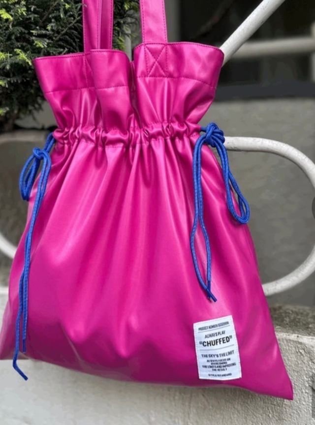2WAY!配色が◎ フェイクレザーの巾着トートバッグ フェイクレザーとオリジナルネームが可愛いトートバッグです。 サイドのスピンドルコードを引くと巾着デザインに! ギャザーを寄せない状態で、A4サイズ収納可能な大きさです。 スピンドルコードは配色のビビットカラーが◎ そのまま垂らしても、くるっと結んでも、リボン結びでも◎ オールシーズン、デイリーに使える万能バッグです。 サイズ・容量 幅:37cm、高さ:39.5cm、持ち手:61.5cm、重量:160g
