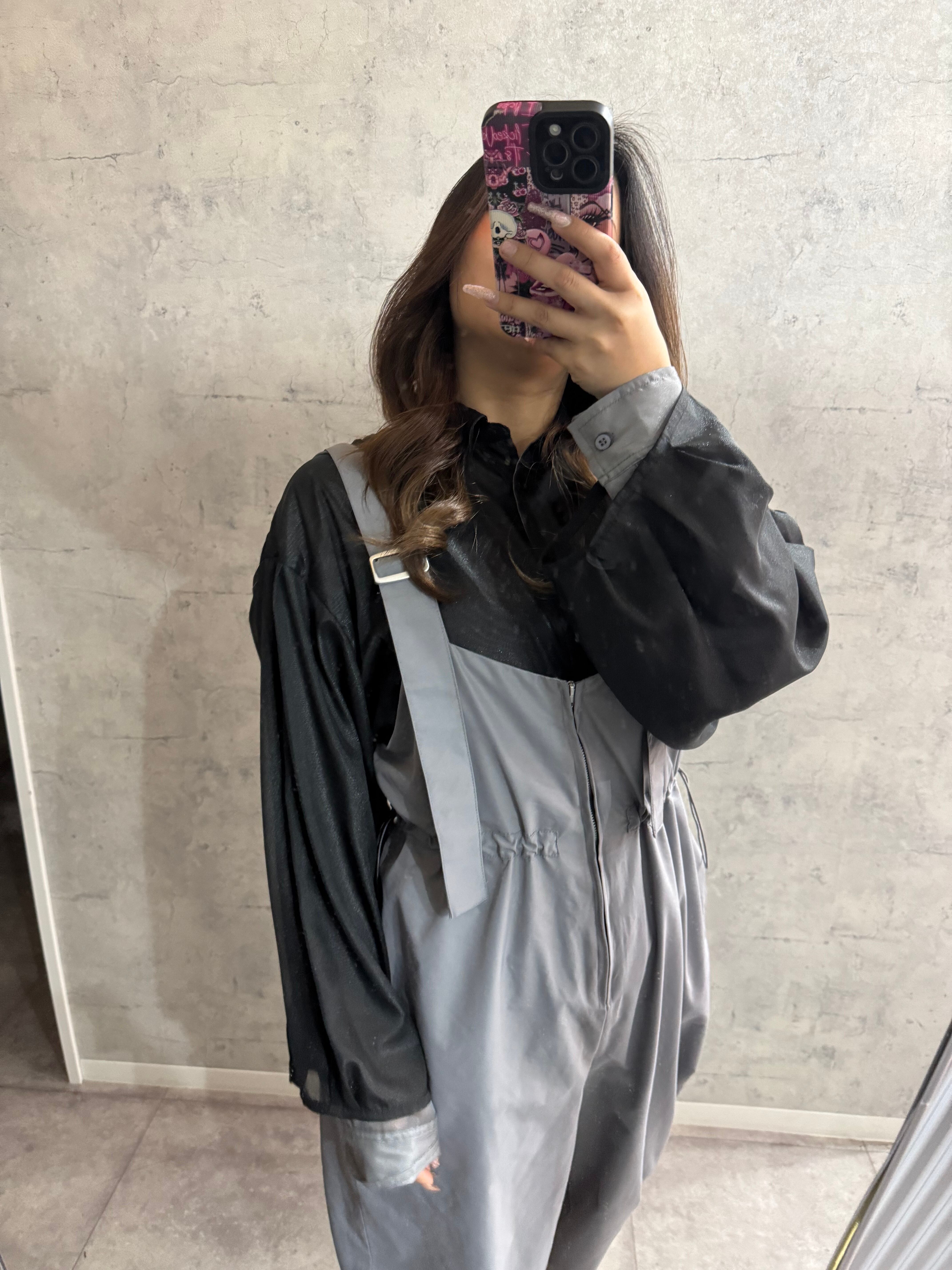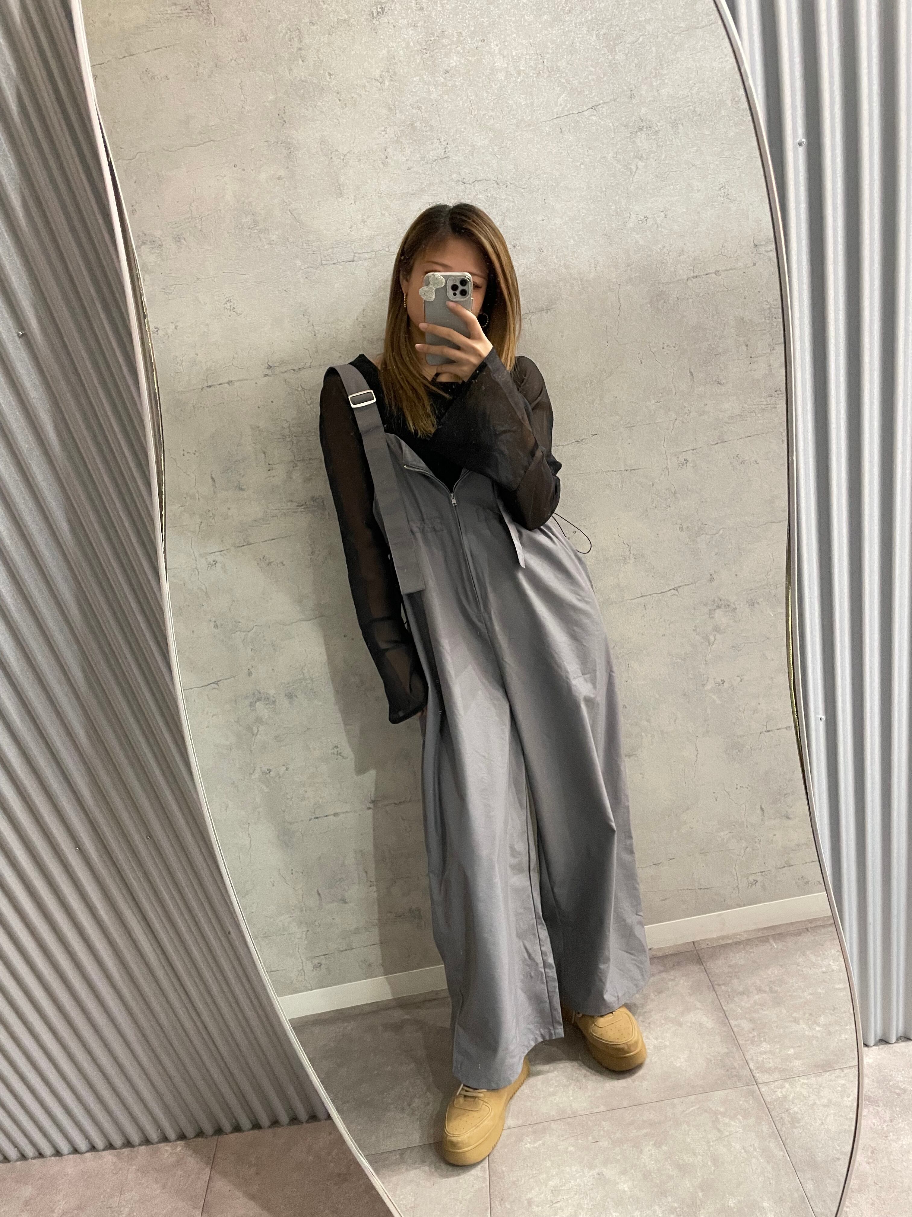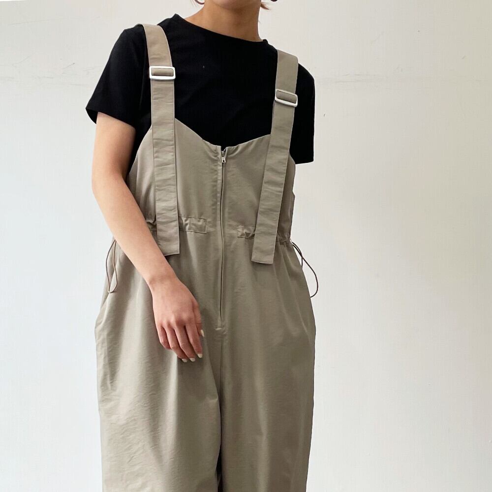 ウエストのドロストと前のファスナー部分がワンポイントのオールインワン 【design point】 ・ナイロン生地で軽い着心地のオールインワン・ウエストのドロスト、前のファスナー、肩紐が垂れているなど、デザインポイントが豊富!!