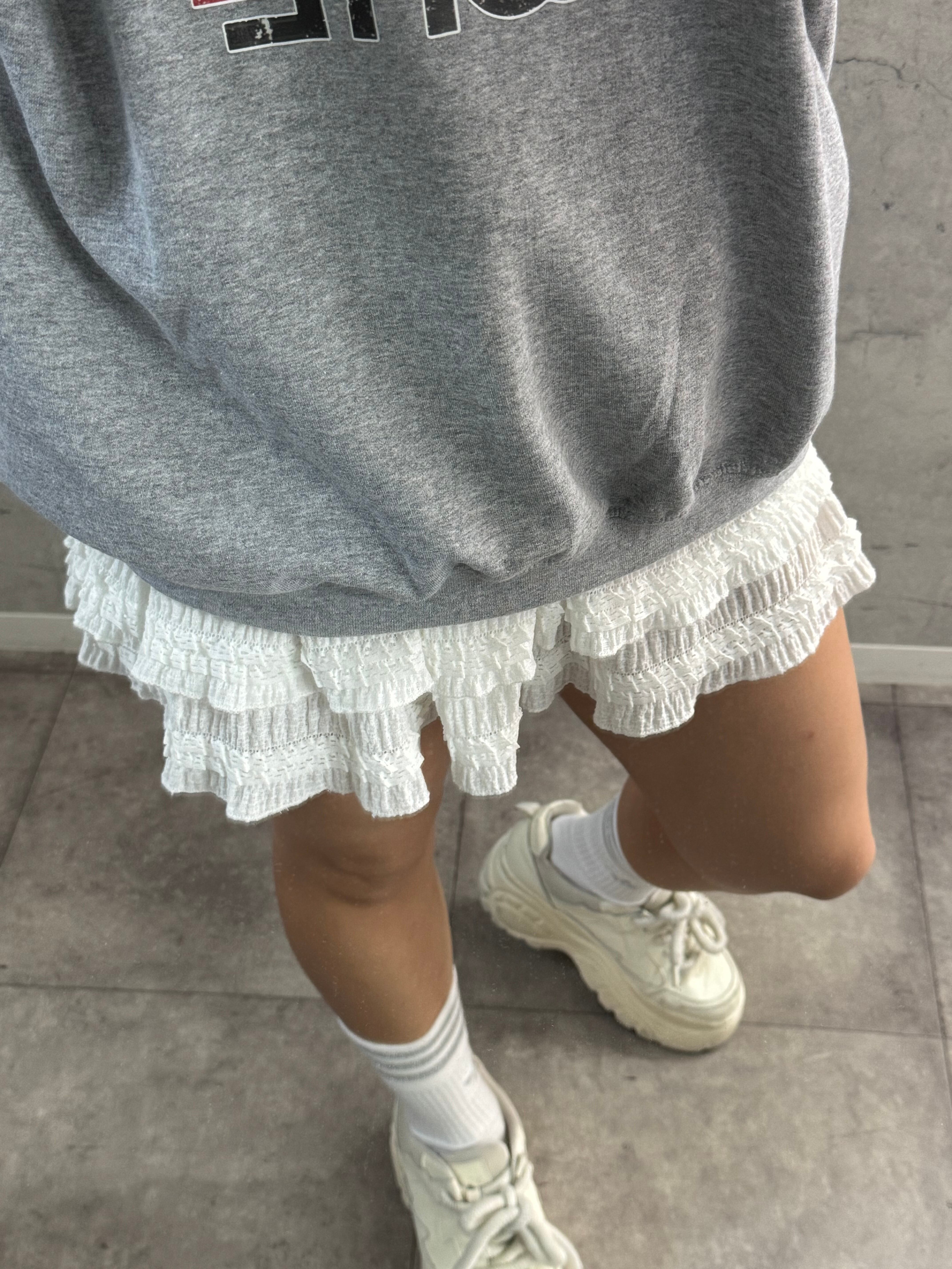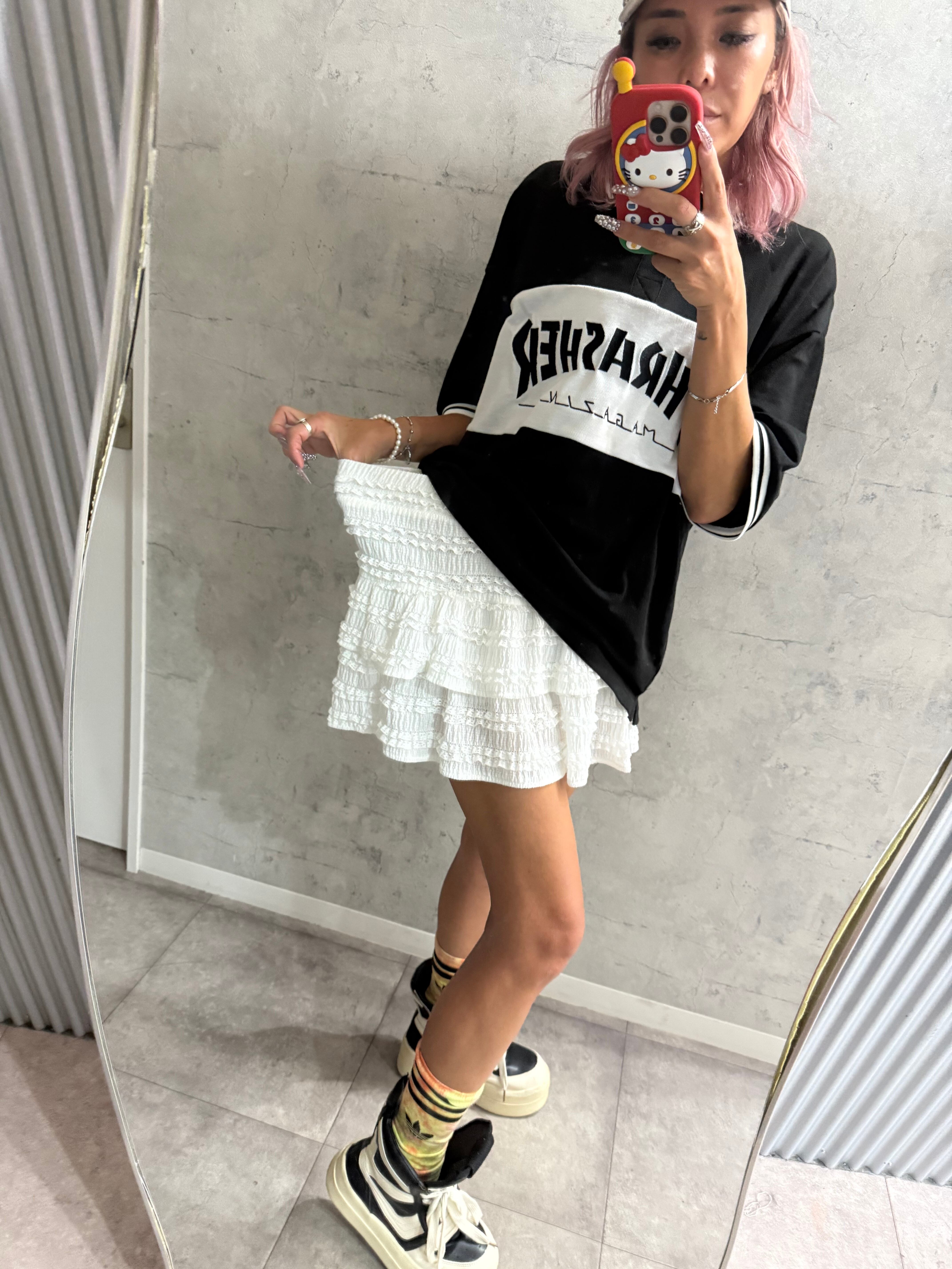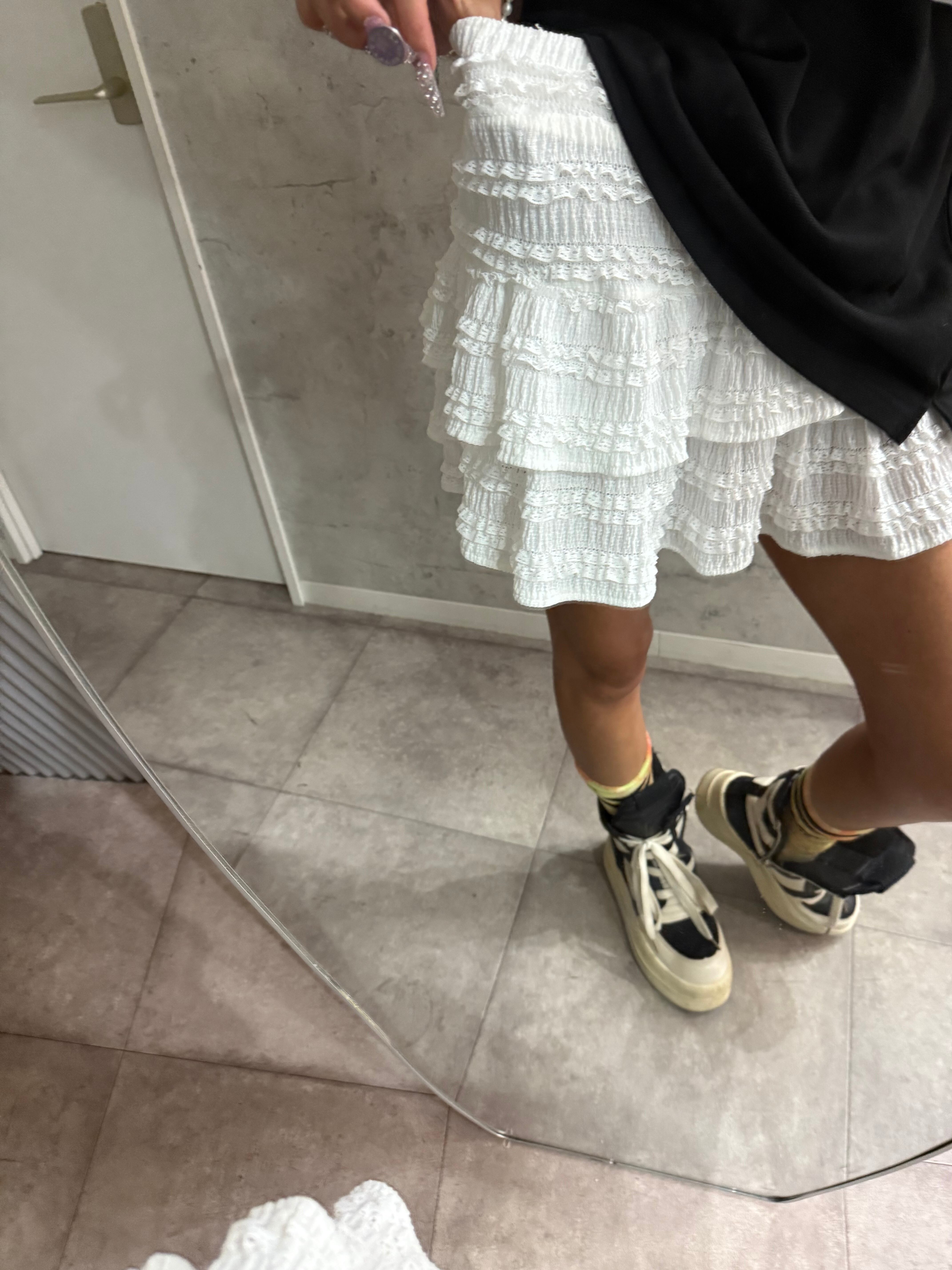 フリルがたっぷり施されたシルエットが特徴的で、ボリューム感がありながらも軽やかに揺れるため、歩くたびに華やかな印象を与えます。