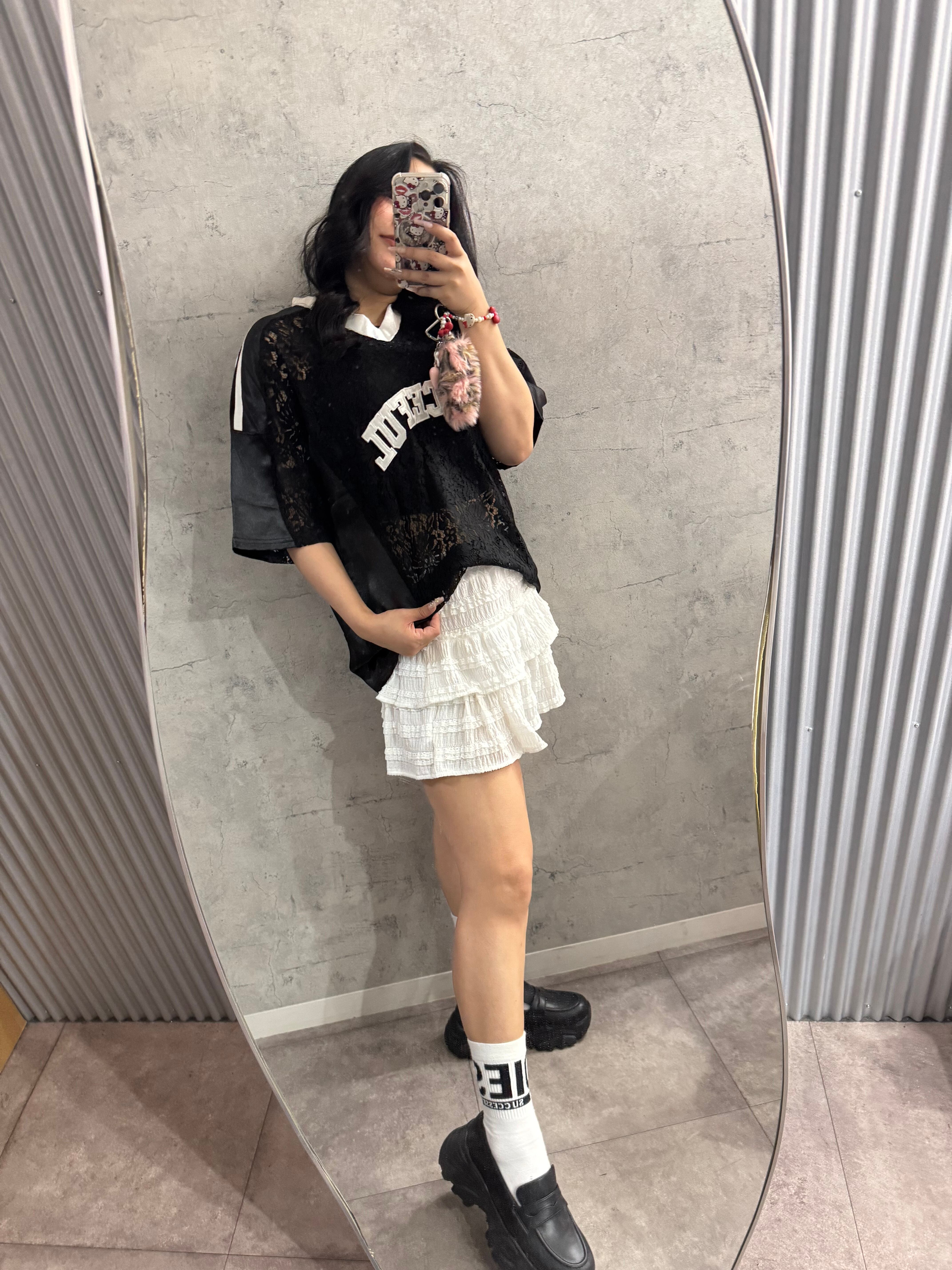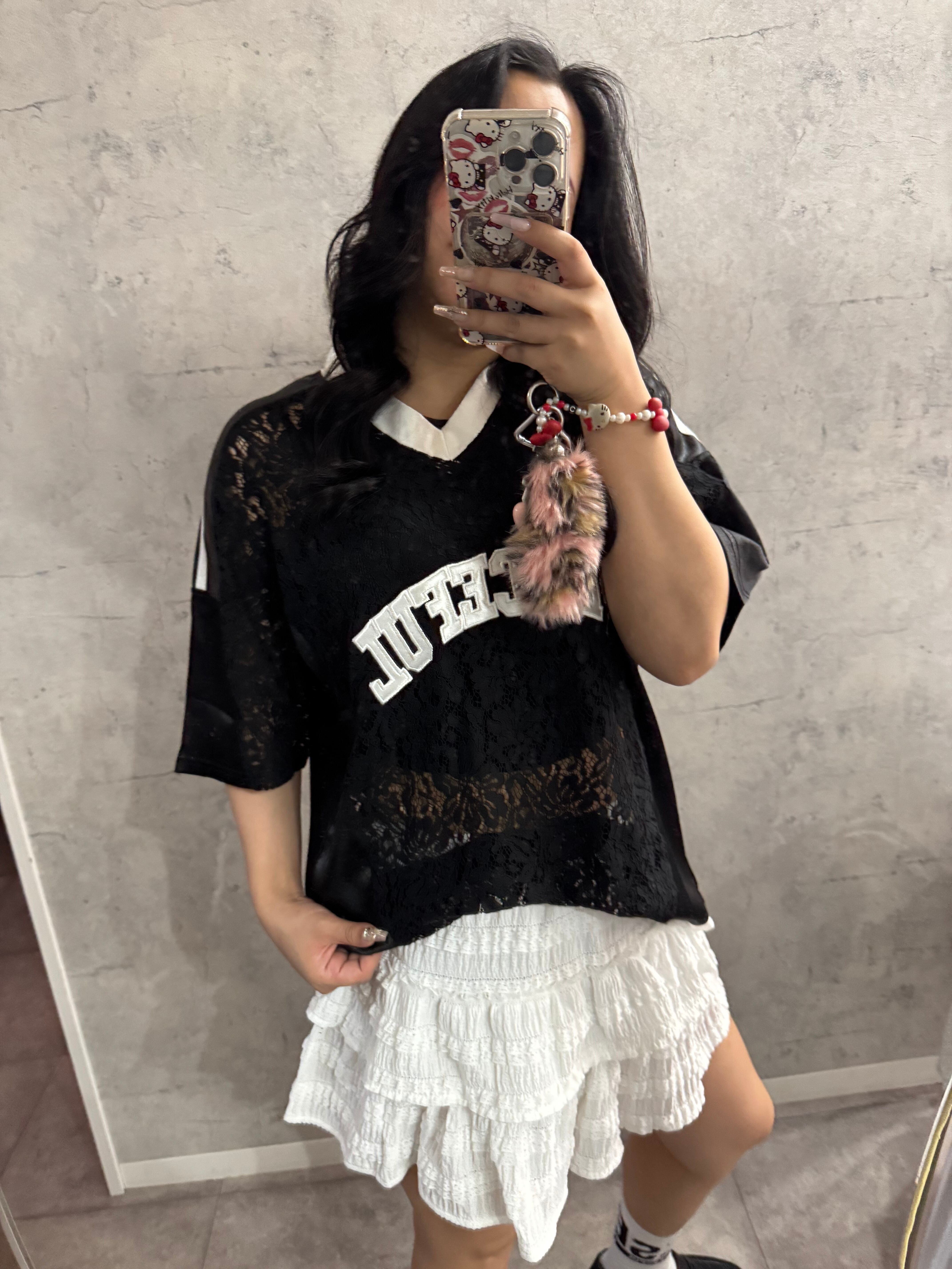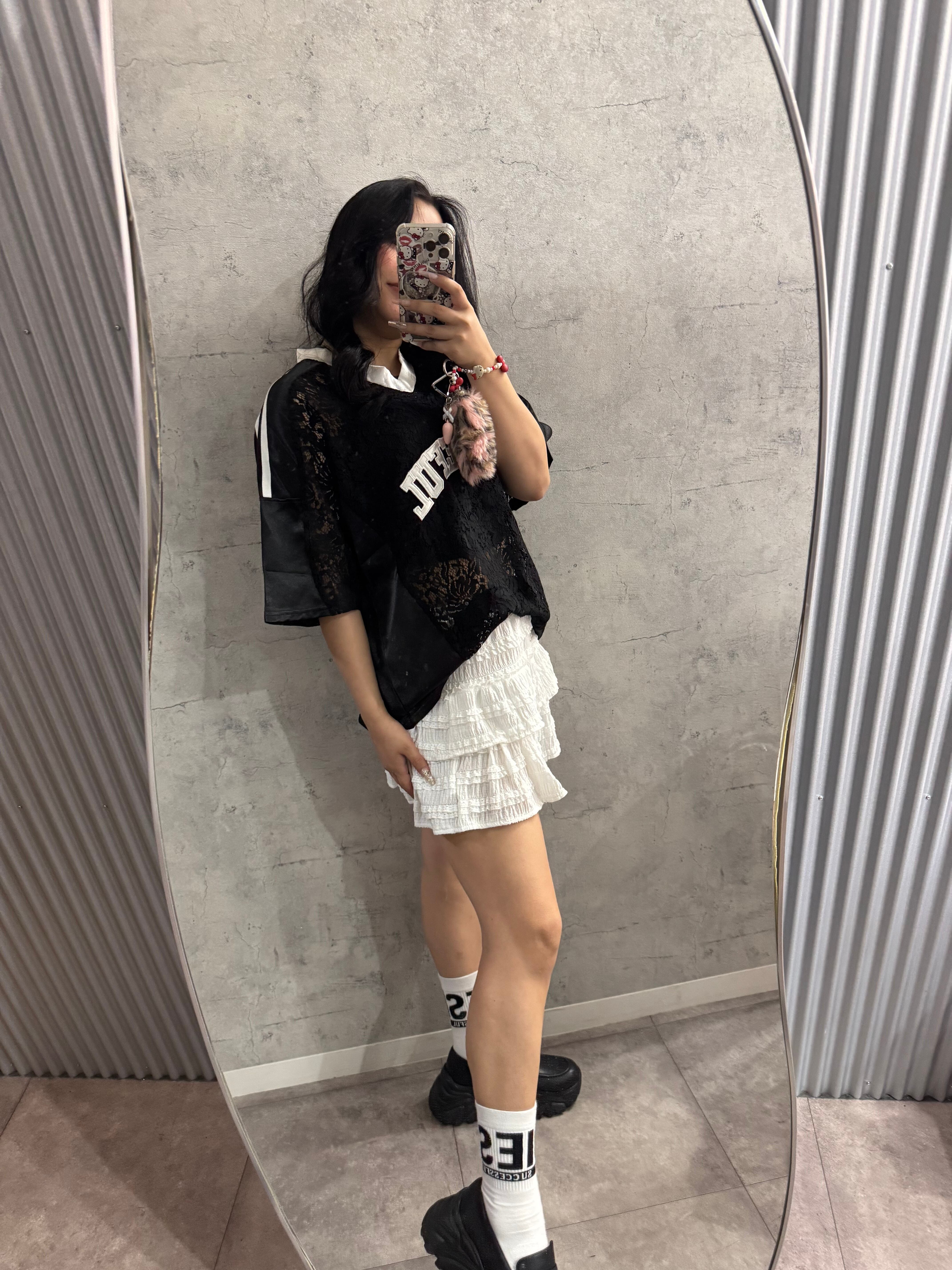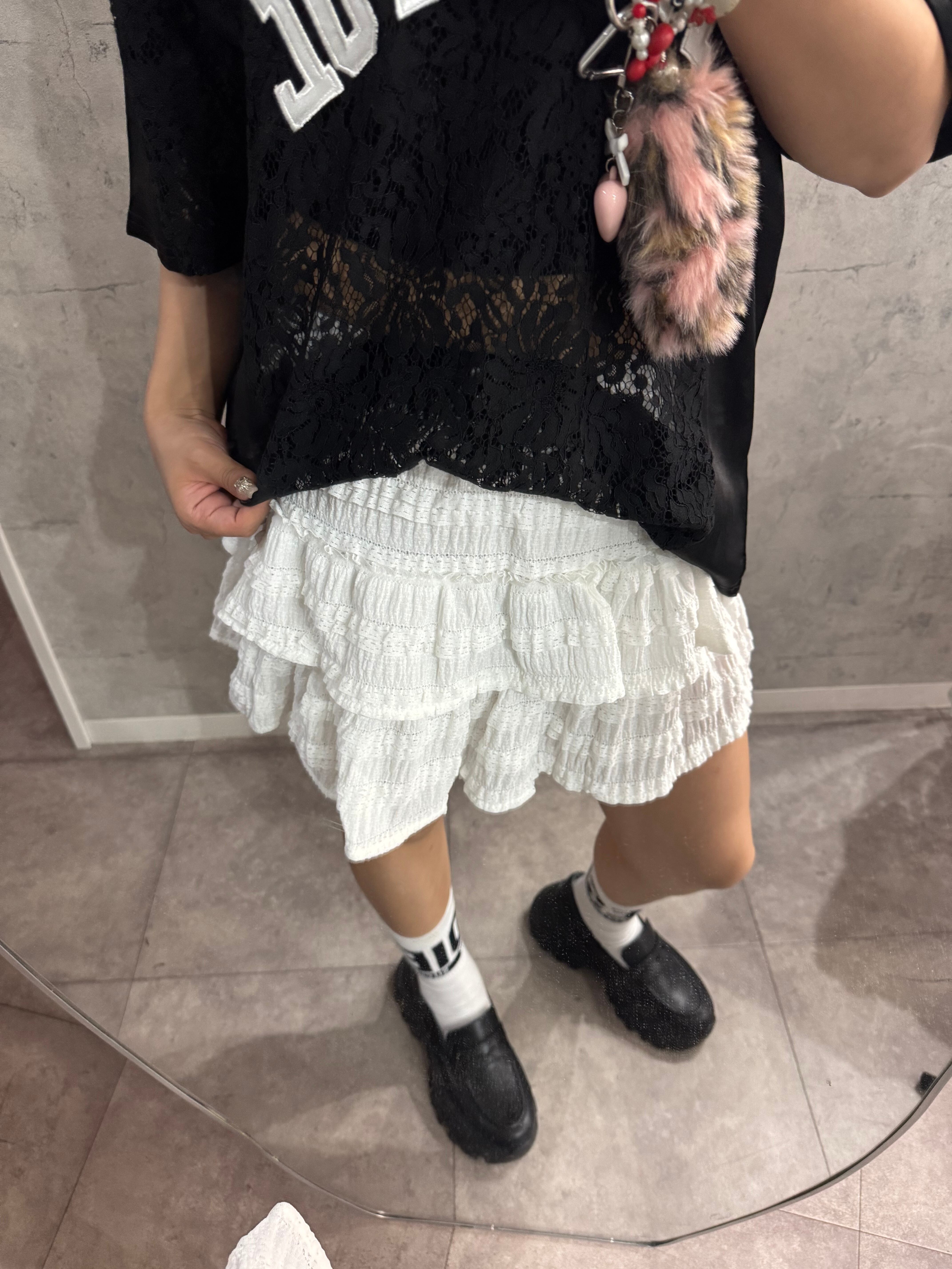 レース素材が使用されており、軽やかでエレガントな印象を与えます。特に、柔らかなアイボリーカラーが上品さを際立たせつつ、甘さのあるデザインに仕上がっているのが特徴です。