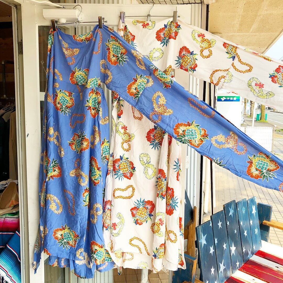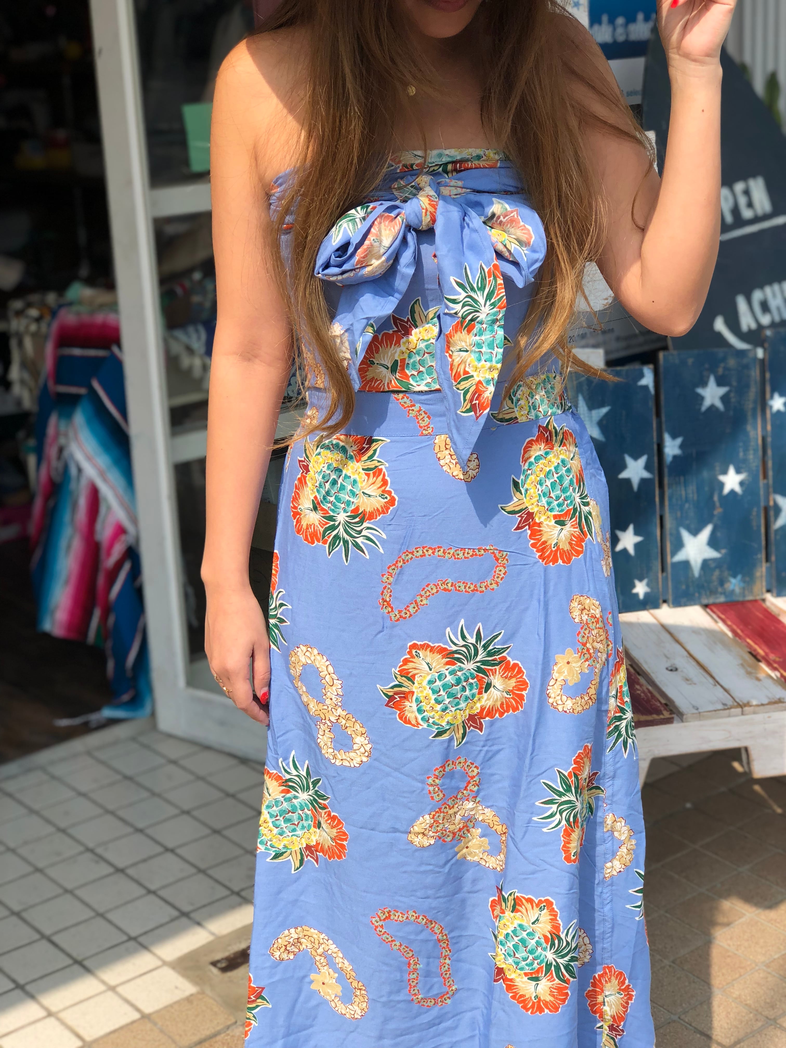 ヴィンテージ調のハイビスカスやパイナップル、レイを散りばめた華やかな柄。挙式やパーティーでのペアルックもお勧め。ウエストのリボンアレンジでワンピースにもスカートにもなり、様々な着こなしが楽しめます。