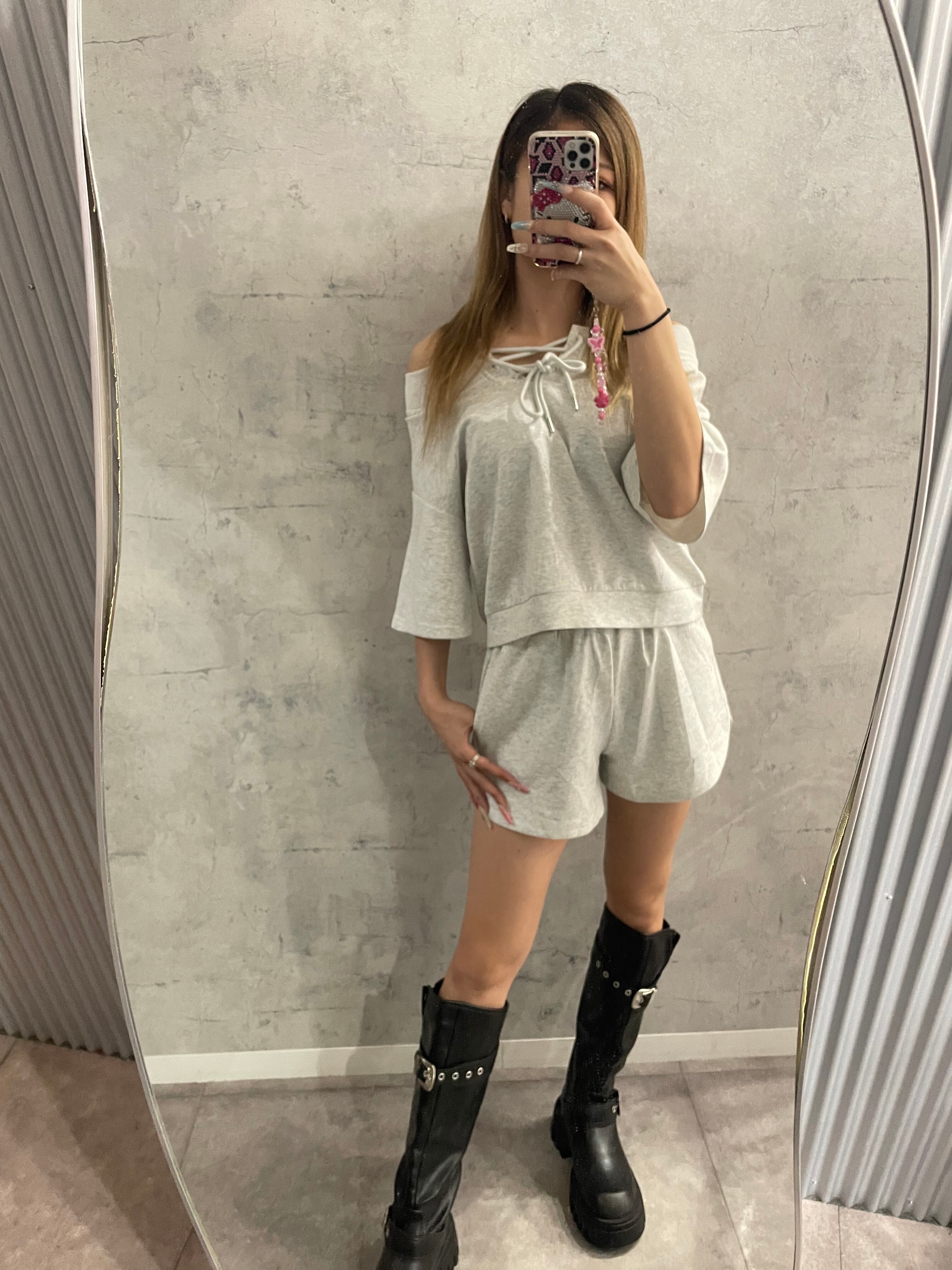 ブラックラスト1オフショルトップス×ショートパンツセットアップ