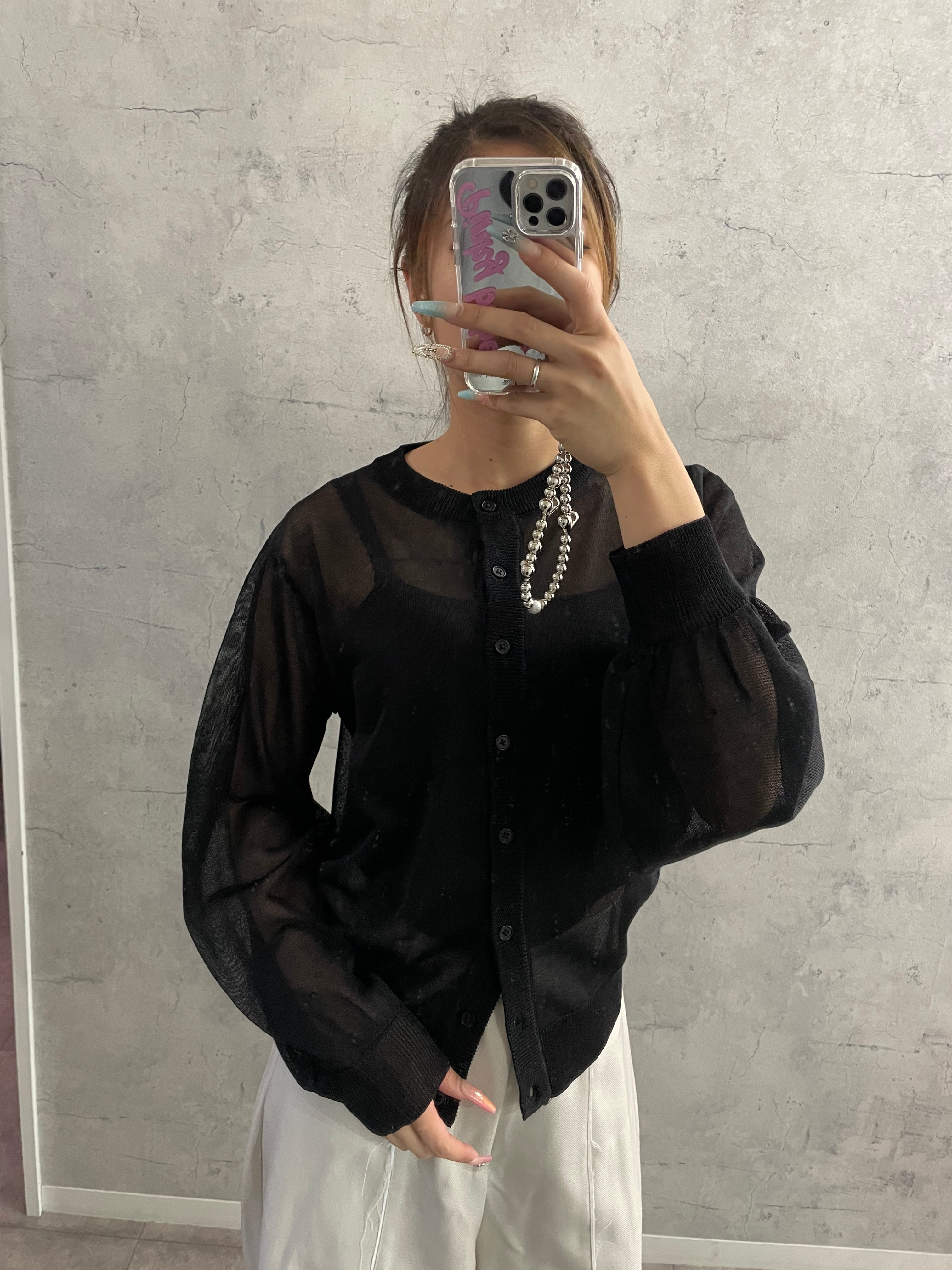 軽やかで透け感のあるシアーニットカーディガン程よいリラックス感のあるシルエットで、トップスとしてはもちろん羽織りとしても活躍する万能アイテム◎カジュアルからフェミニンまで幅広いスタイリングに対応できますシンプルなクルーネックデザインで身体のラインを拾わないのも◎夏の冷暖房対策に1枚は持っておきたい必須アイテムです。