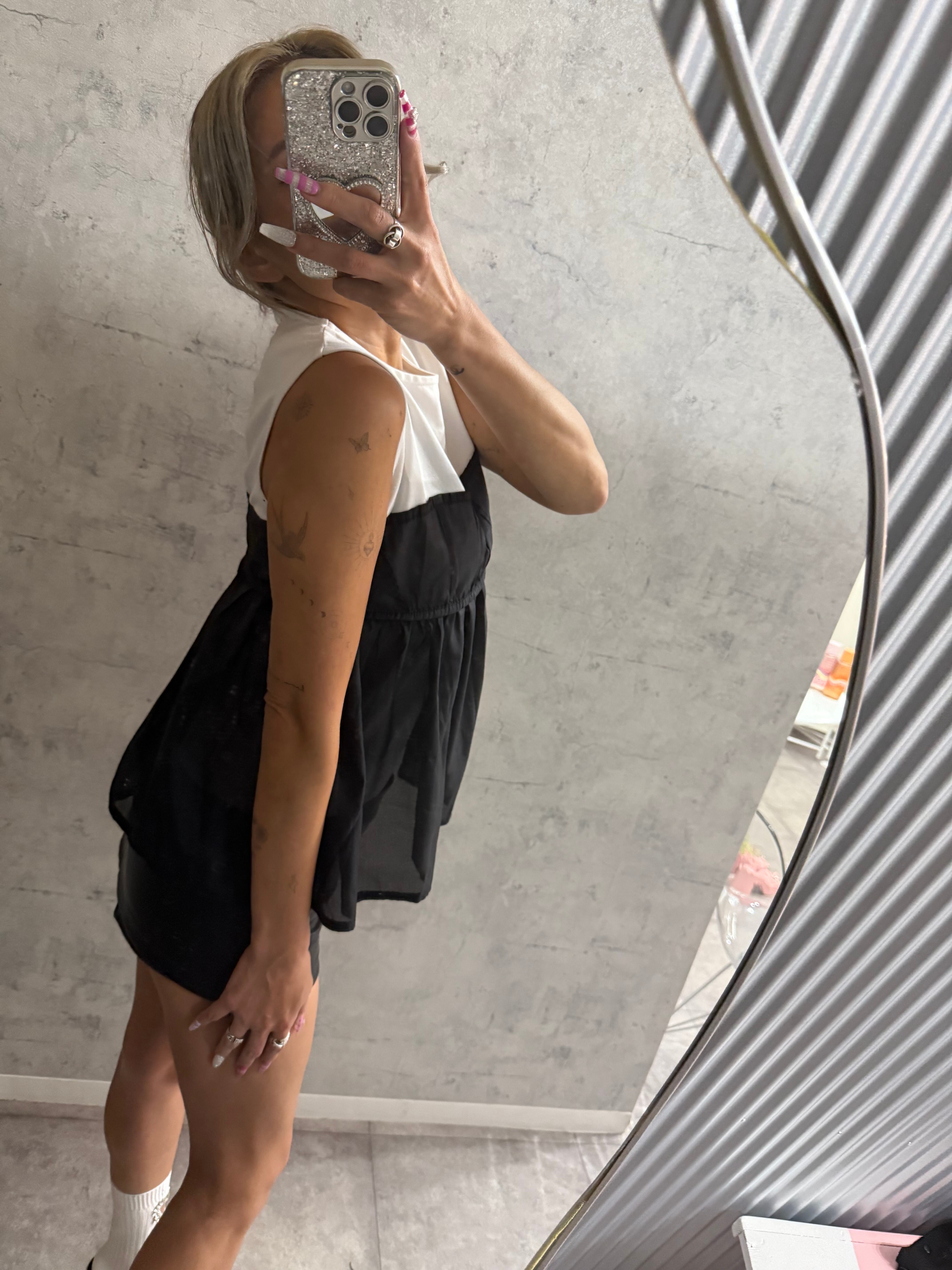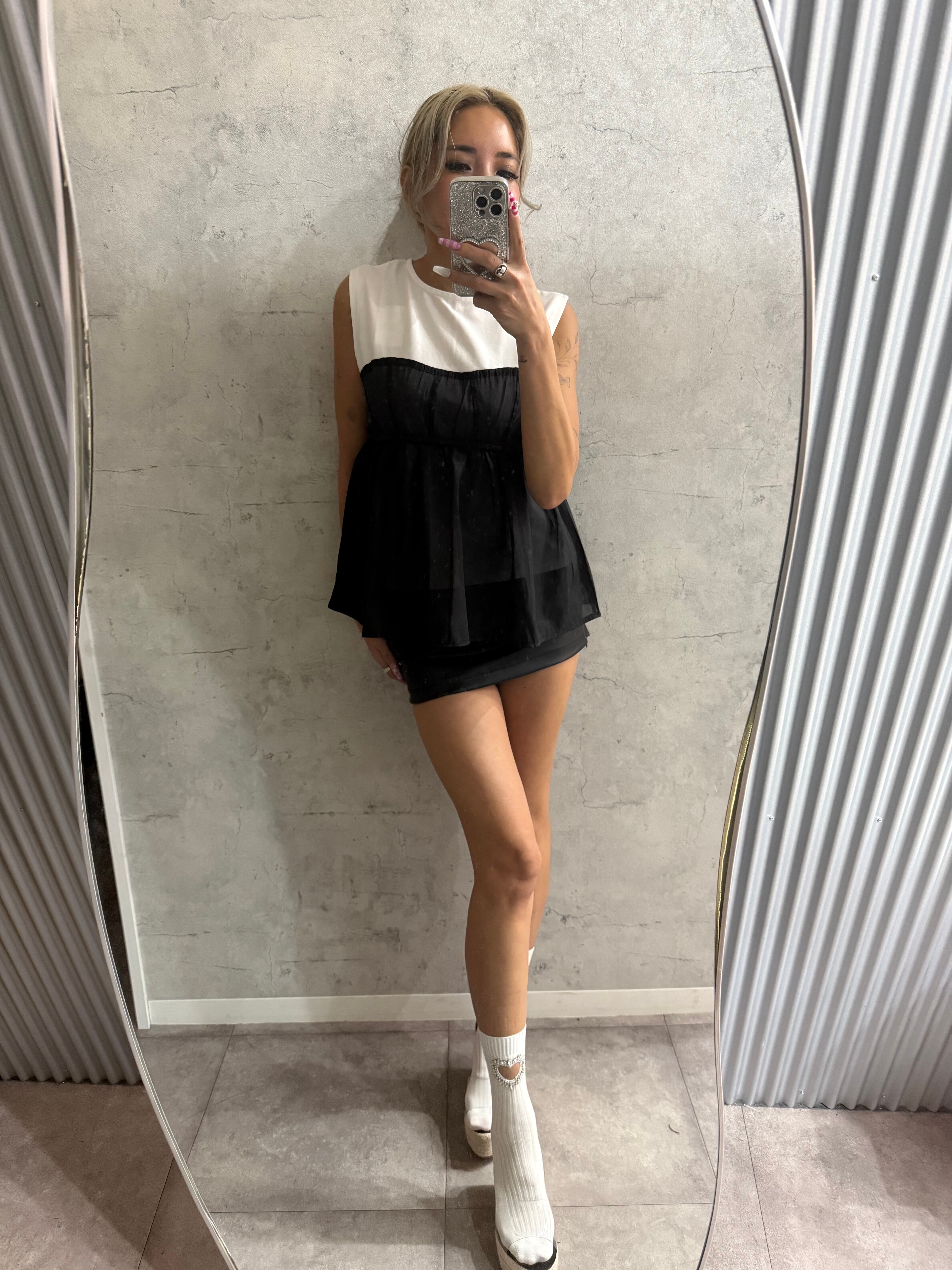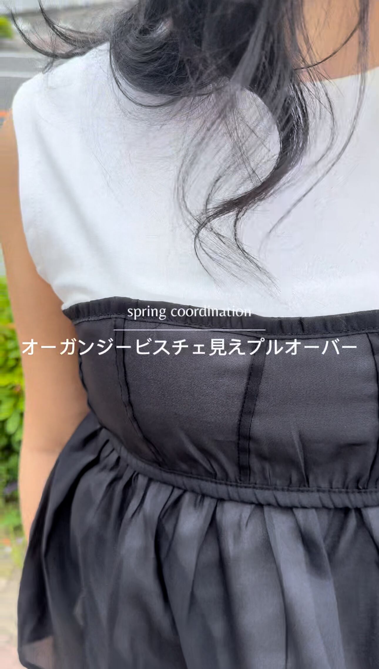 天竺素材にオーガンジーの異素材をドッキングさせた1枚デザインが完成されてるので、コーデも楽々◎ビスチェ見えデザインがウエストの位置を高く見せてくれます