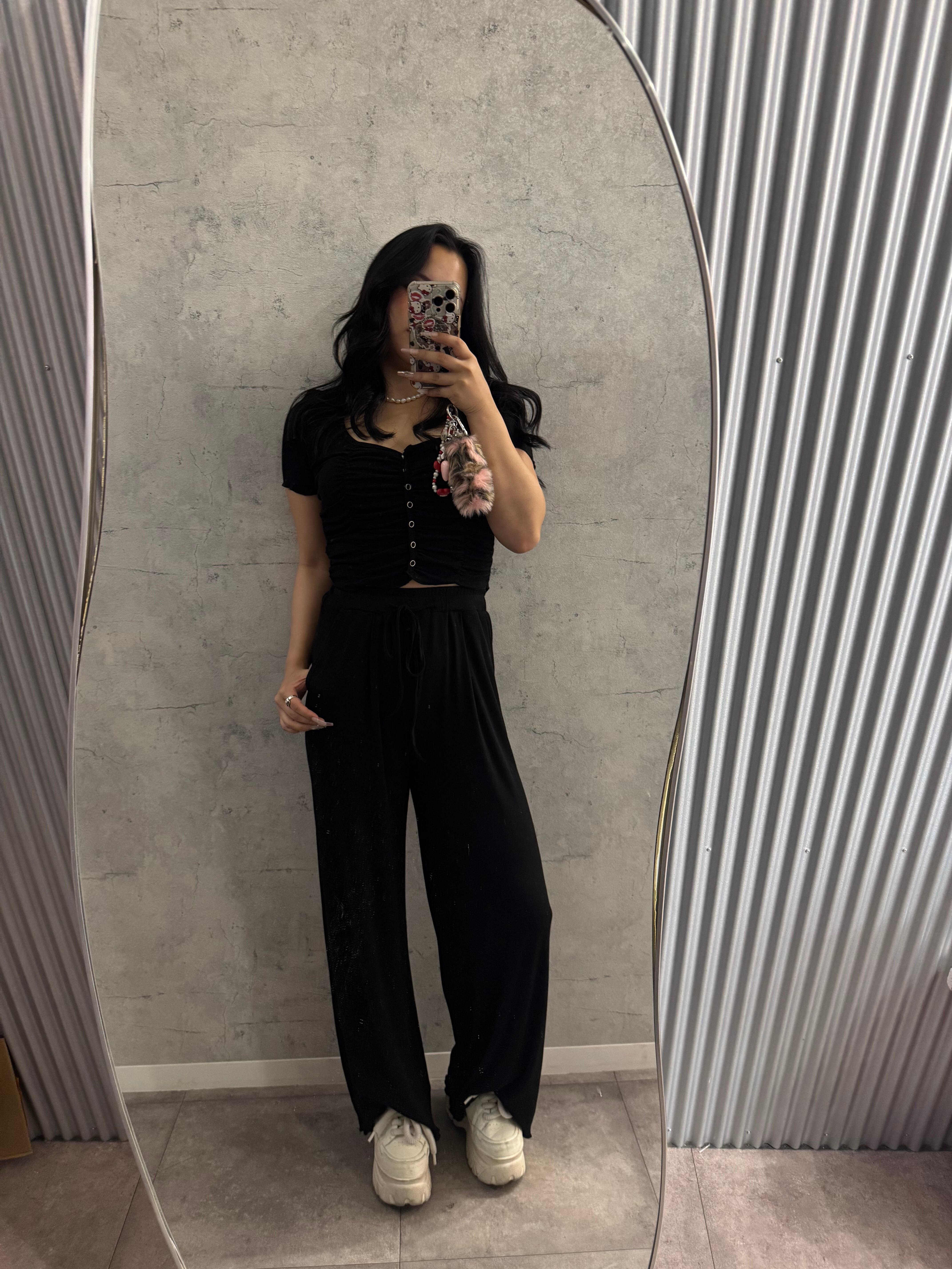 【パンツ】着丈101cm、ウエスト58cm(ゴム仕様)、ヒップ94cm、もも周り60cm、股上31cm、股下73cm、すそ周り64cm