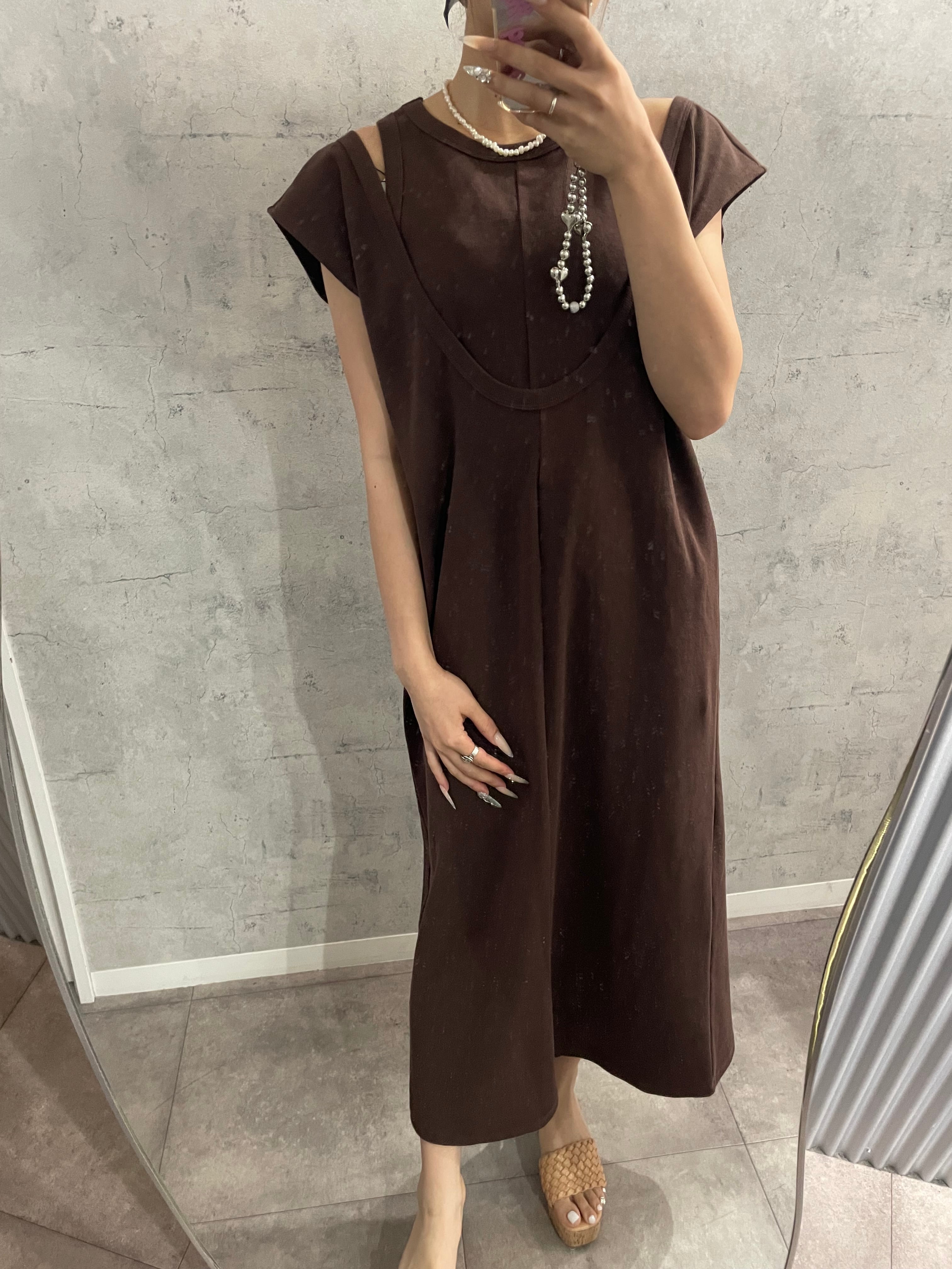 フレンチスリーブワンピース×タンクトップのレイヤードワンピース。深めのUネックとタンクトップからチラッと見える肌見せがこなれ感をプラス。リブ素材なので程よい伸縮性とやわらかさが特徴。フレンチスリーブで腕周りをカバーできるのもうれしいポイント◎タンクトップとワンピースは前後左右の4か所で縫い止めされたドッキングデザイン。