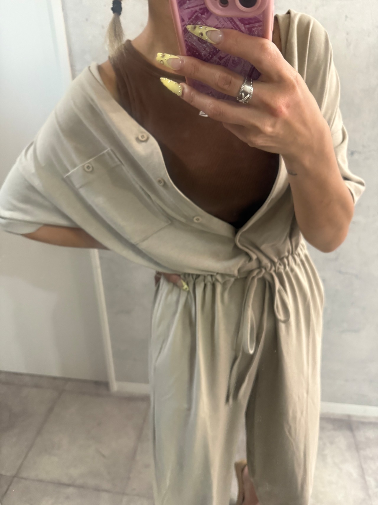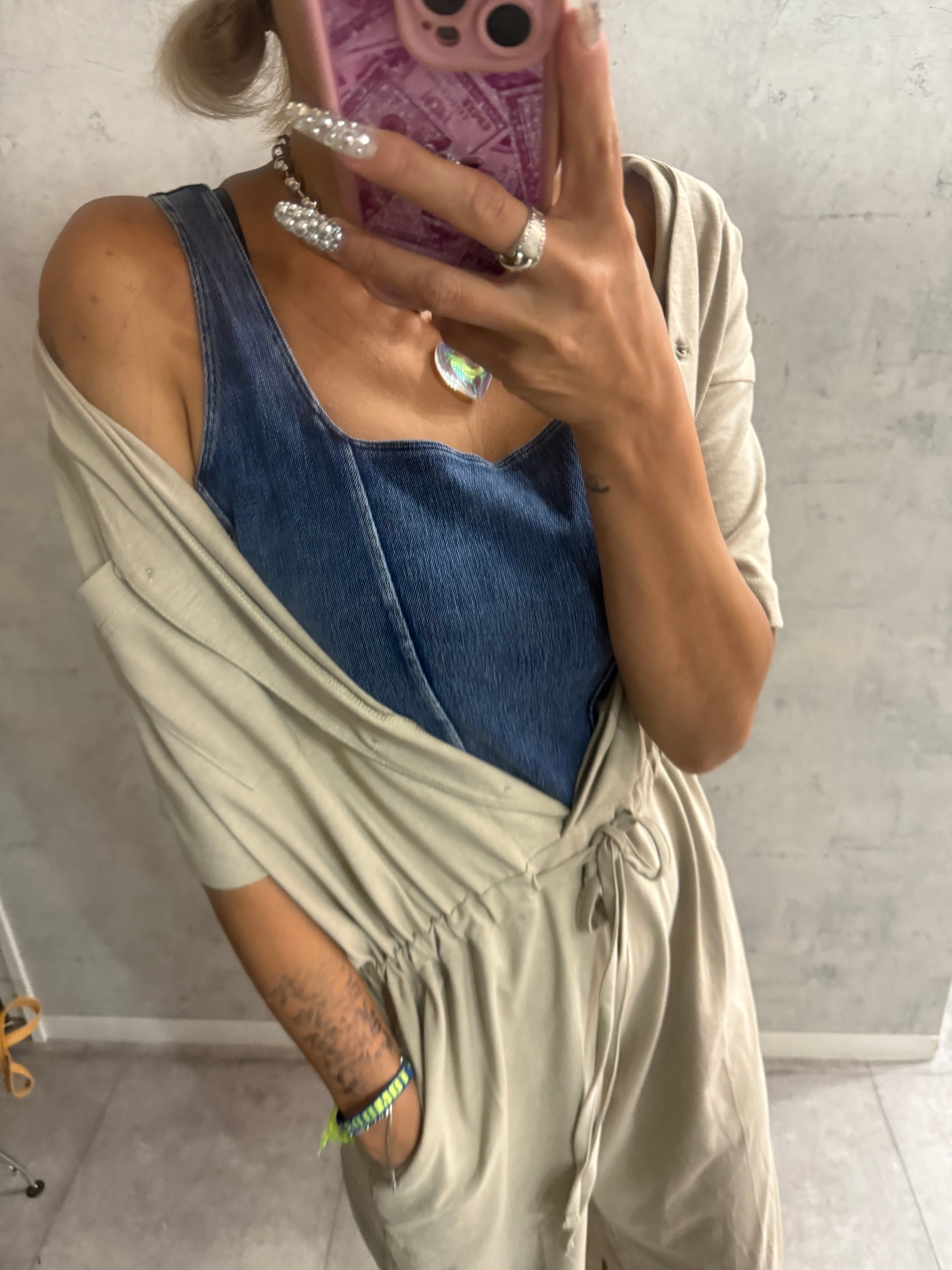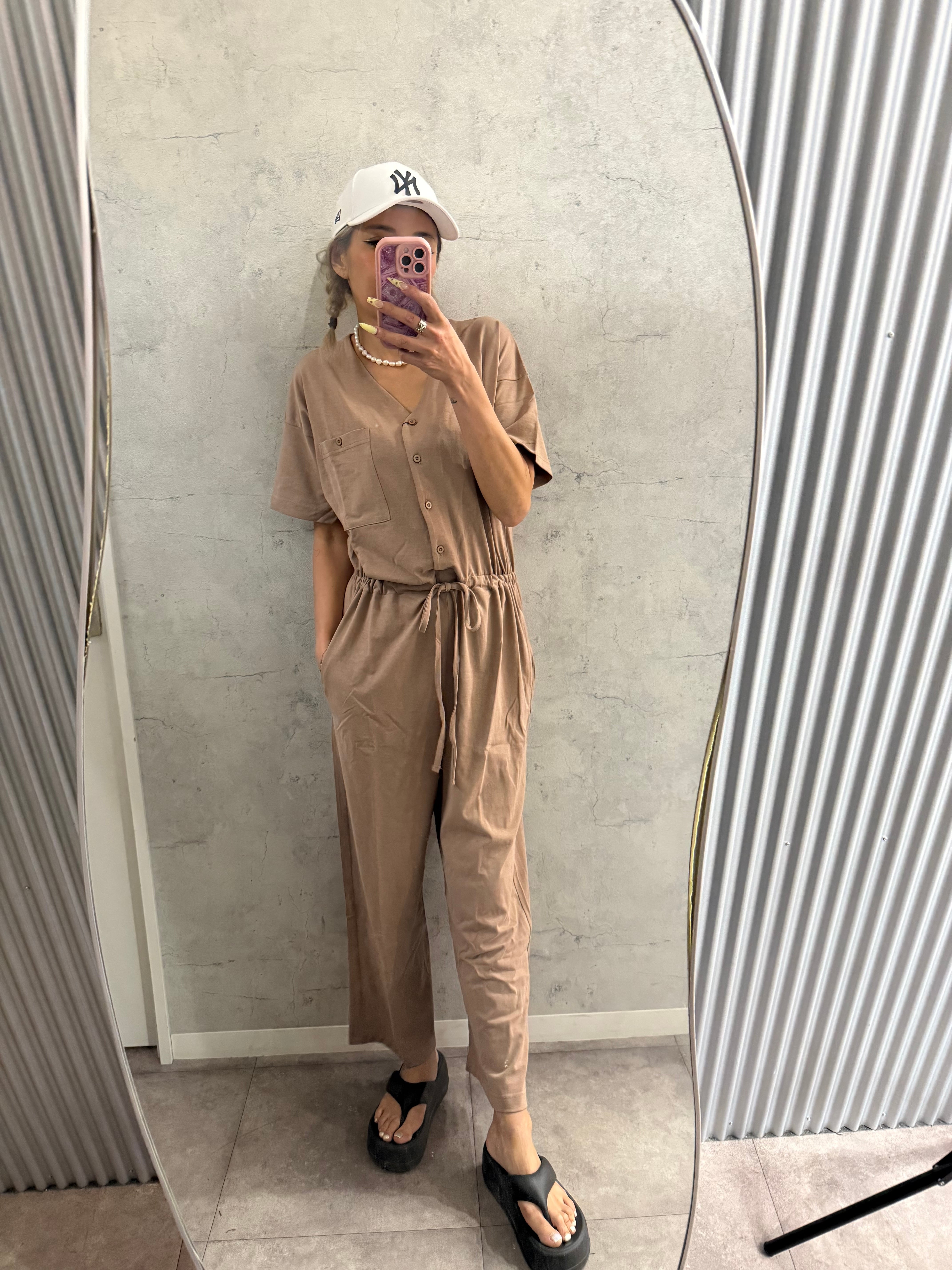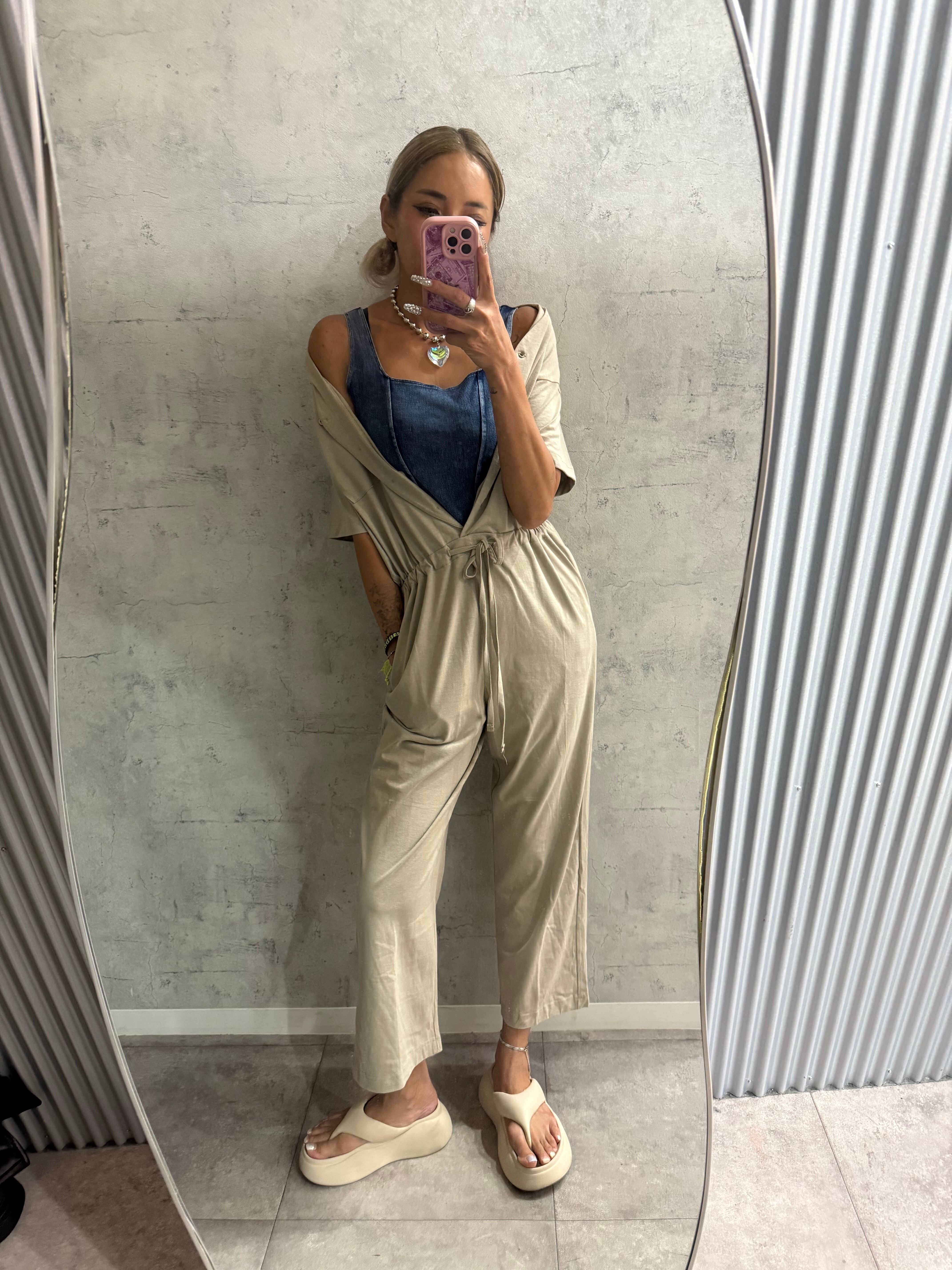 ボディラインを拾わないゆったりシルエットのオールインワン。