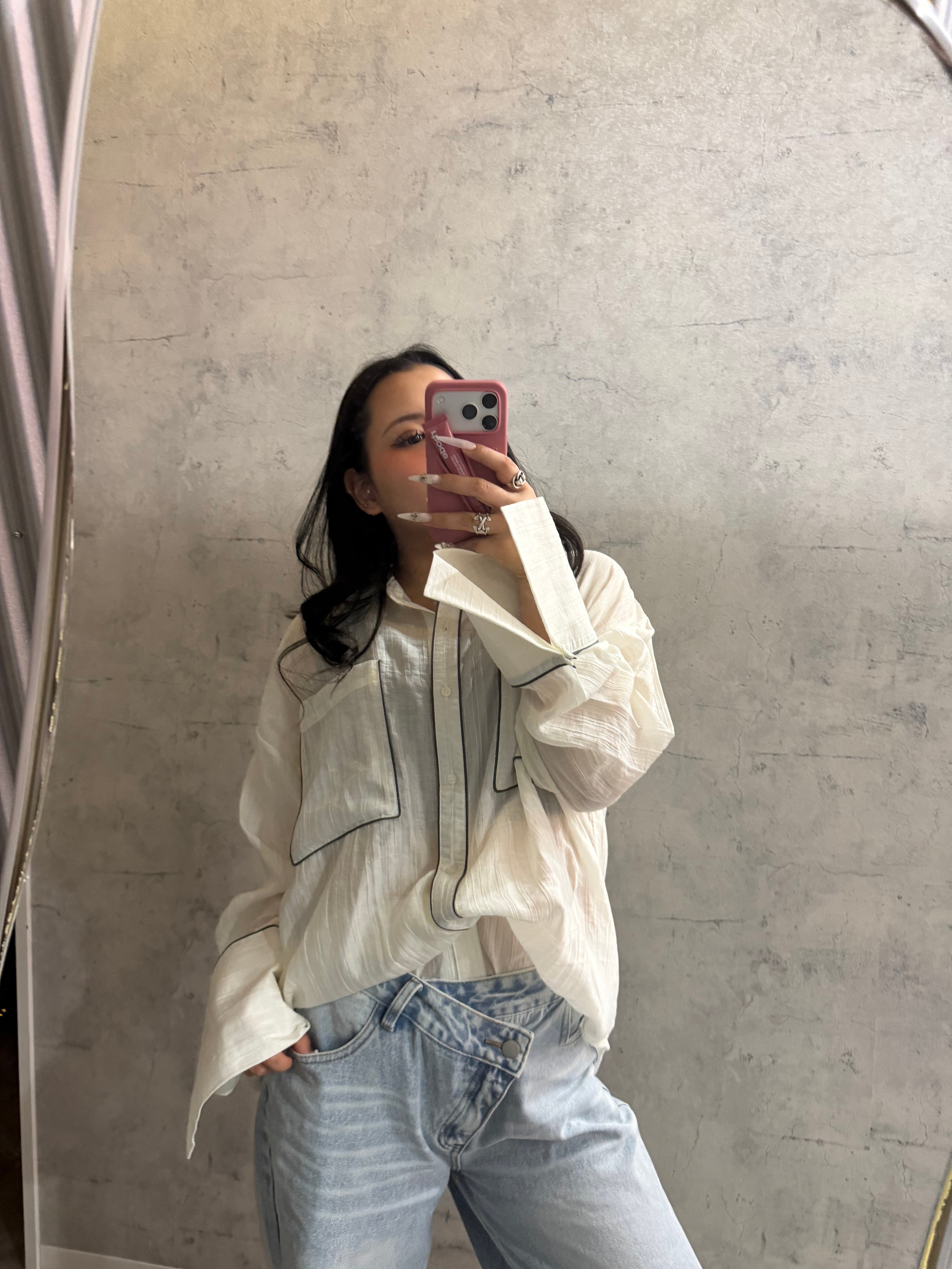 配色のパイピングがトレンドライクな長袖シャツが登場*
