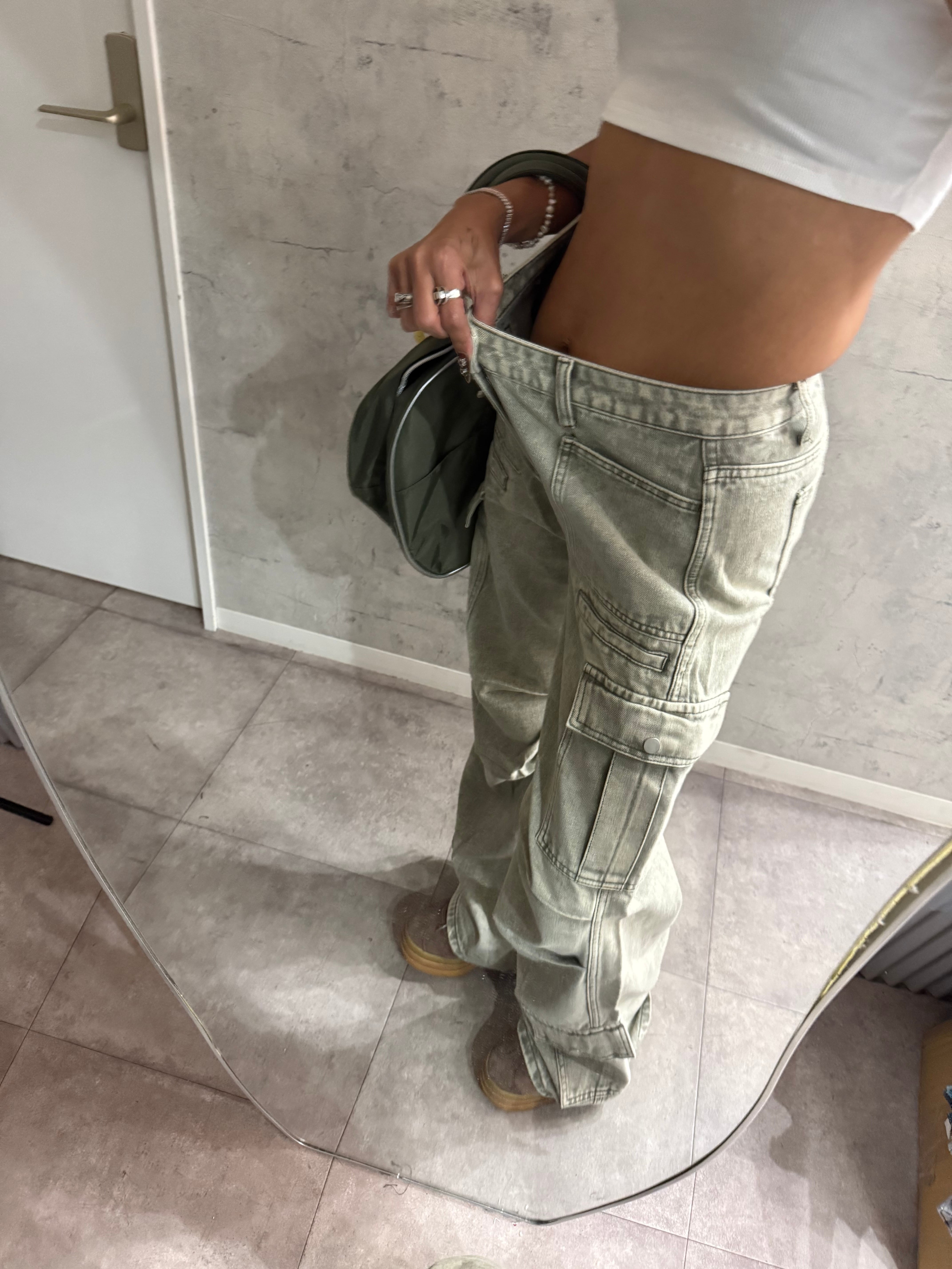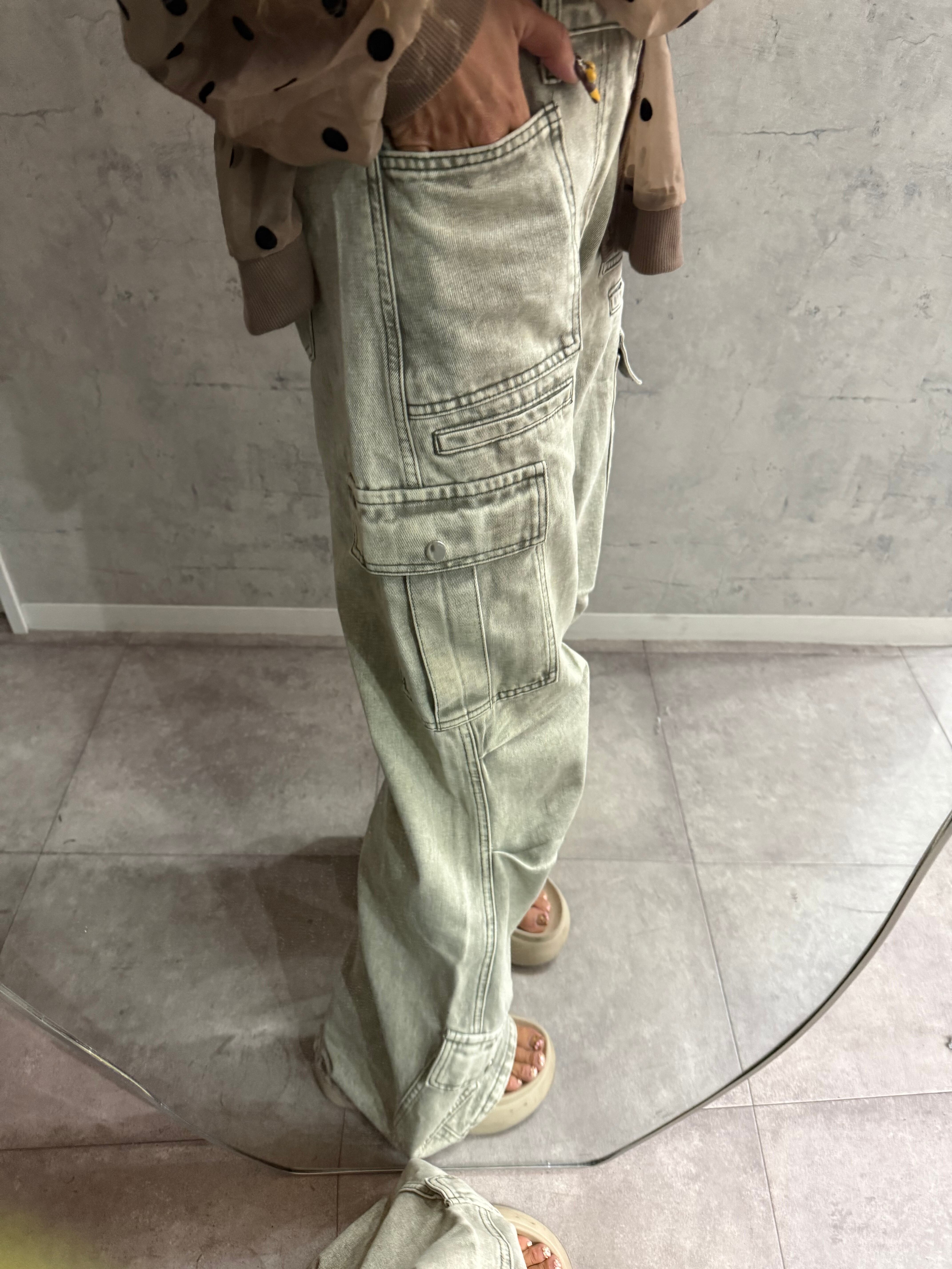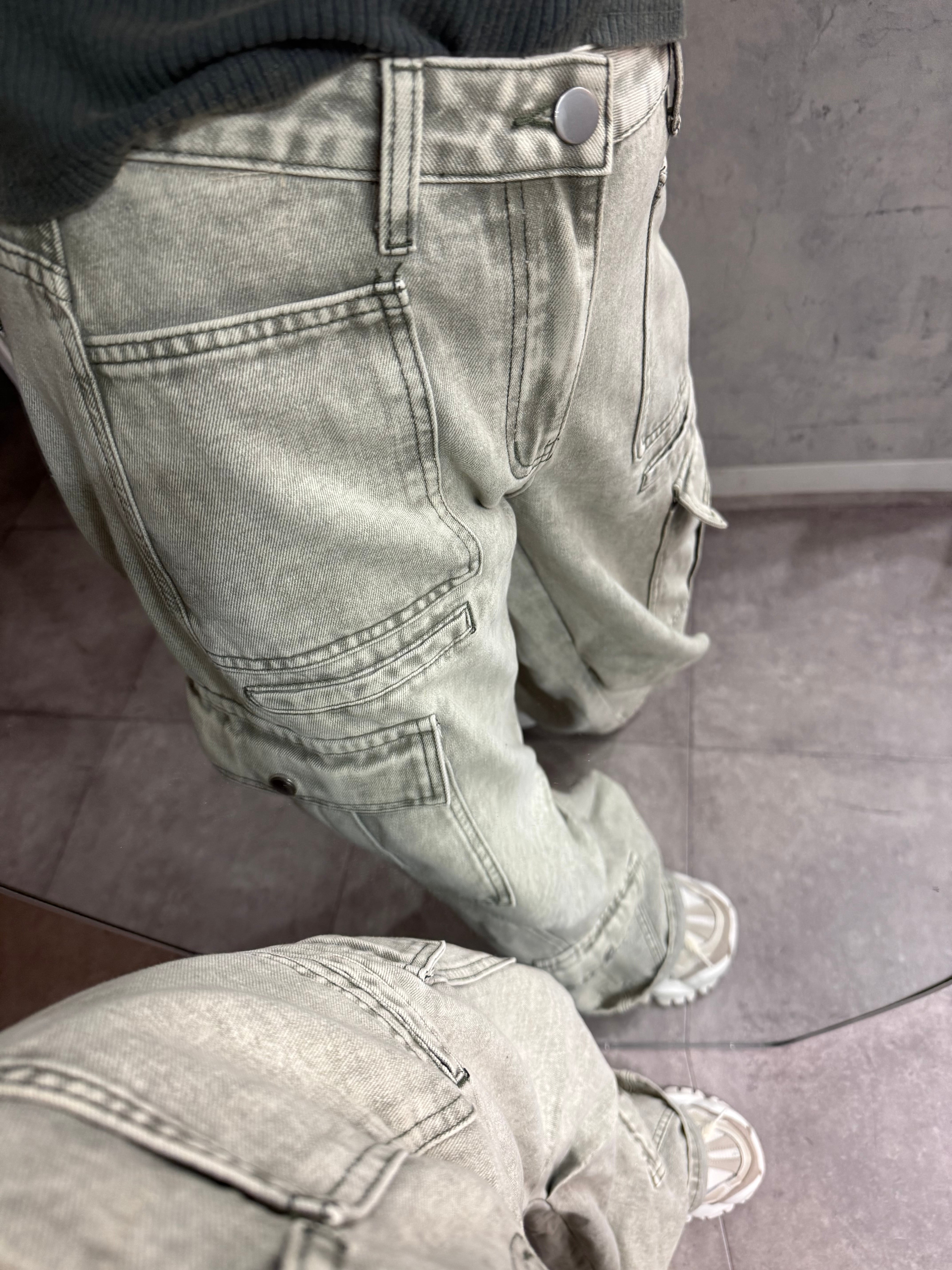 オリジナルヴィンテージ風カーゴワイドデニムパンツカーキ
