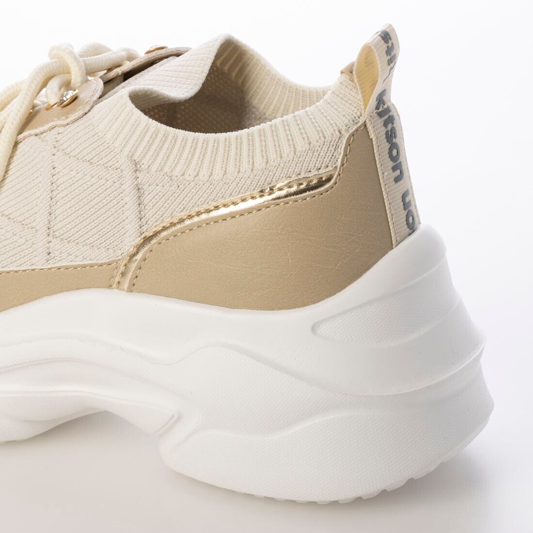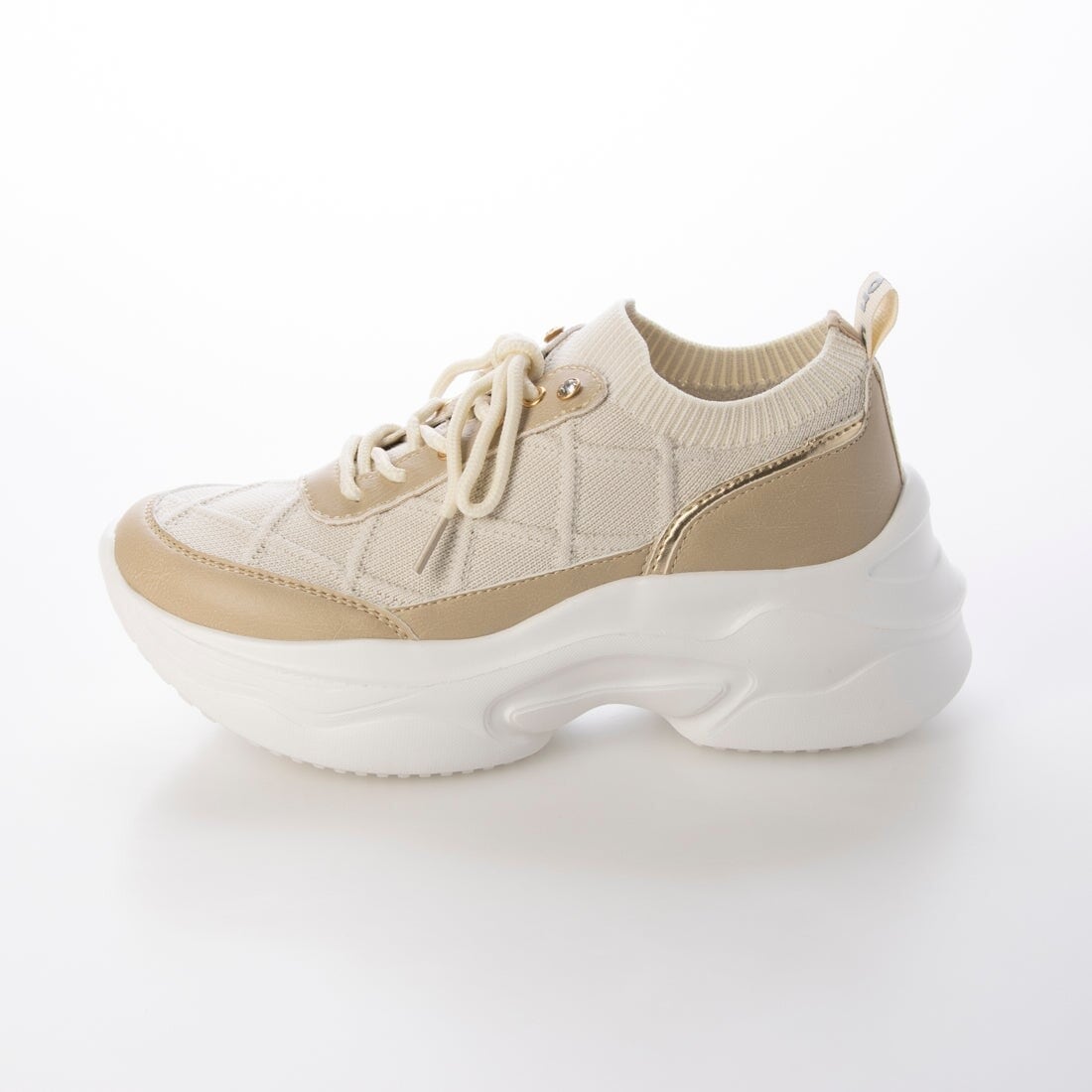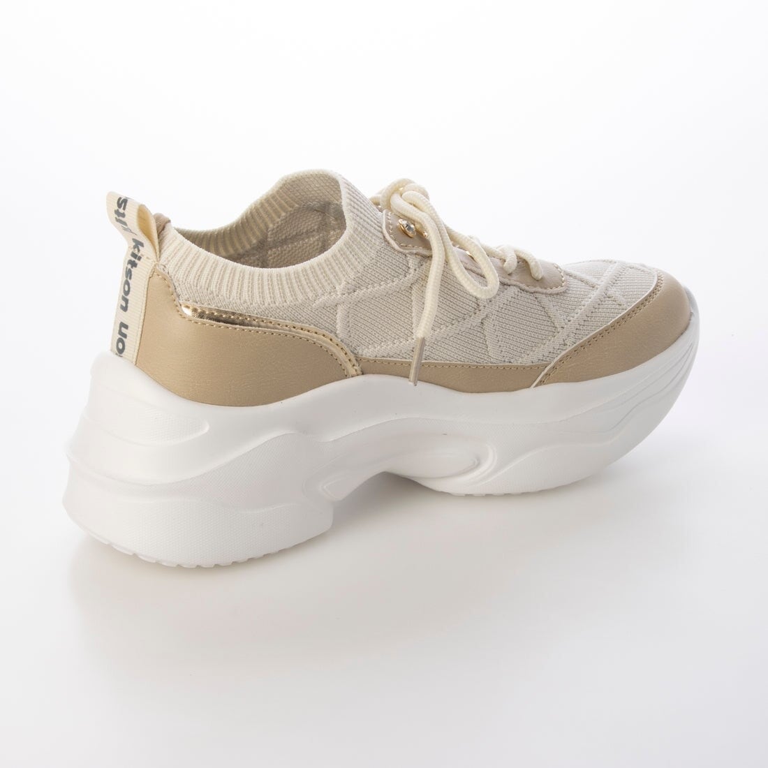 【デザイン・履き心地】・アッパーにはカジュアルで優しい雰囲気のニット素材。・履き口がリブになっている為、脱ぎ履き楽々です。・程よい厚底のウエッジソール仕様になっておりクッション性も〇ペタンコは苦手という方にもオススメ!・アクセントとなるカシメのストーン、配色とどれも主張しすぎない為、コーディネートに取り入れやすいデイリー履きに大変重宝する丁度いいバランスなスニーカーです。