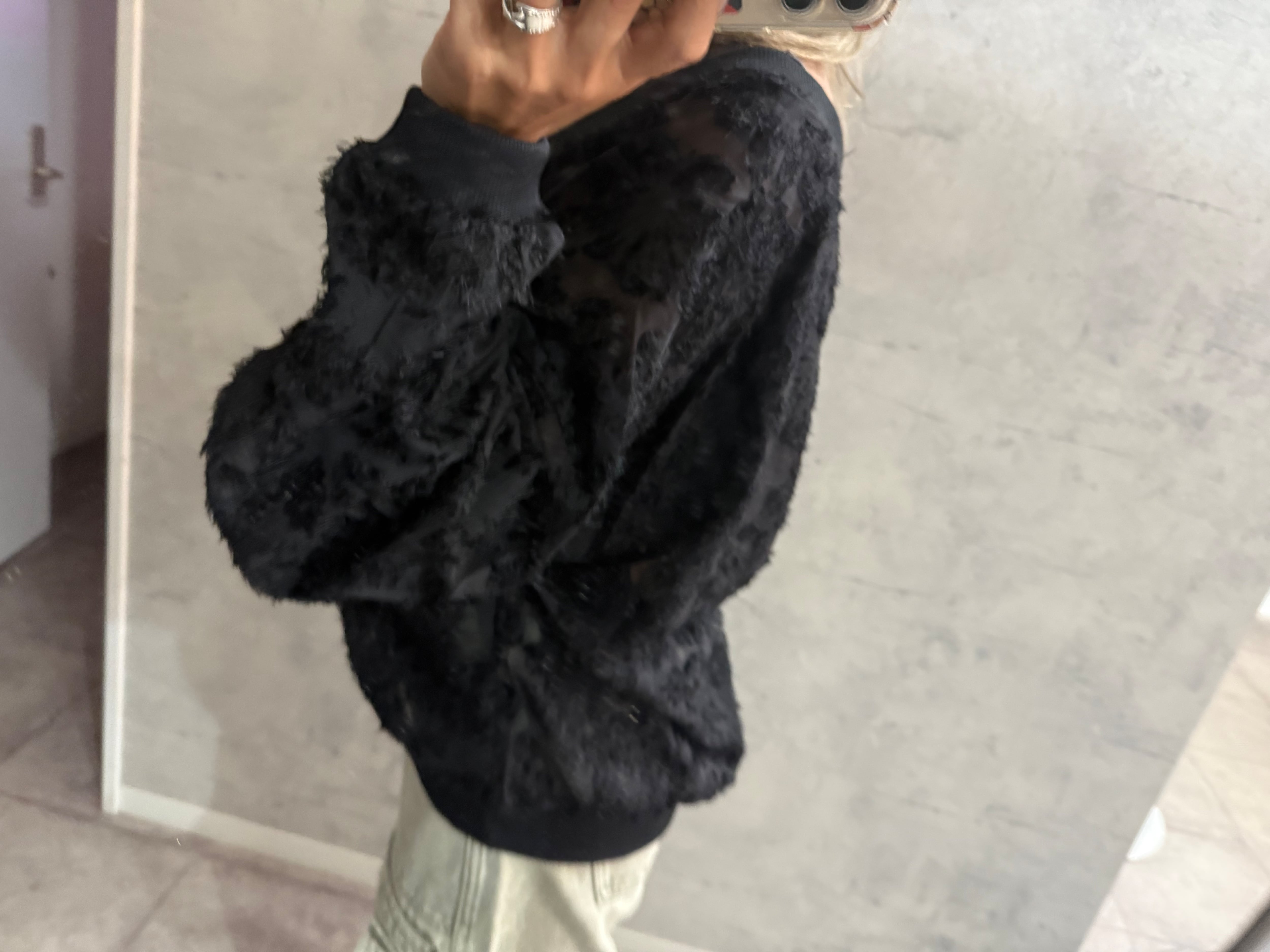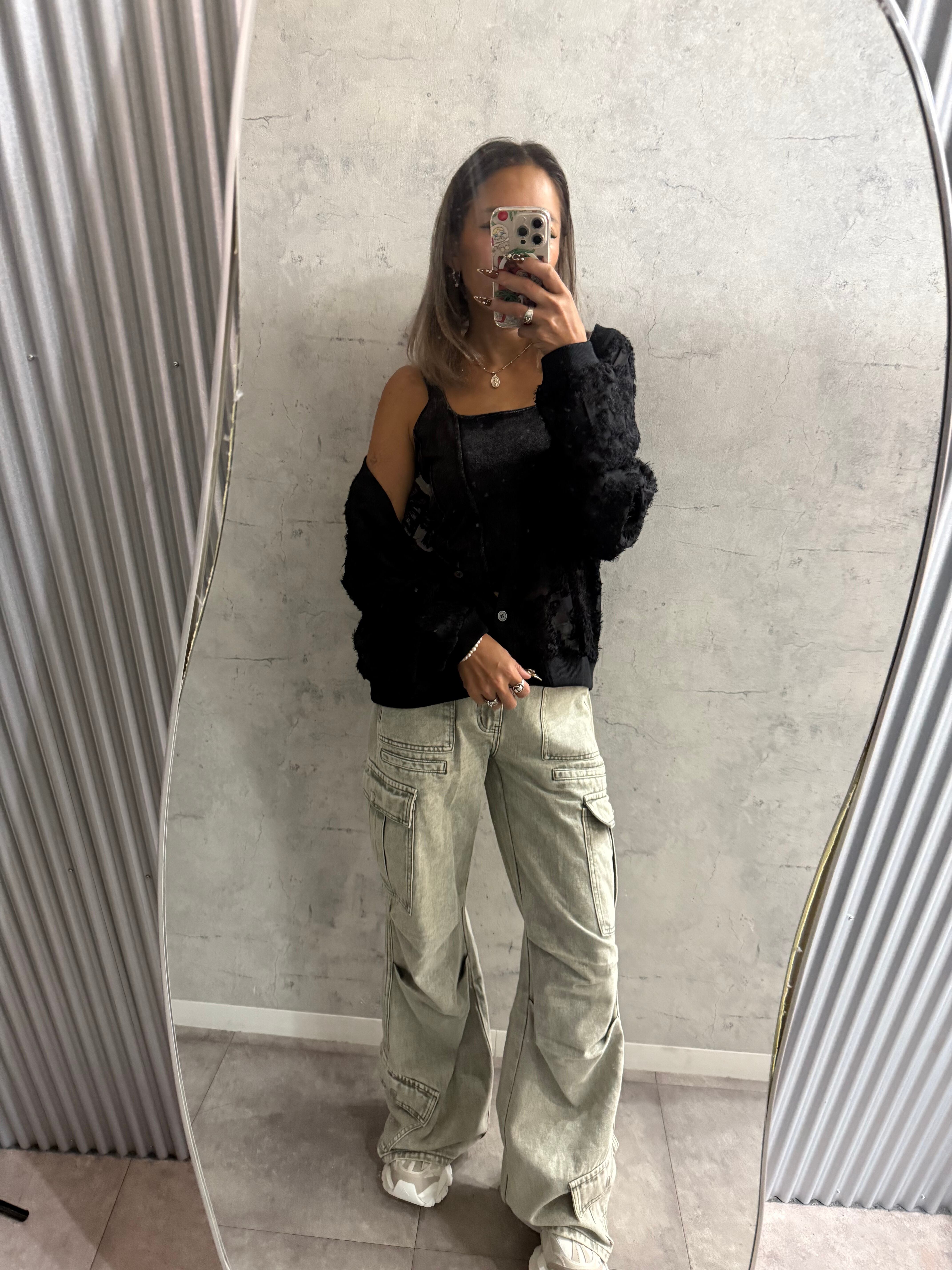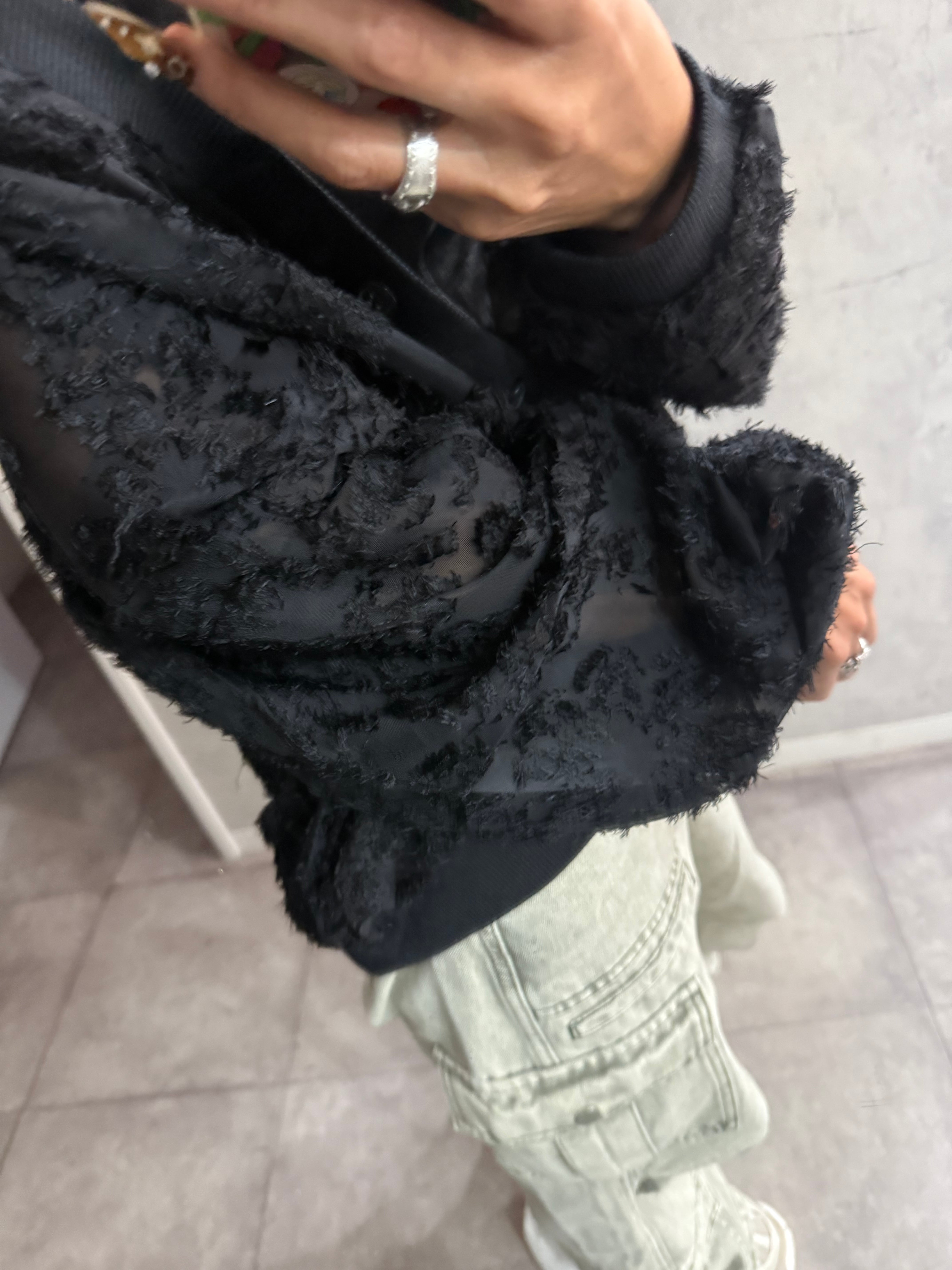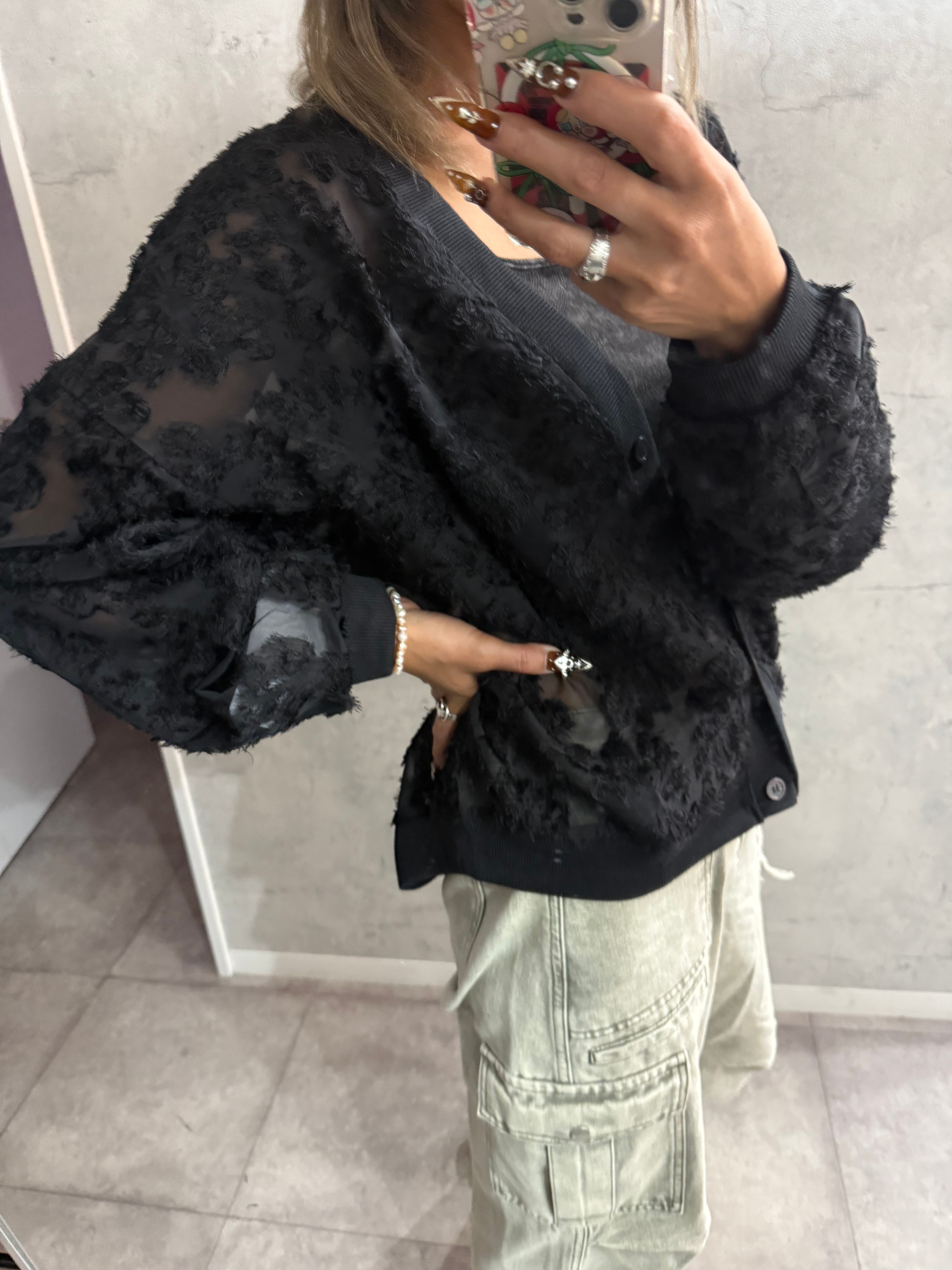 ■デザインポイント・繊細なシアー素材にフリンジモチーフを全体使い・毛足のあるシャギー風の立体感で華やかに・ゆとりのあるドロップショルダーでリラックス感◎・ボタン開閉で羽織りにもプルオーバーにも対応