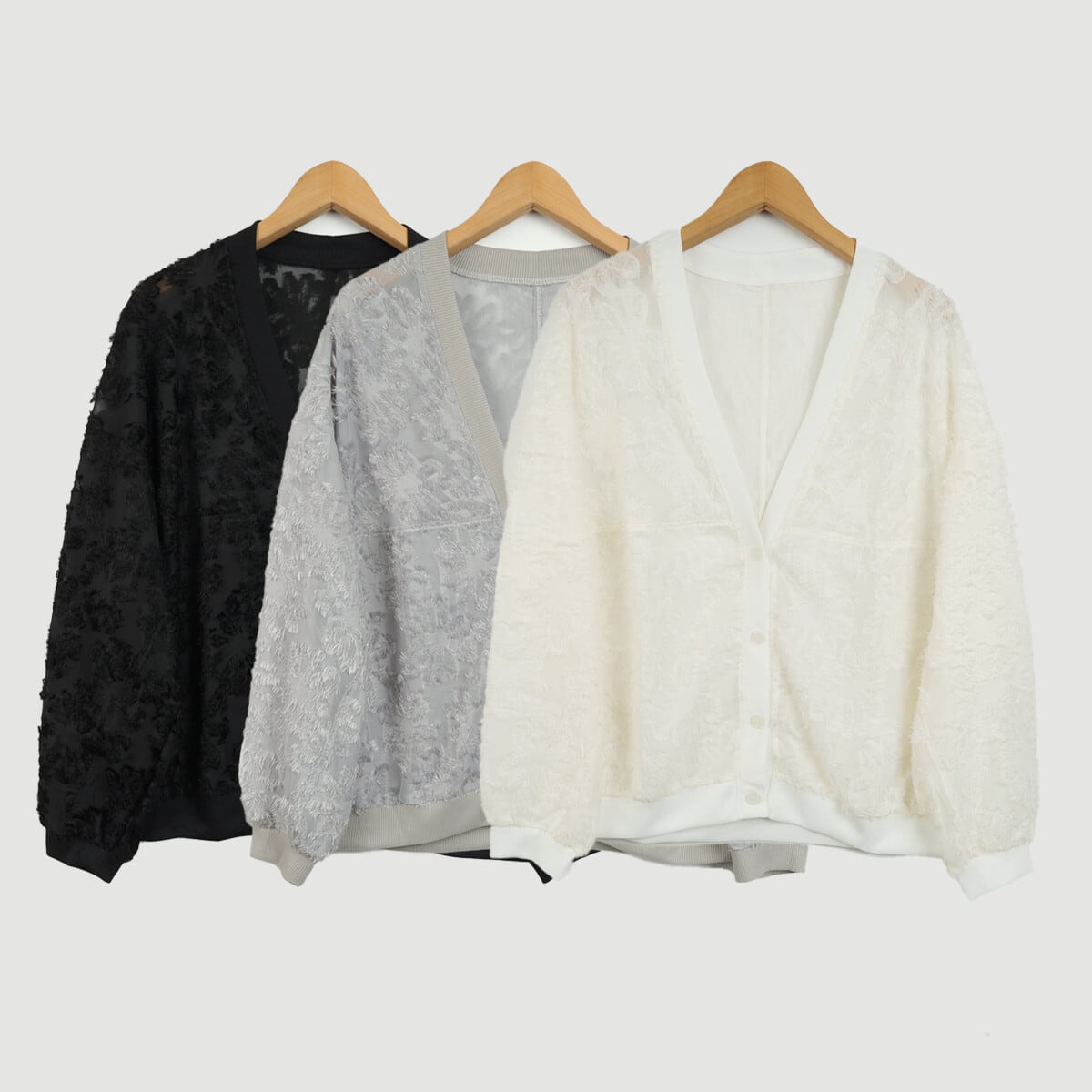 立体感あるフリンジモチーフが全体に施された、軽やかな印象のVネックカーディガン。シアー素材の上に柔らかく揺れるシャギー風テクスチャが、着るだけでスタイリングに奥行きをプラスしてくれます。リブ仕立てのVネックと袖・裾のディテールが、抜け感のあるバランスを演出。カーディガンとして羽織るのはもちろん、ボタンを留めてプルオーバー風にも着用できる汎用性の高い一枚です。