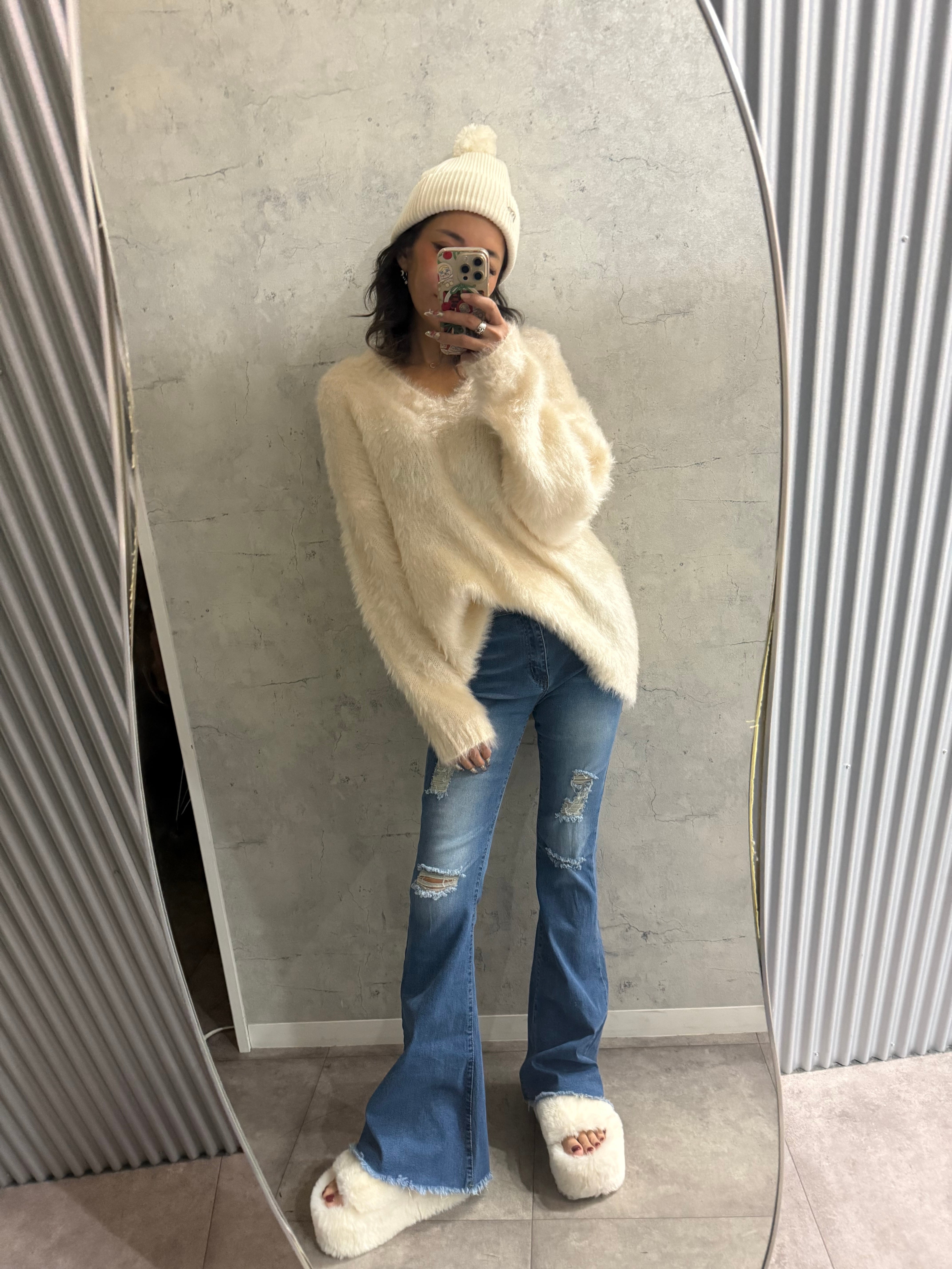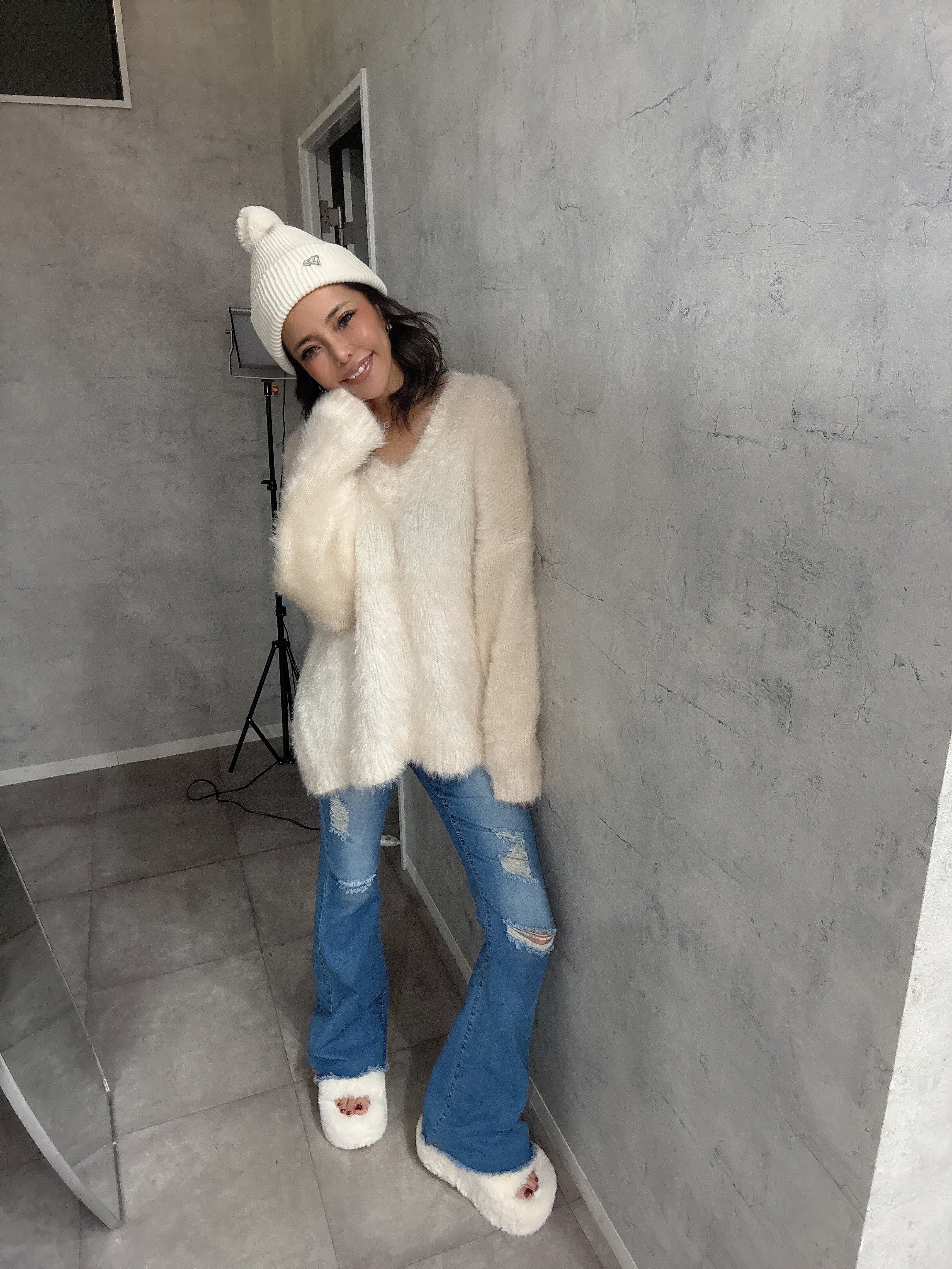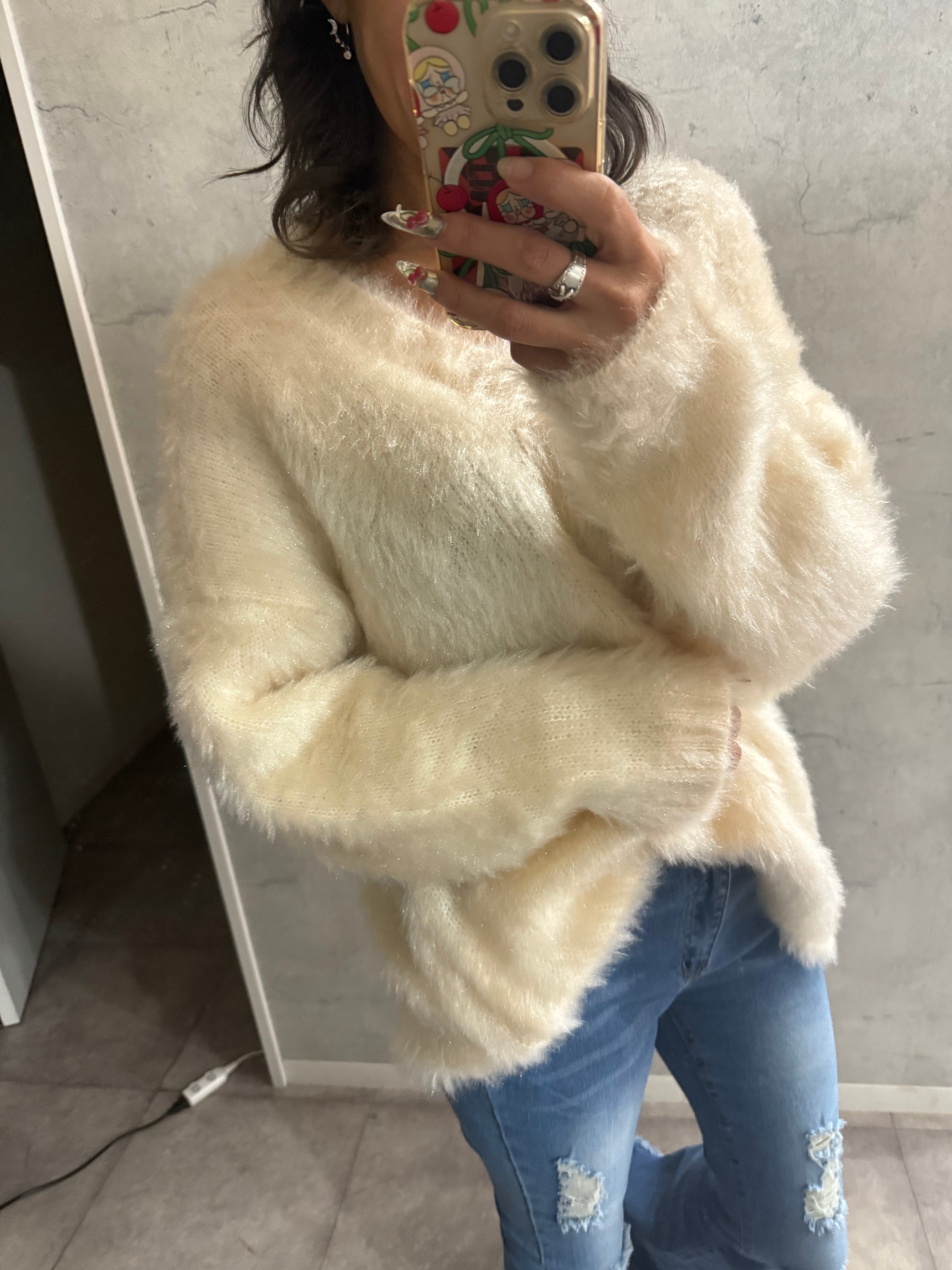 ふわふわとした毛足が魅力のネコヤーン素材を使用したVネックニット。