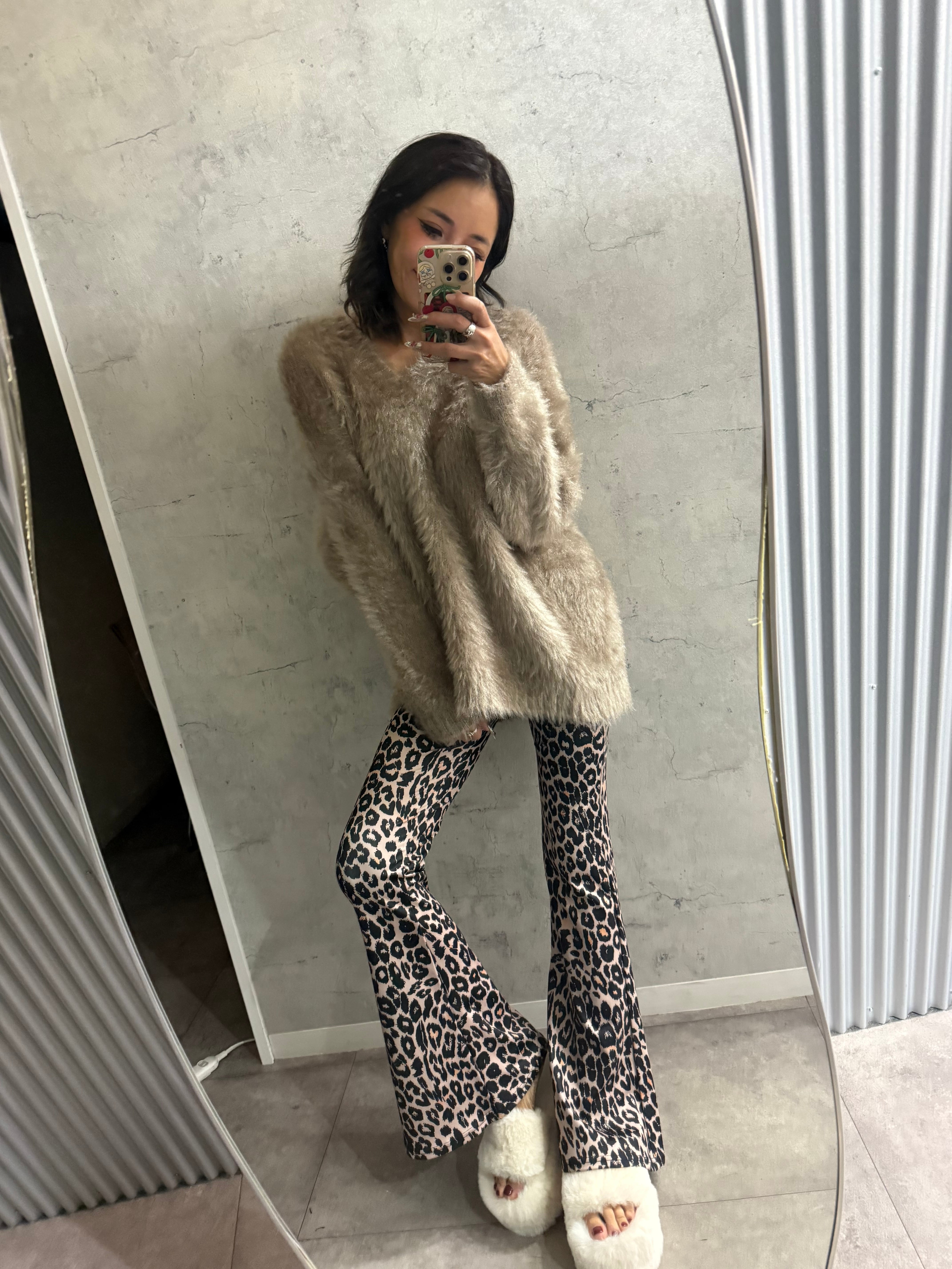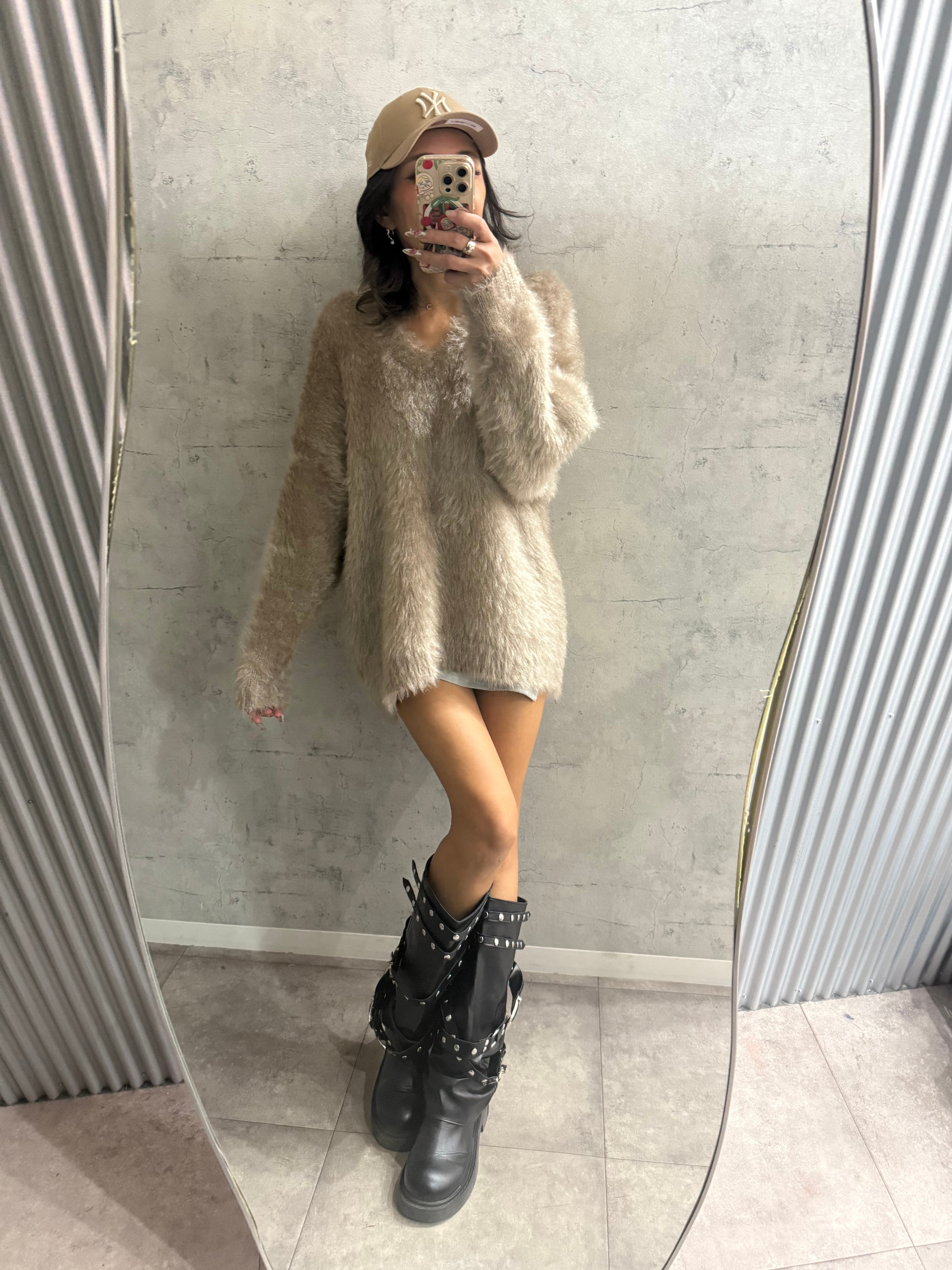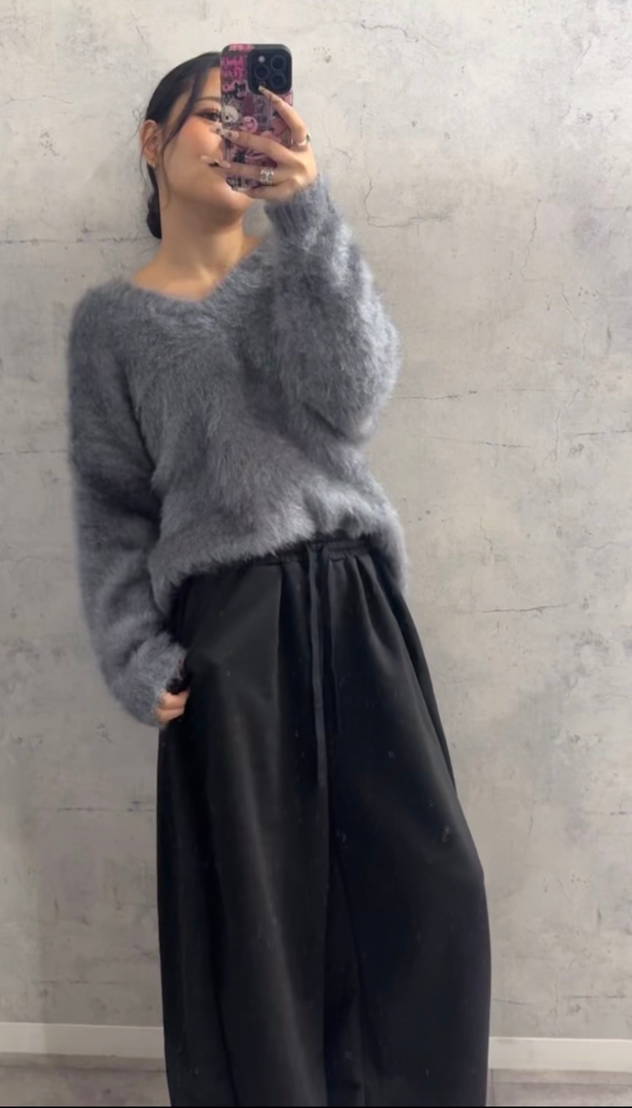 ふわふわとした毛足が魅力のネコヤーン素材を使用したVネックニット。
