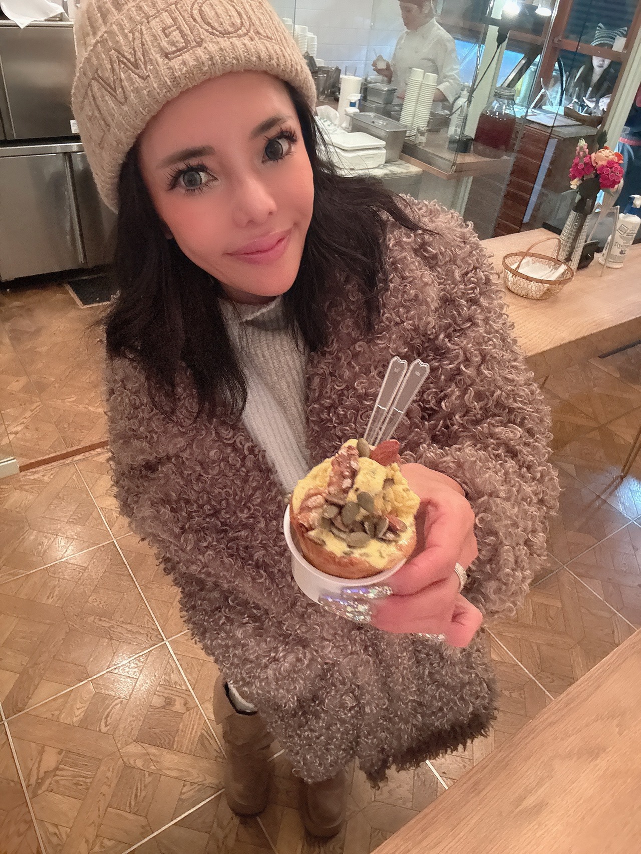 ベージュラスト2モテと防寒!プードルファーミドルコート