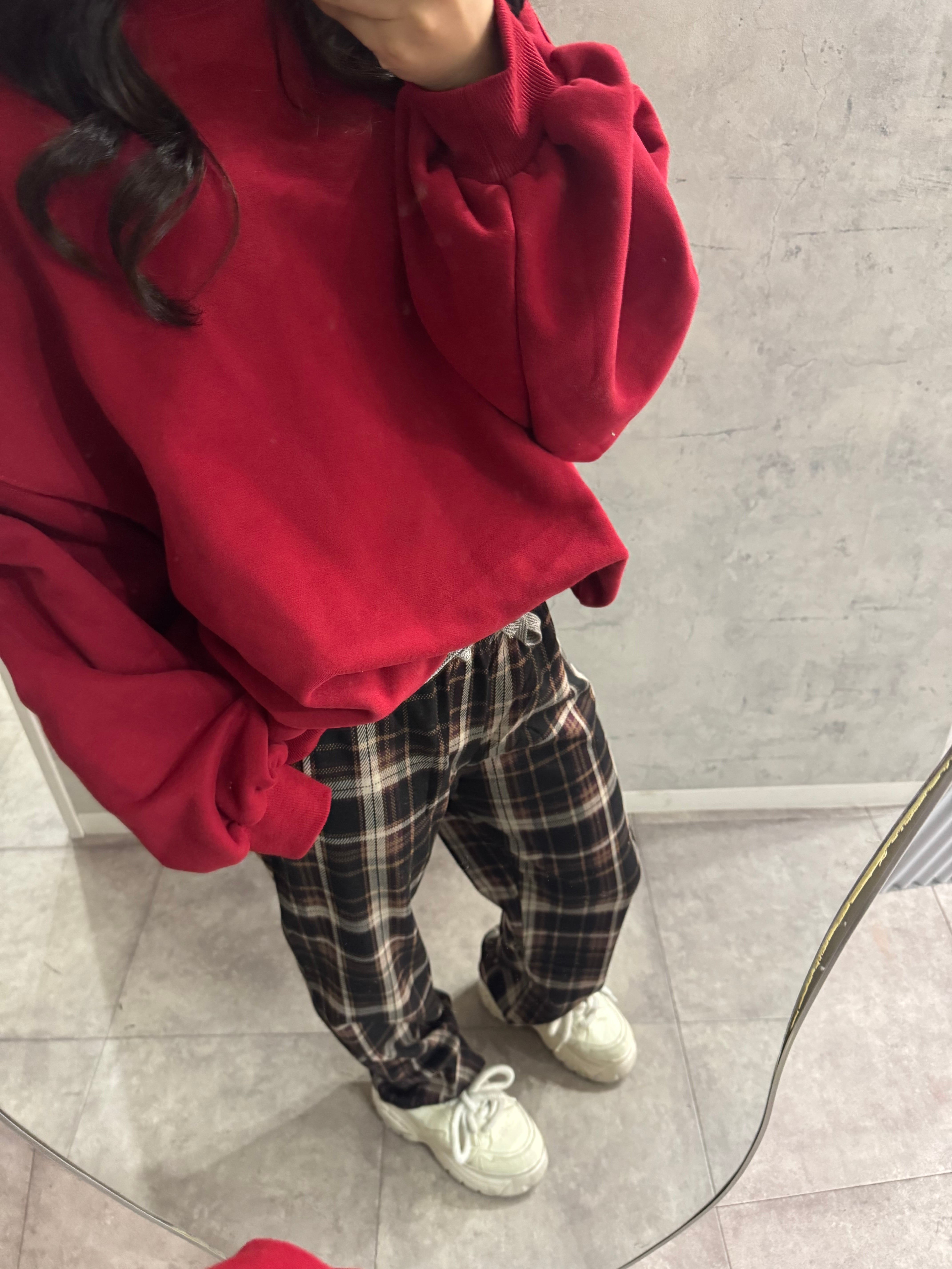 チェック柄ワイドパンツ。