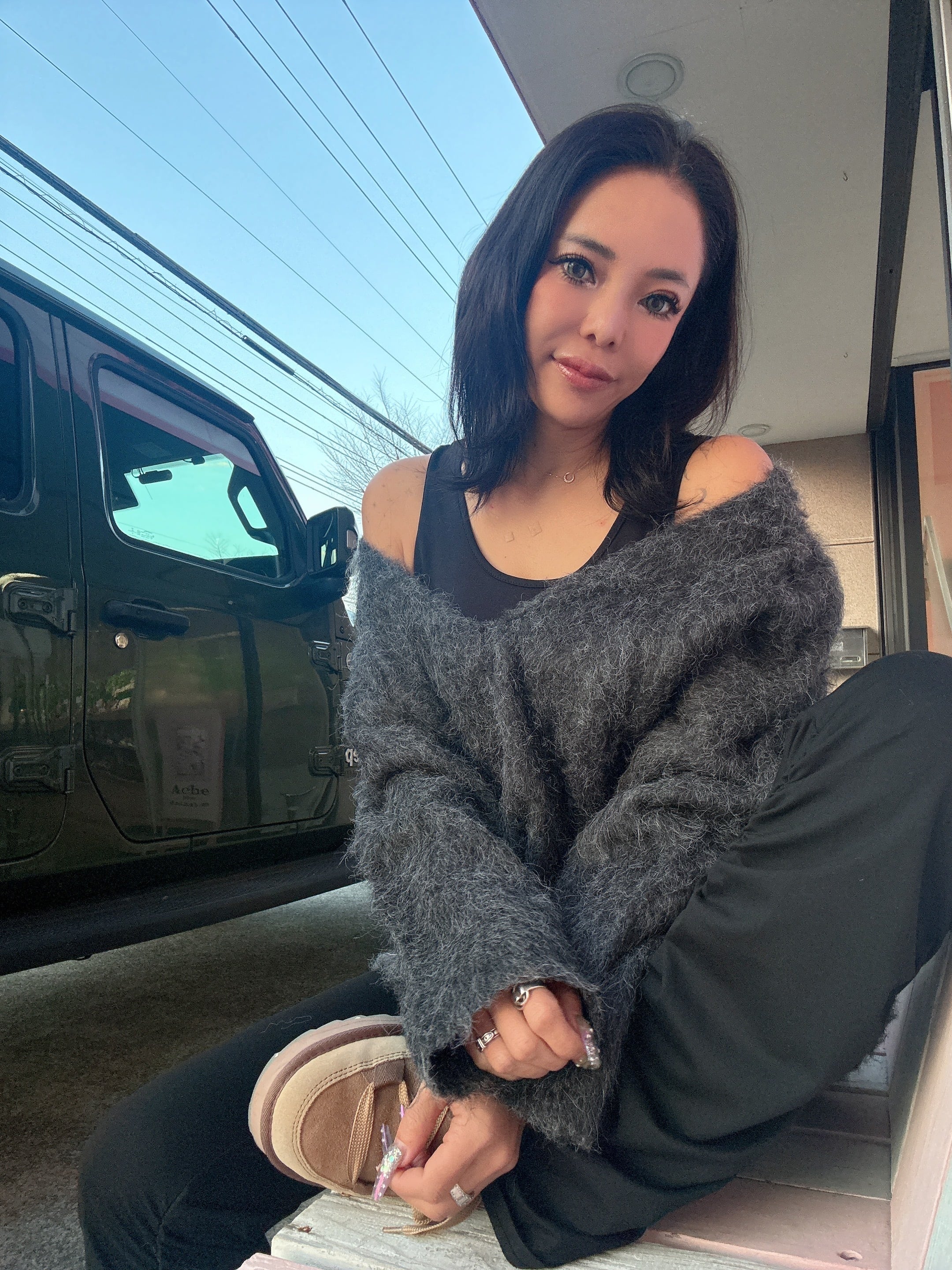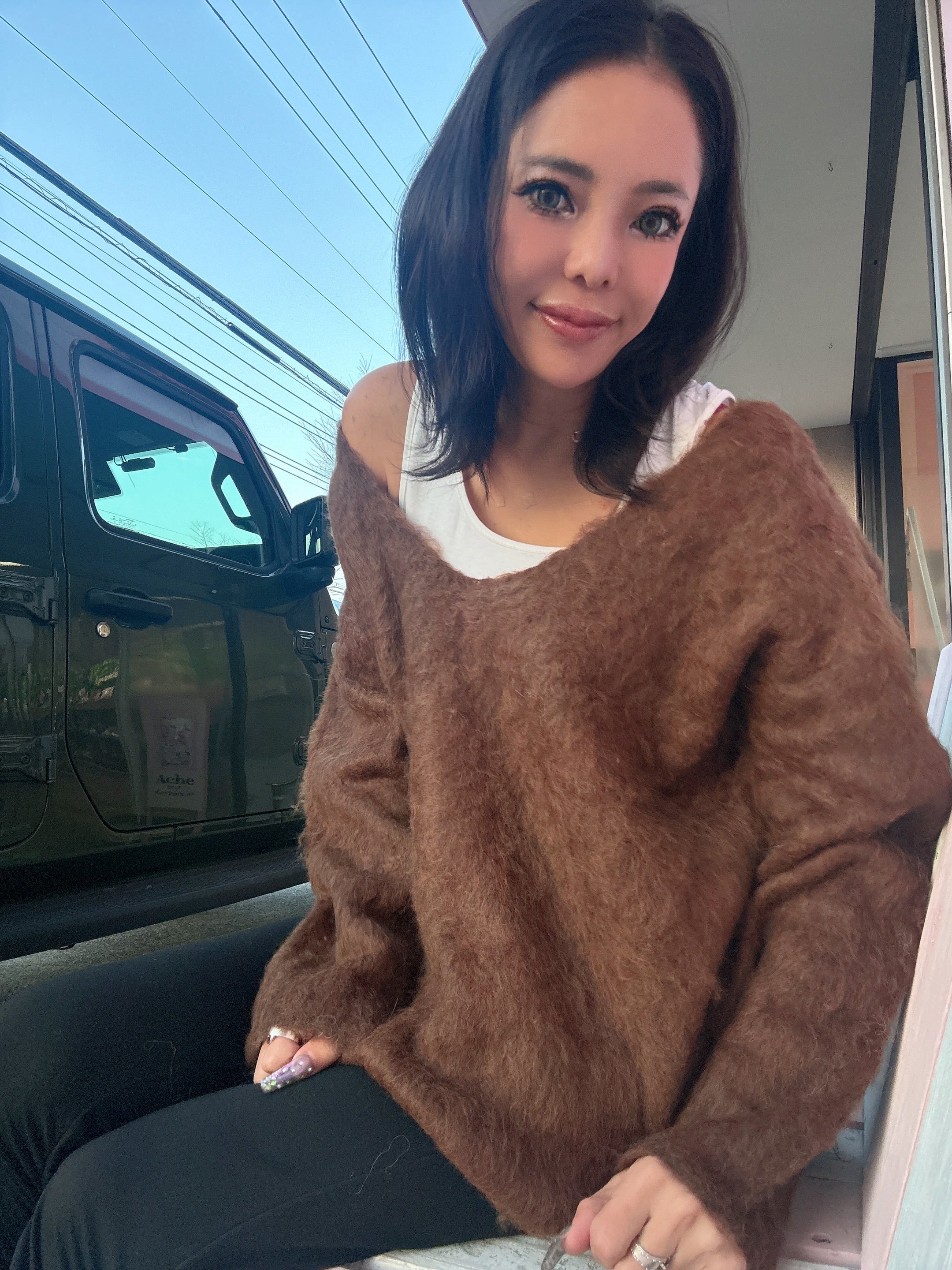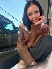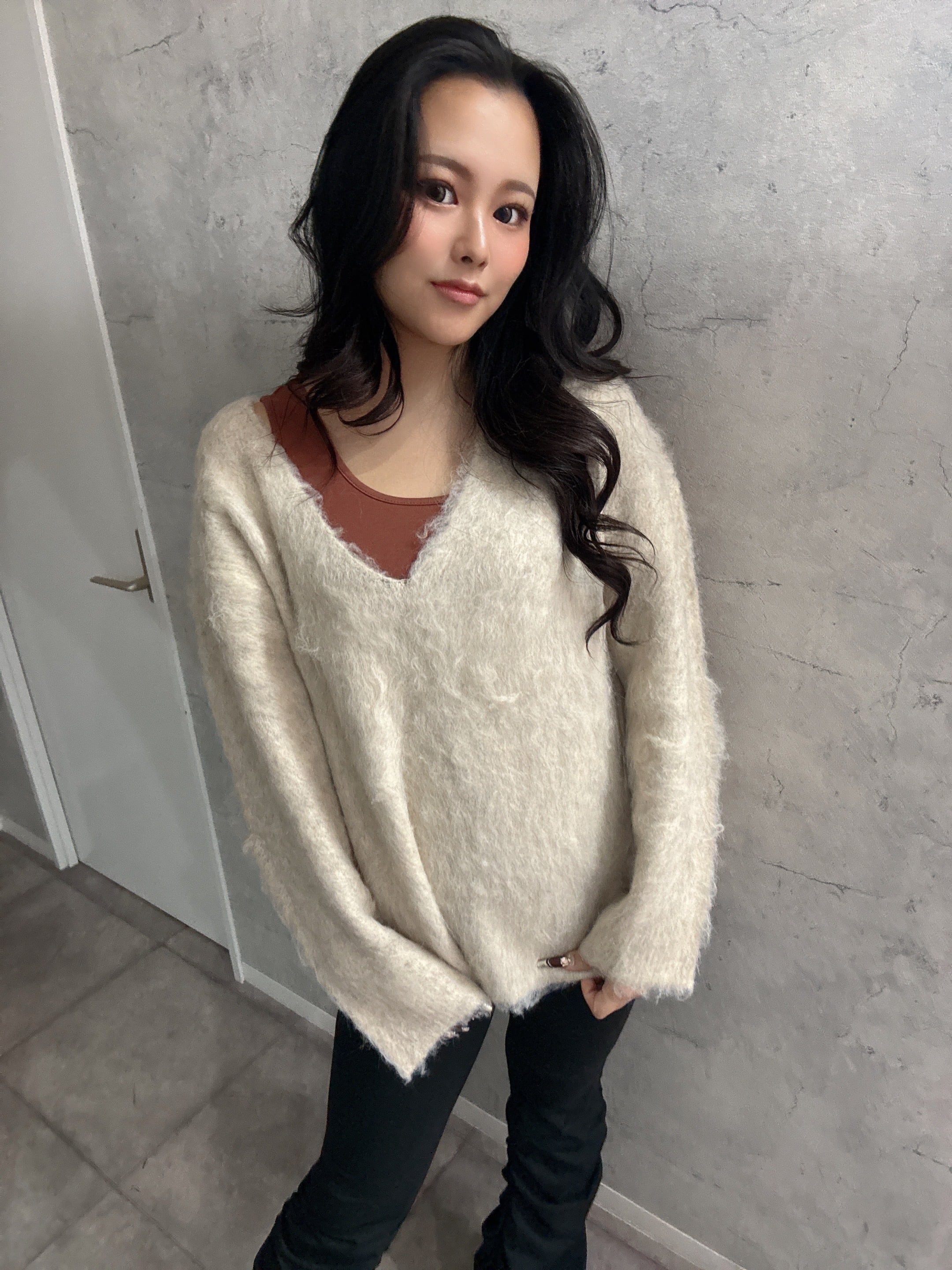 ・深Vネックでインナーを見せてトレンドコーデの完成