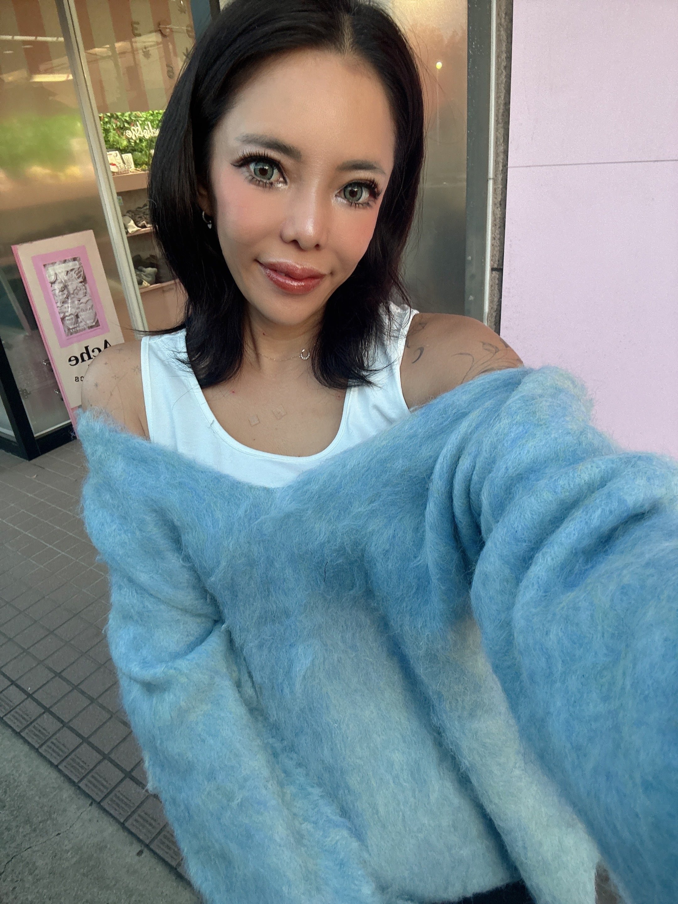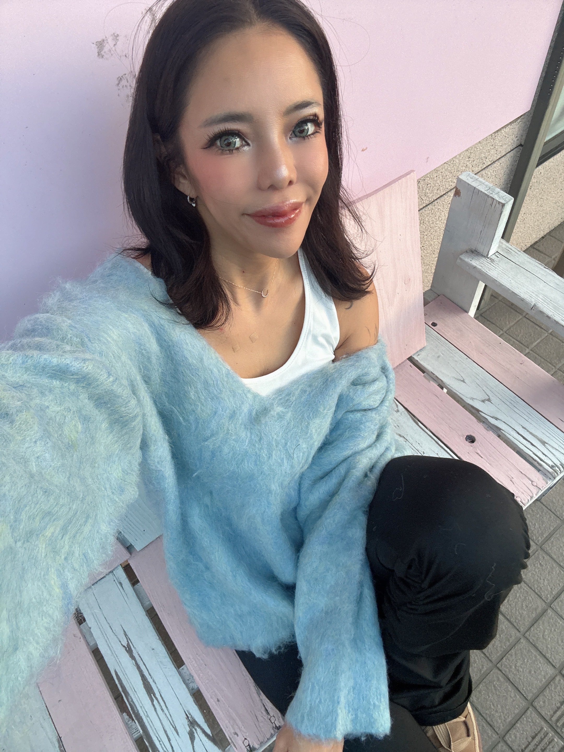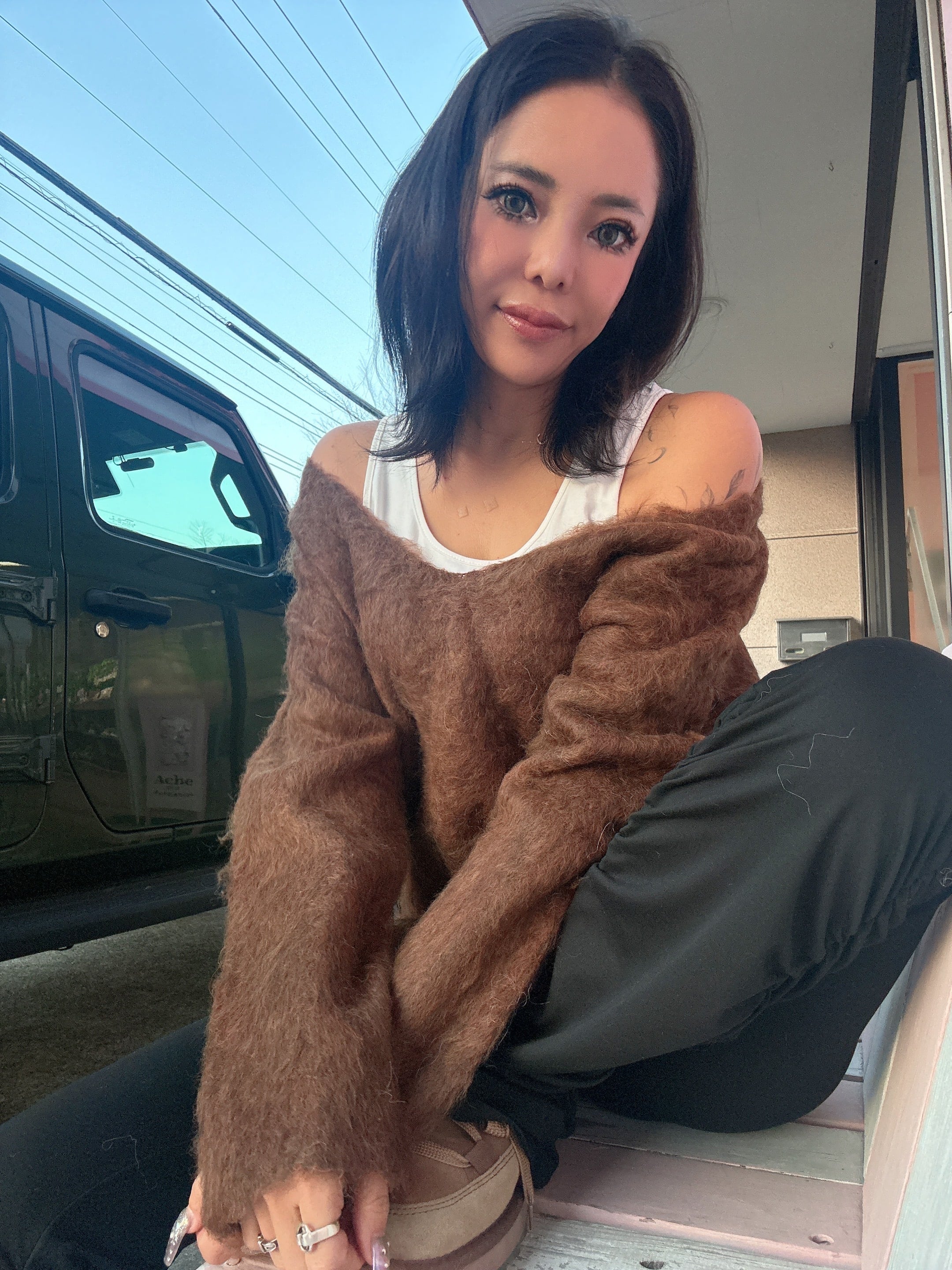 ・深Vネックでインナーを見せてトレンドコーデの完成