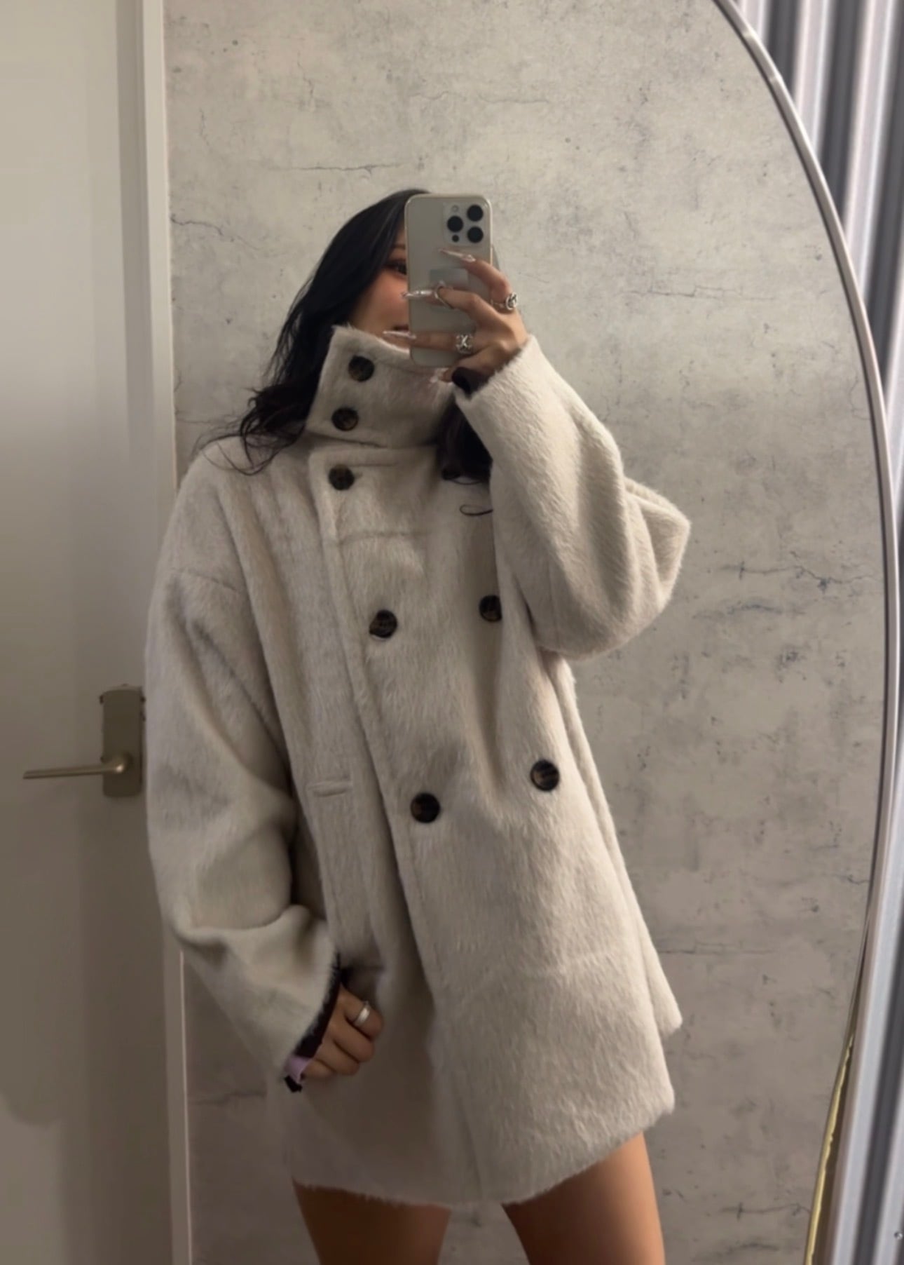 首元まであたたかく包む、上品シャギーのスタンドカラーコート小顔効果バッチリ!