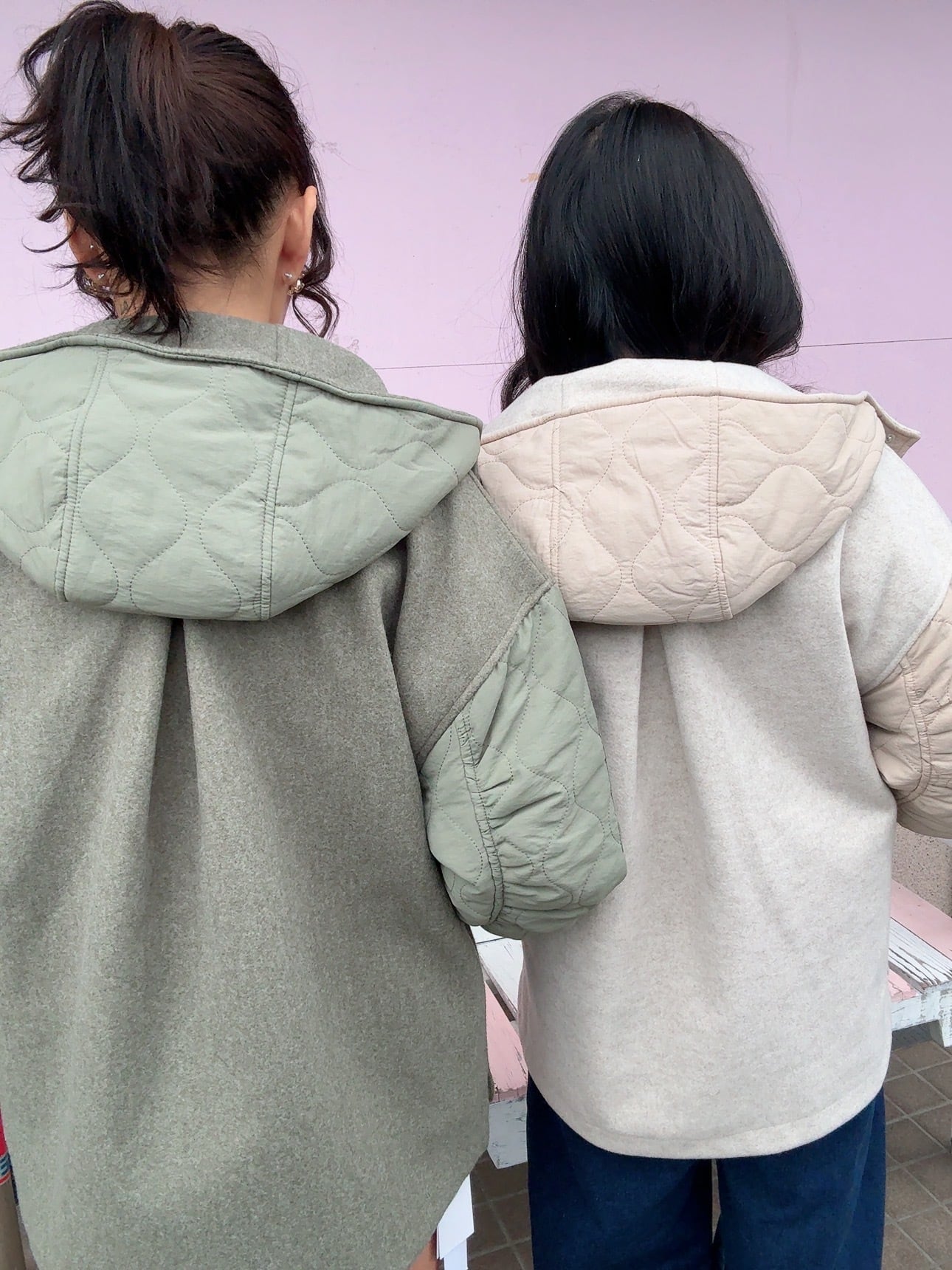 ウールライクな温もりとナイロンキルティングの軽やかさを掛け合わせた、異素材ミックスのフードブルゾン。柔らかくメランジ感のあるウールライク素材を身頃に使用し、袖とフードにはキルトナイロンを配した、冬のカジュアルスタイルに映える1着です。