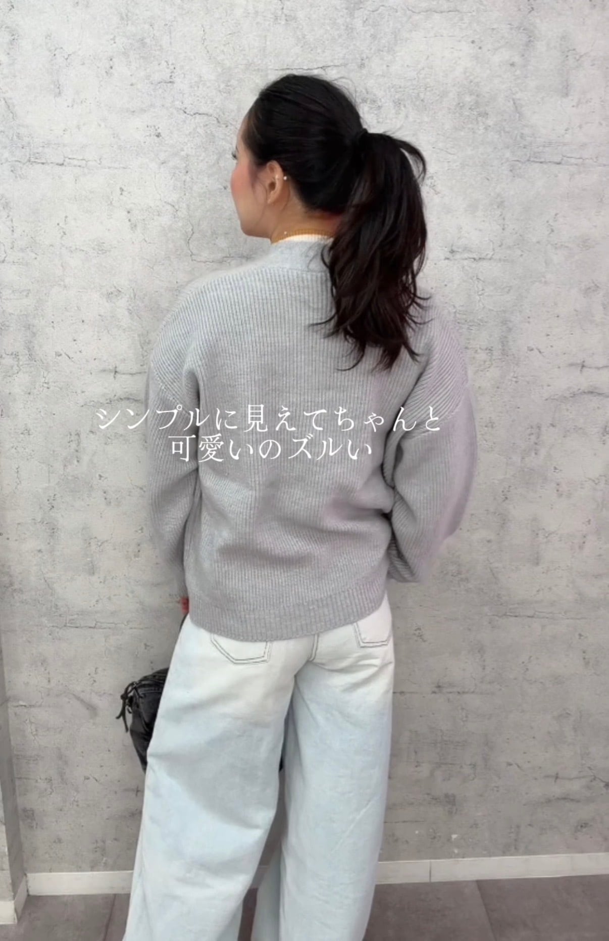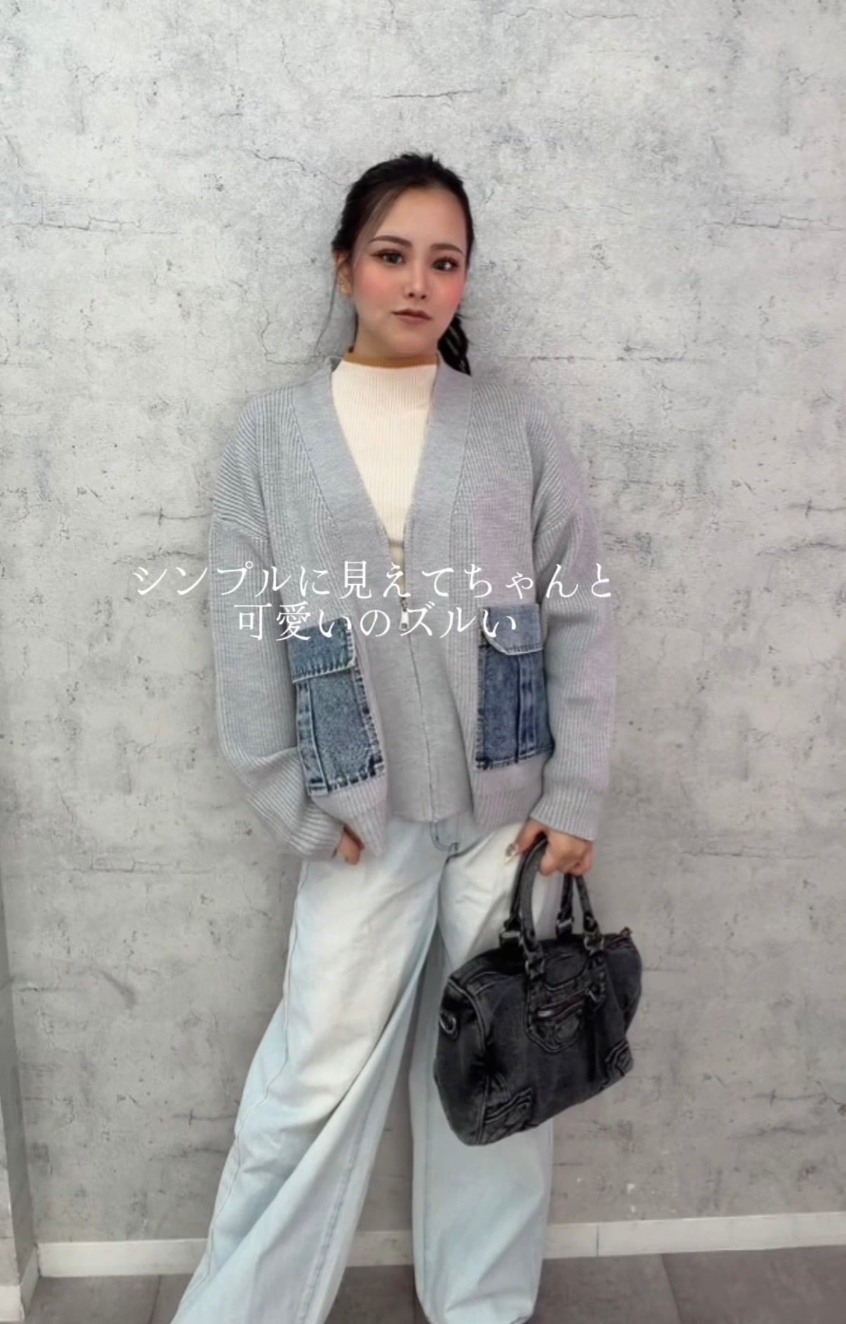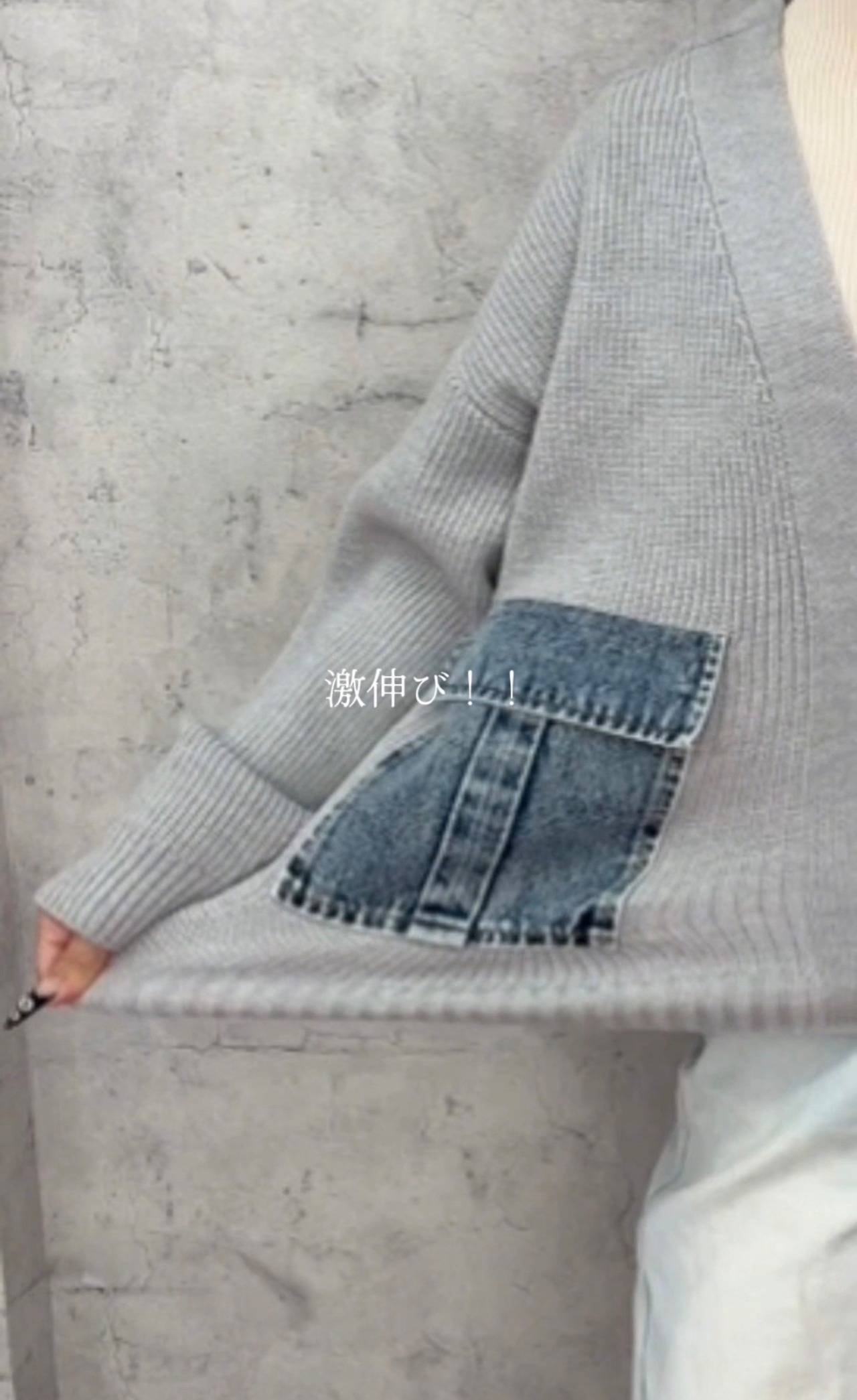 ざっくりとしたリブ編みのニットに、デニム素材を組み合わせることで、