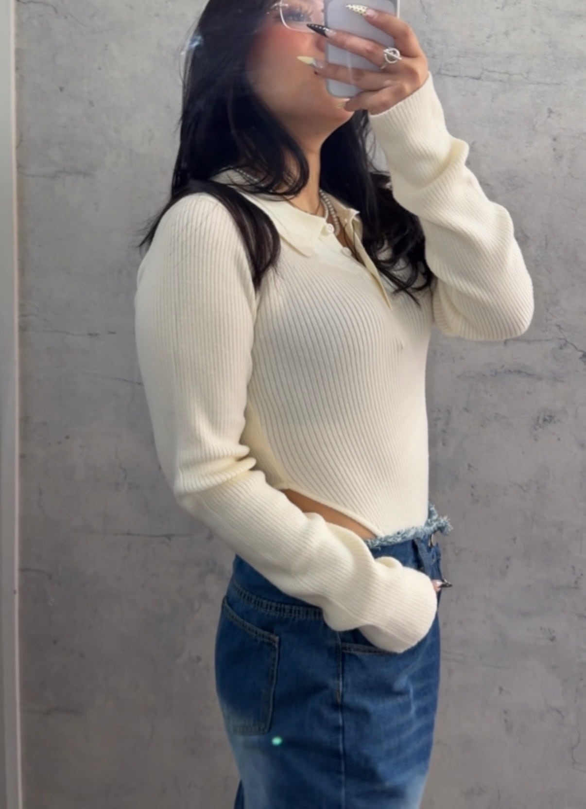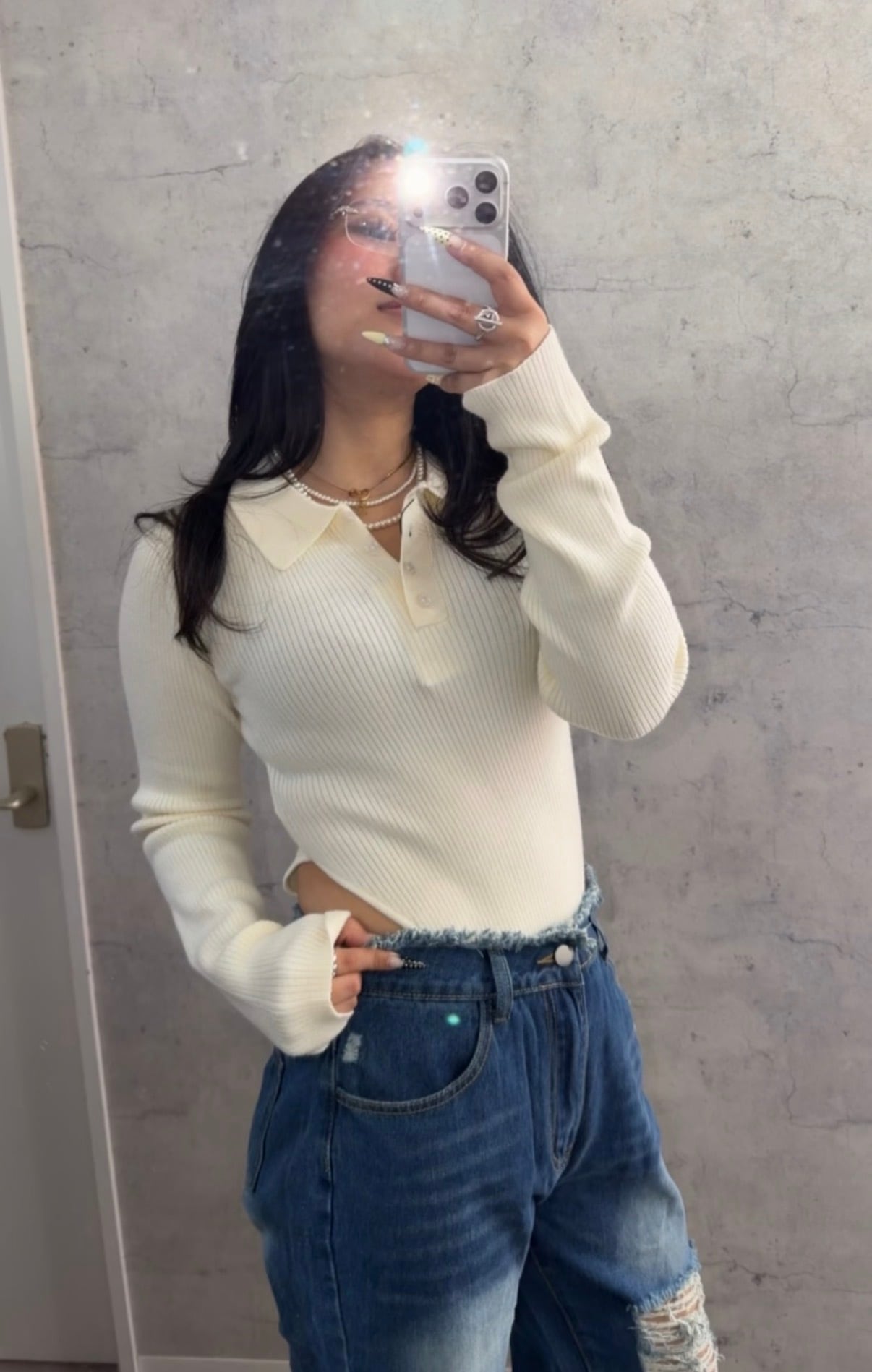 ・首元はポロ襟デザインでトレンドを押さえた一着