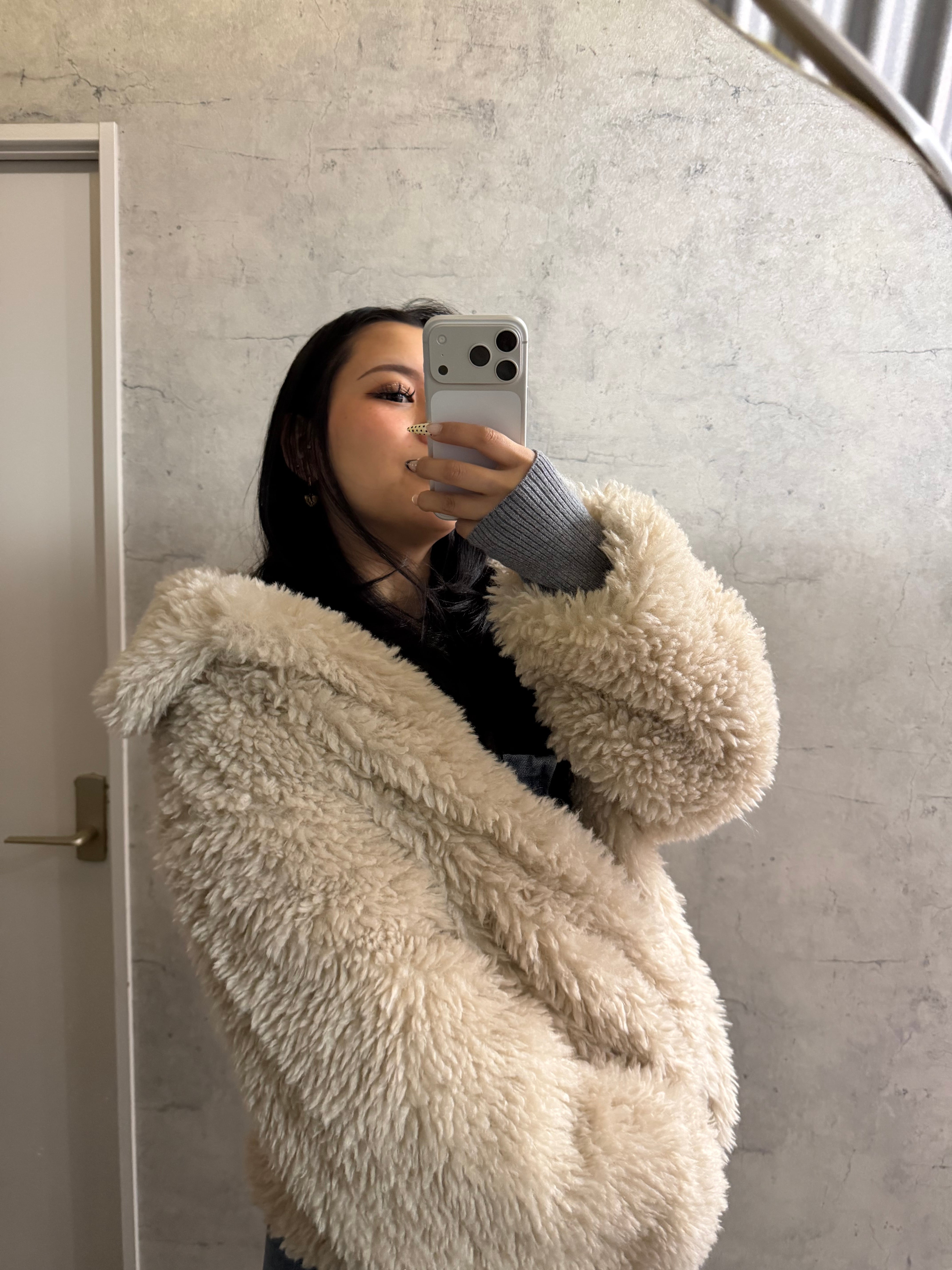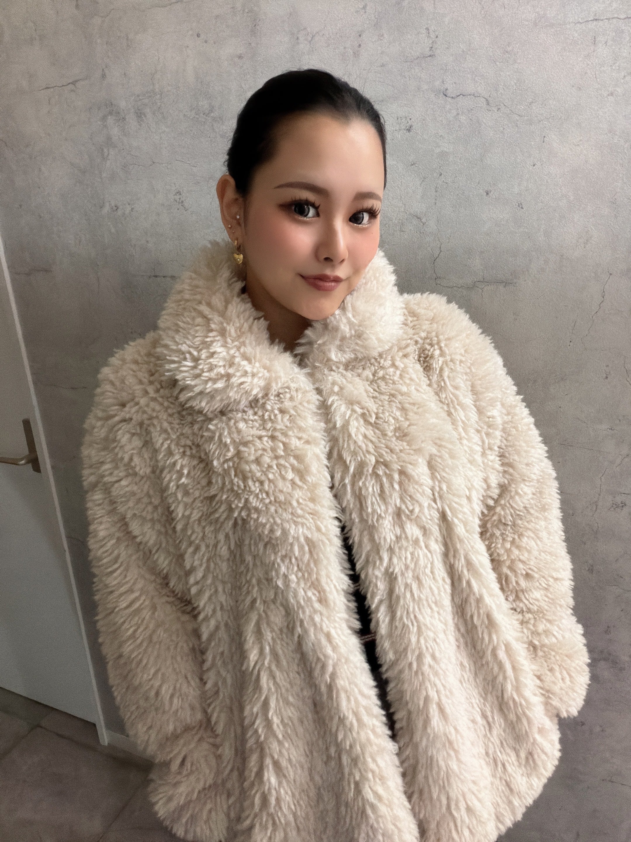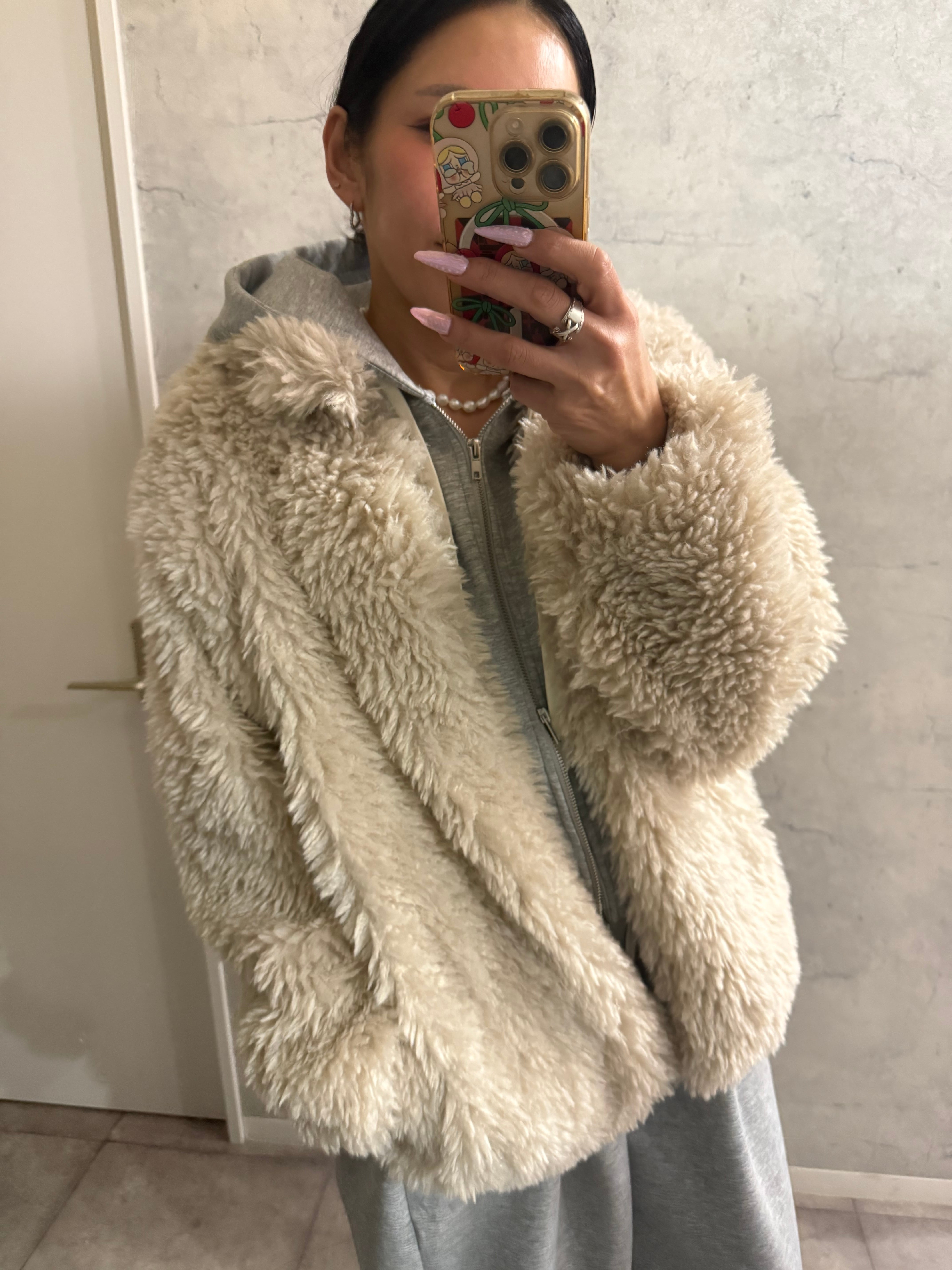 柔らかくボリューム感のあるシープファー素材を使用し、羽織るだけで上品かつ暖かい印象に