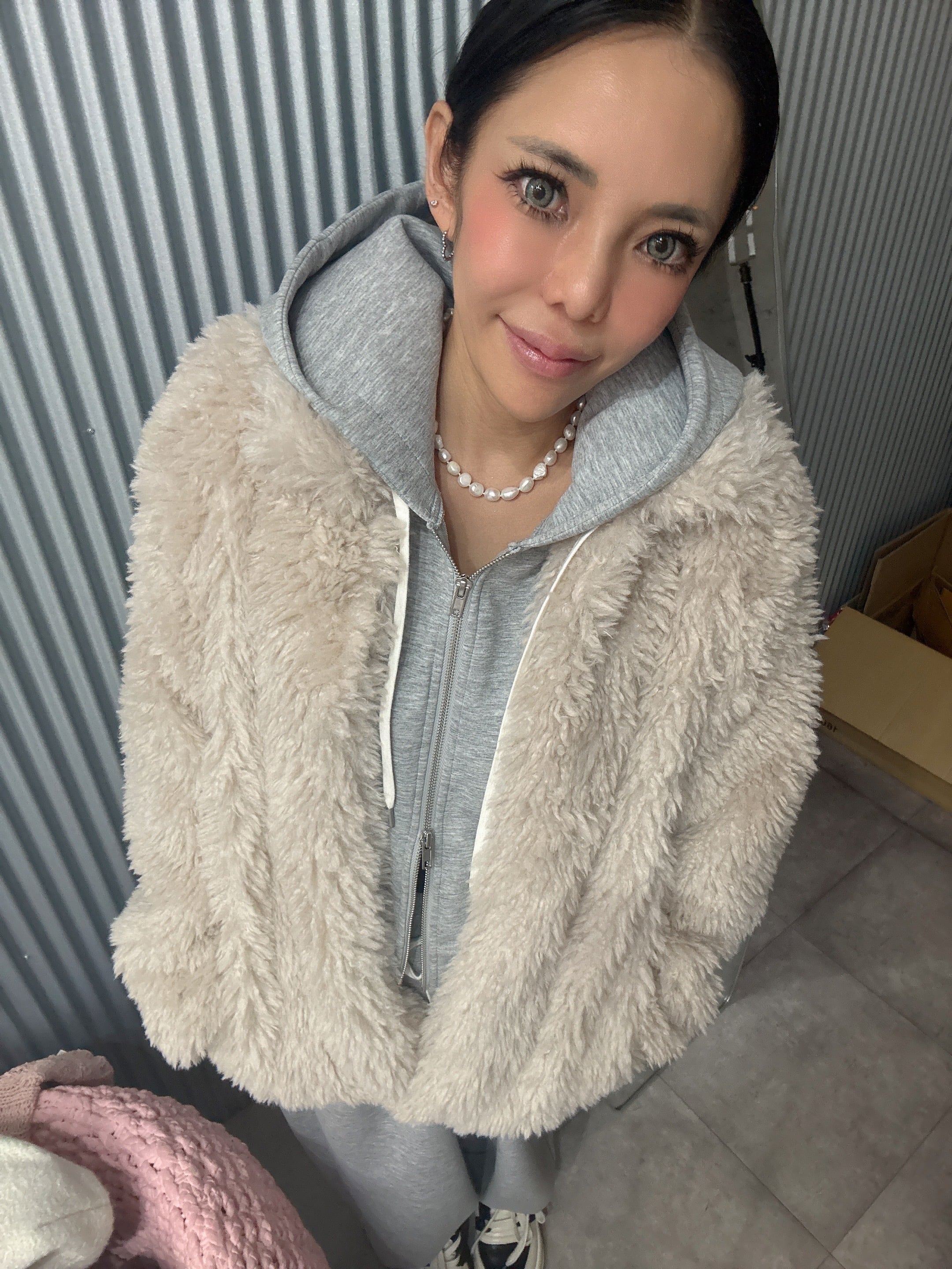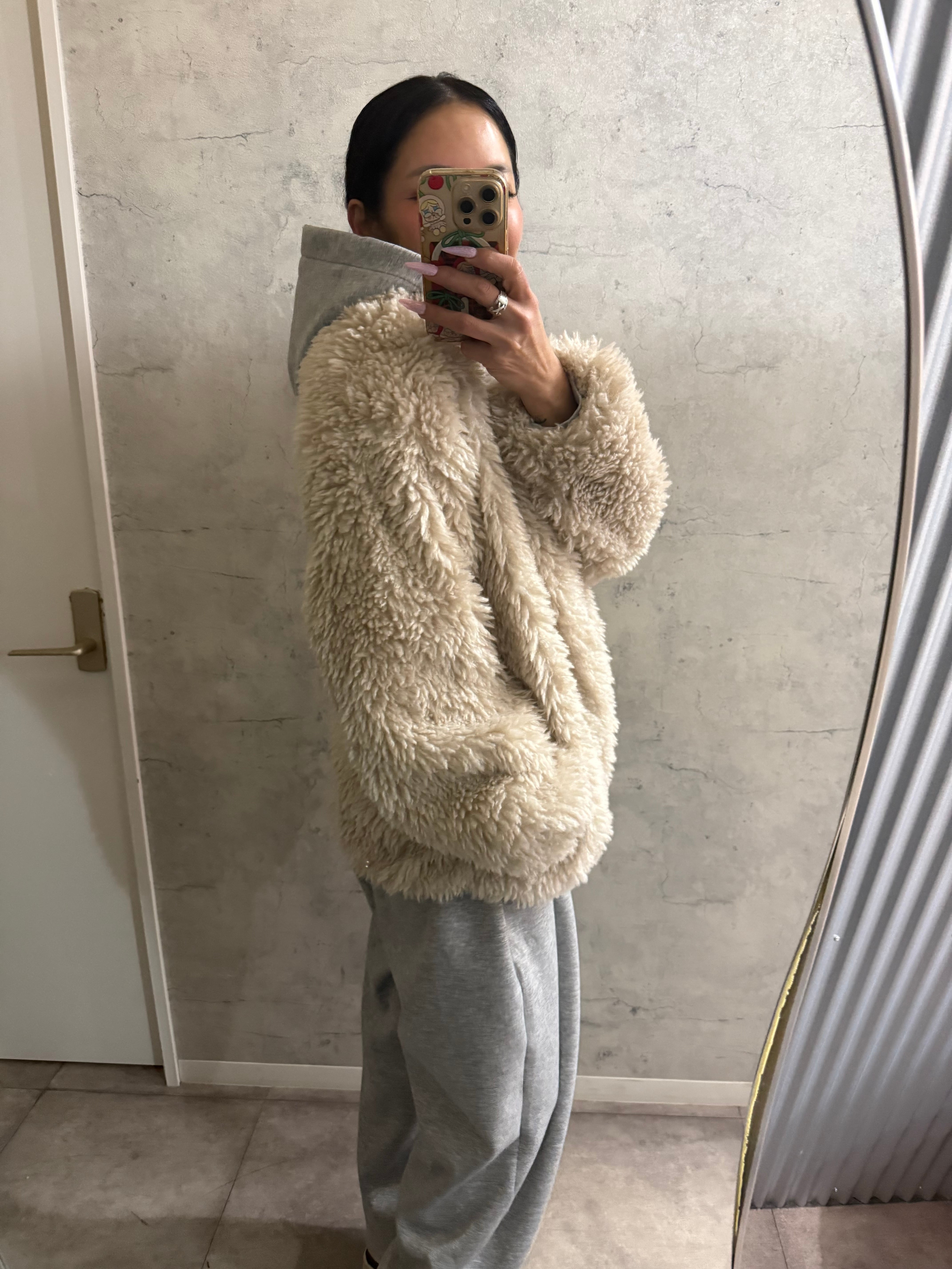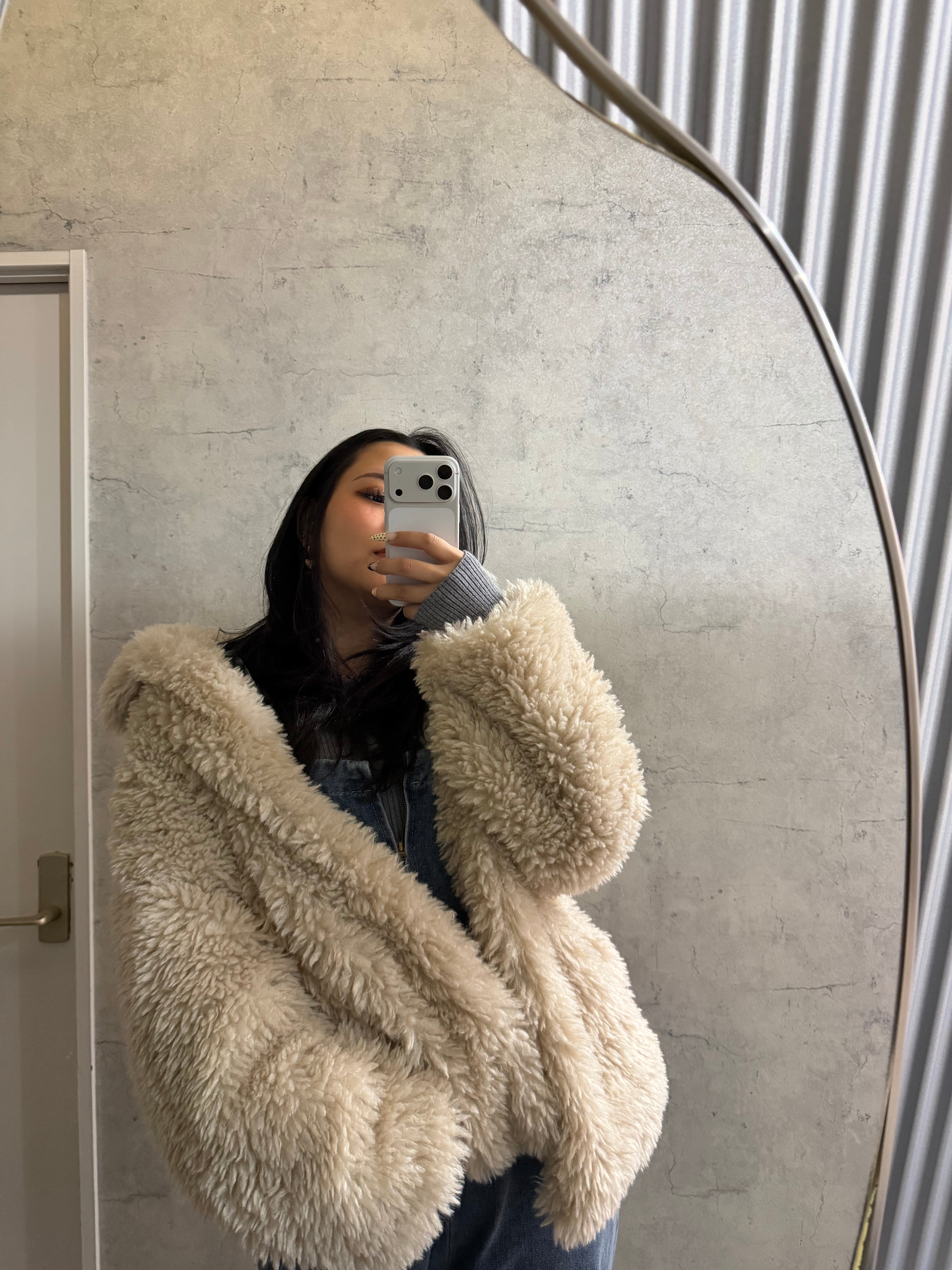 柔らかくボリューム感のあるシープファー素材を使用し、羽織るだけで上品かつ暖かい印象に