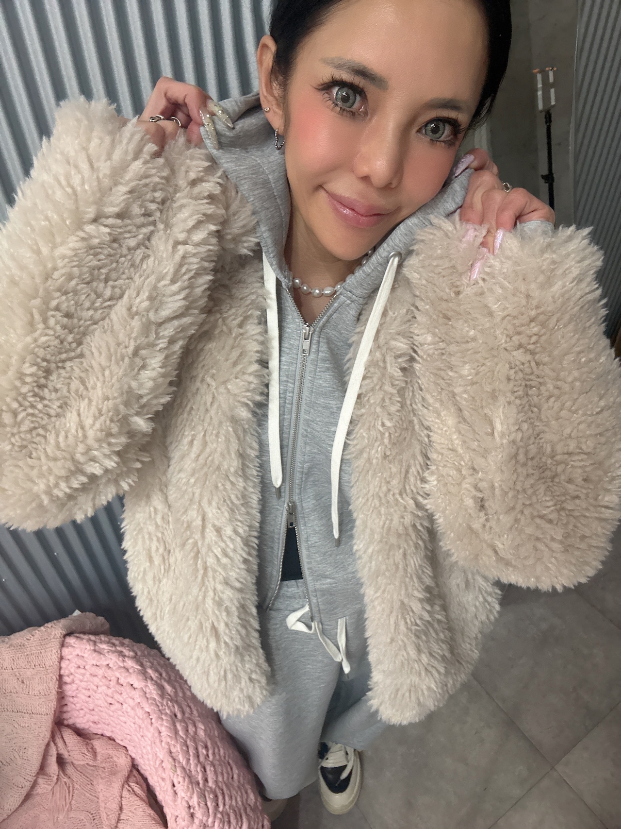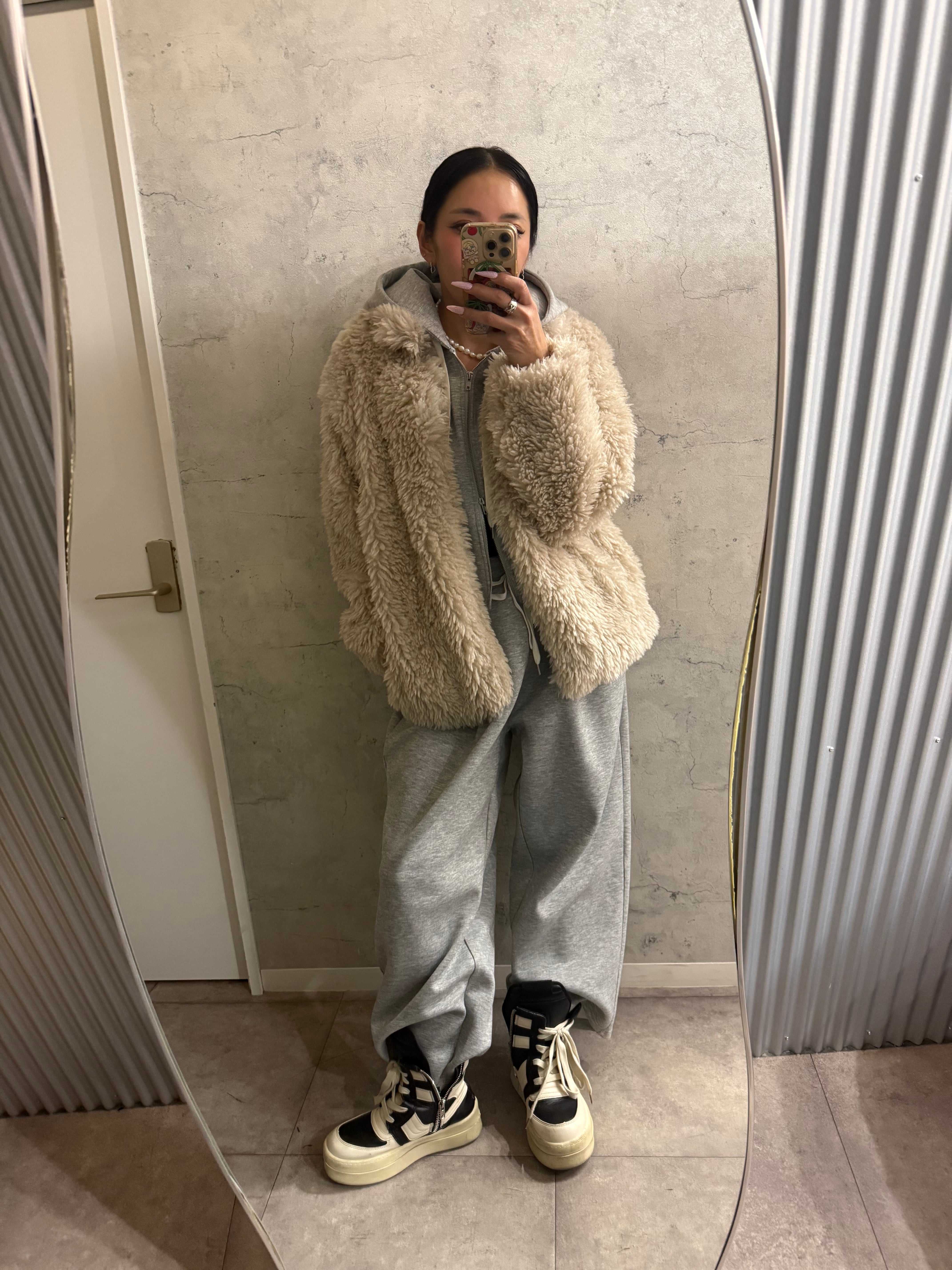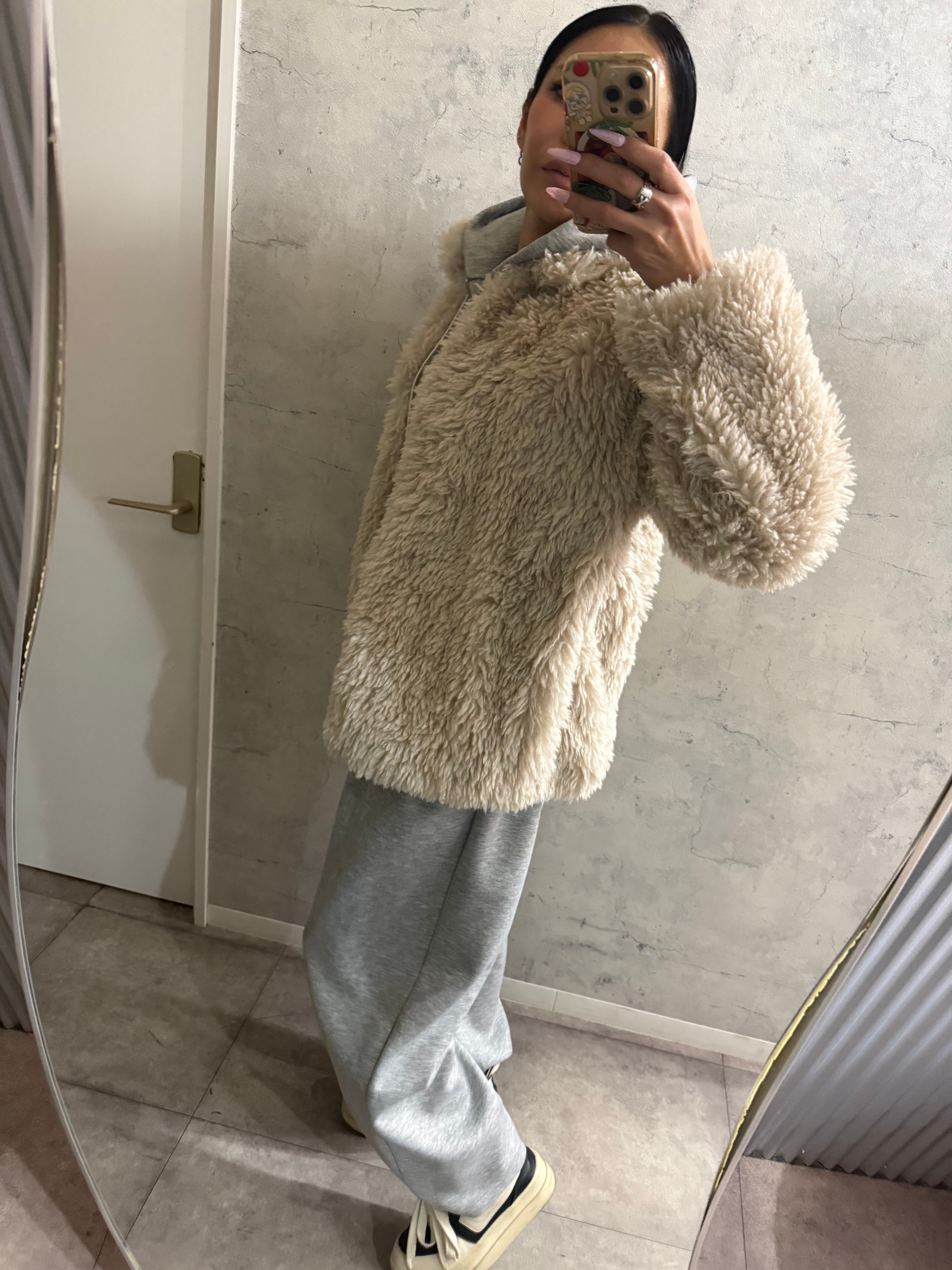柔らかなシープファーの質感を活かし、デニムやワイドパンツでカジュアルダウンしても、