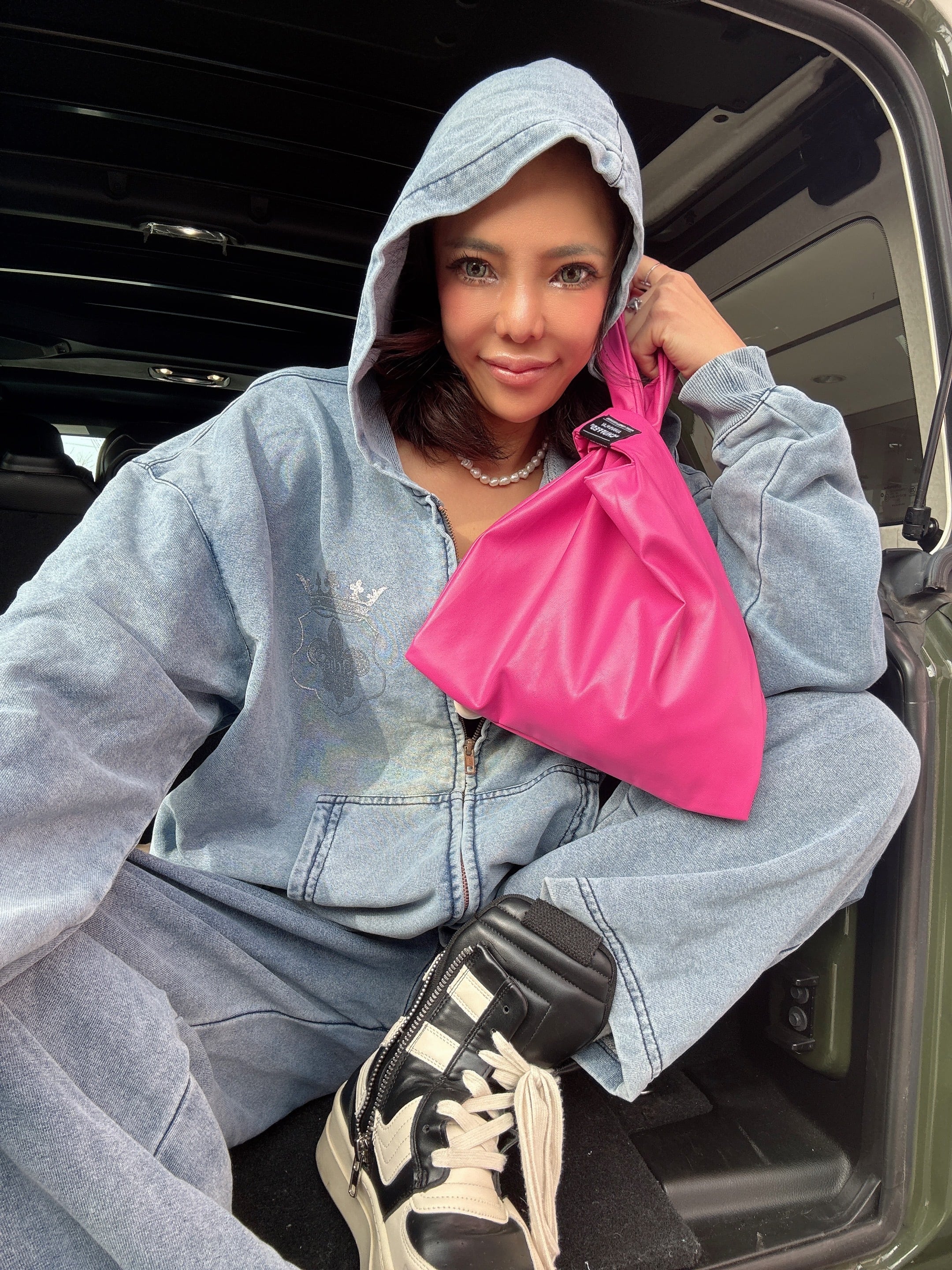オリジナルのピスネームロゴとフェイクレザーで、小ぶりながら存在感のあるミニハンドバッグです。