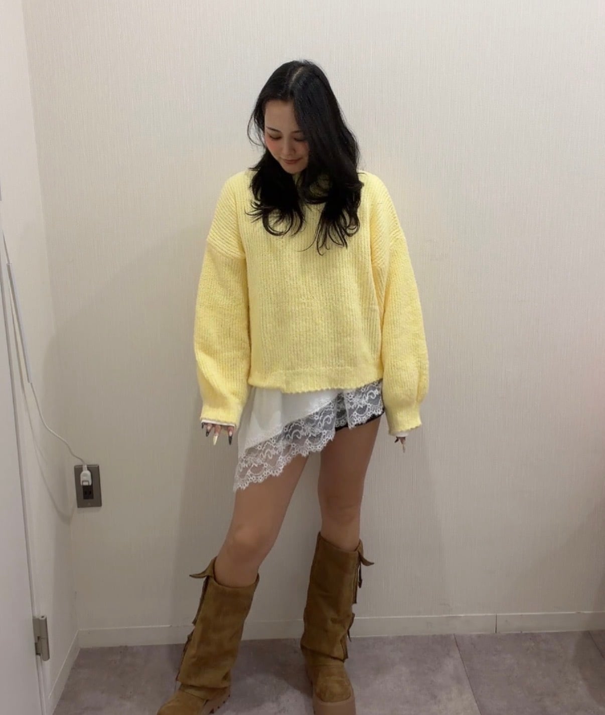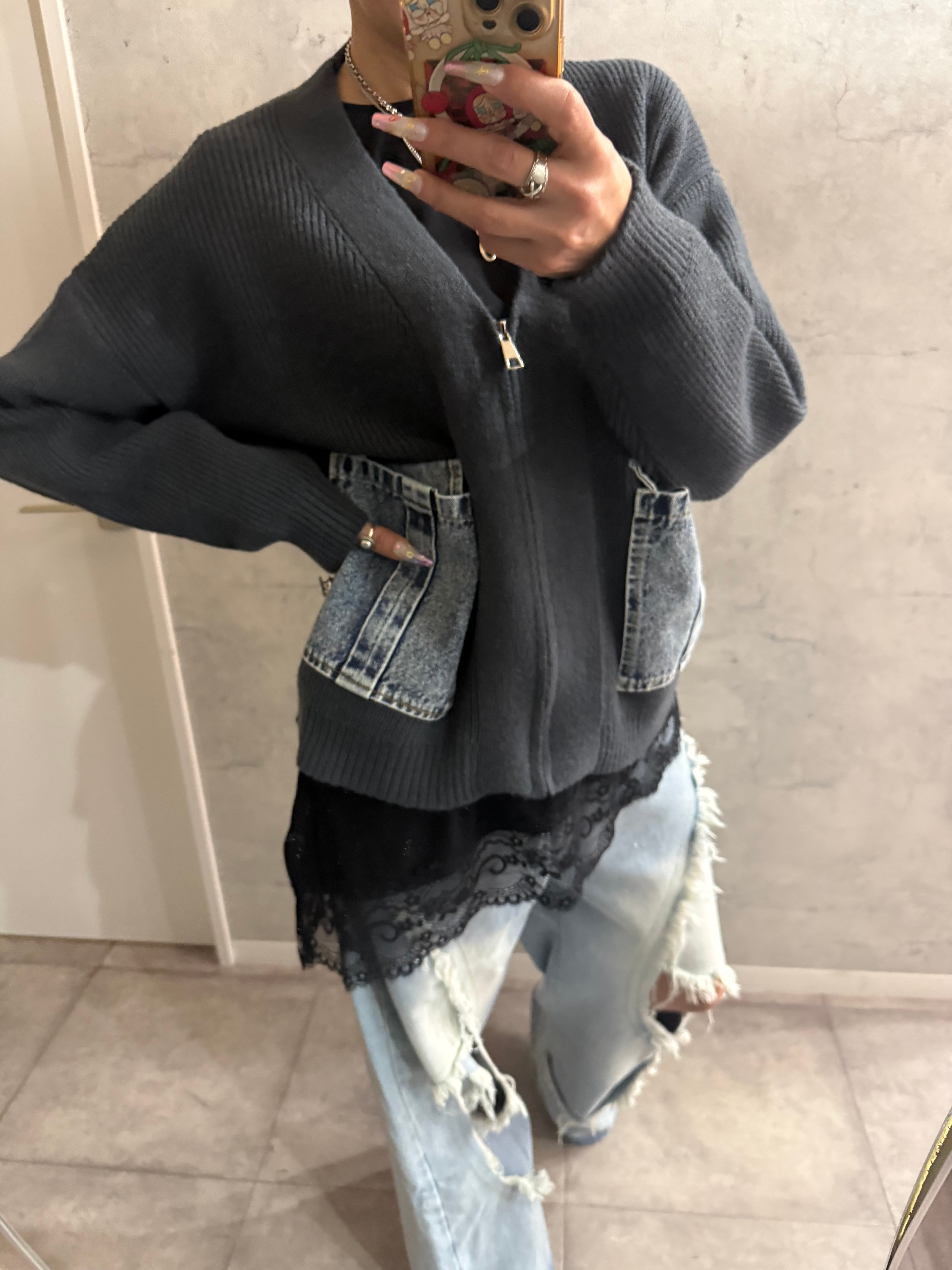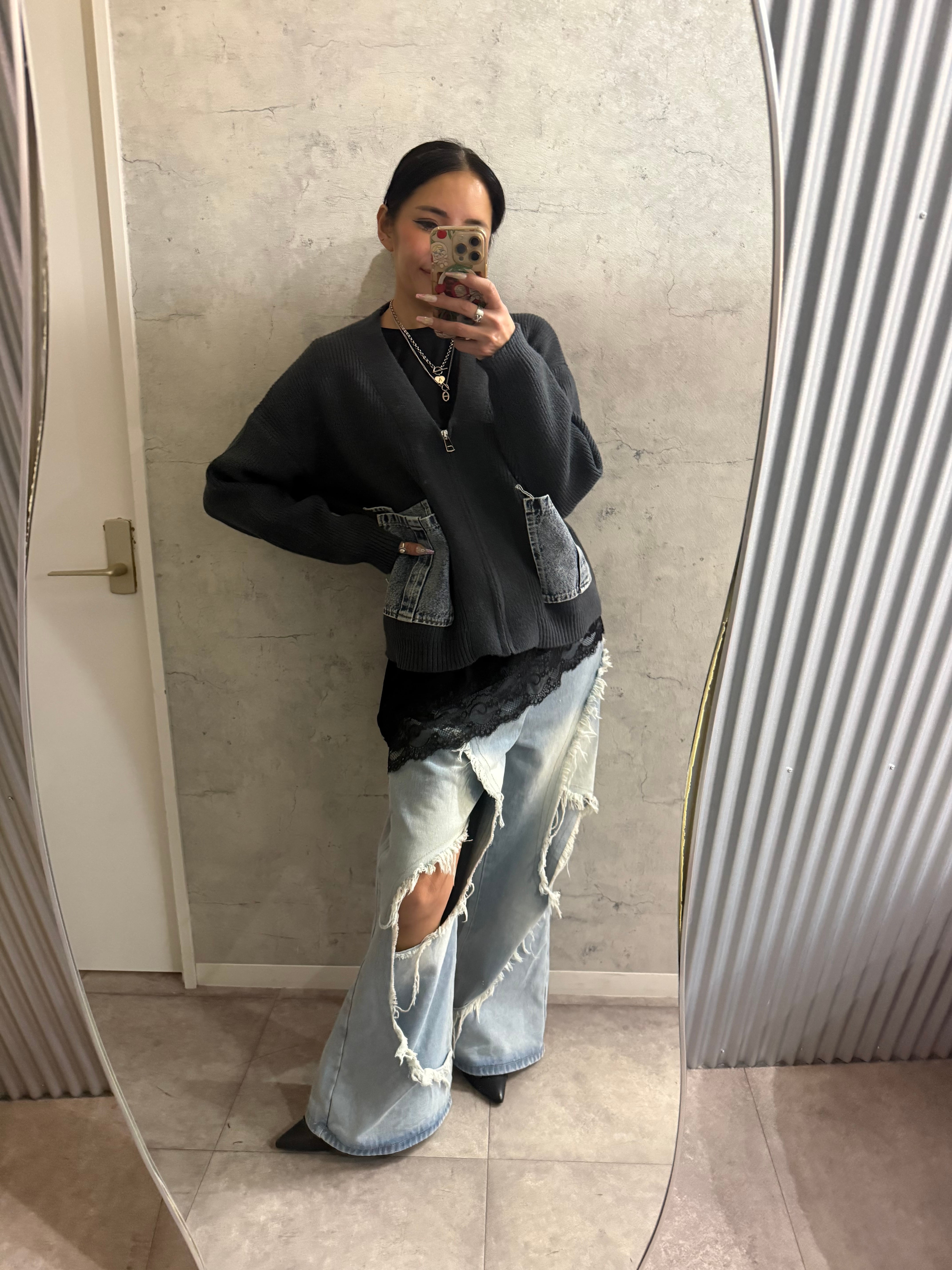 アシメデザインで、ニットやスウェットとレイヤードするだけで一気にこなれた印象に!