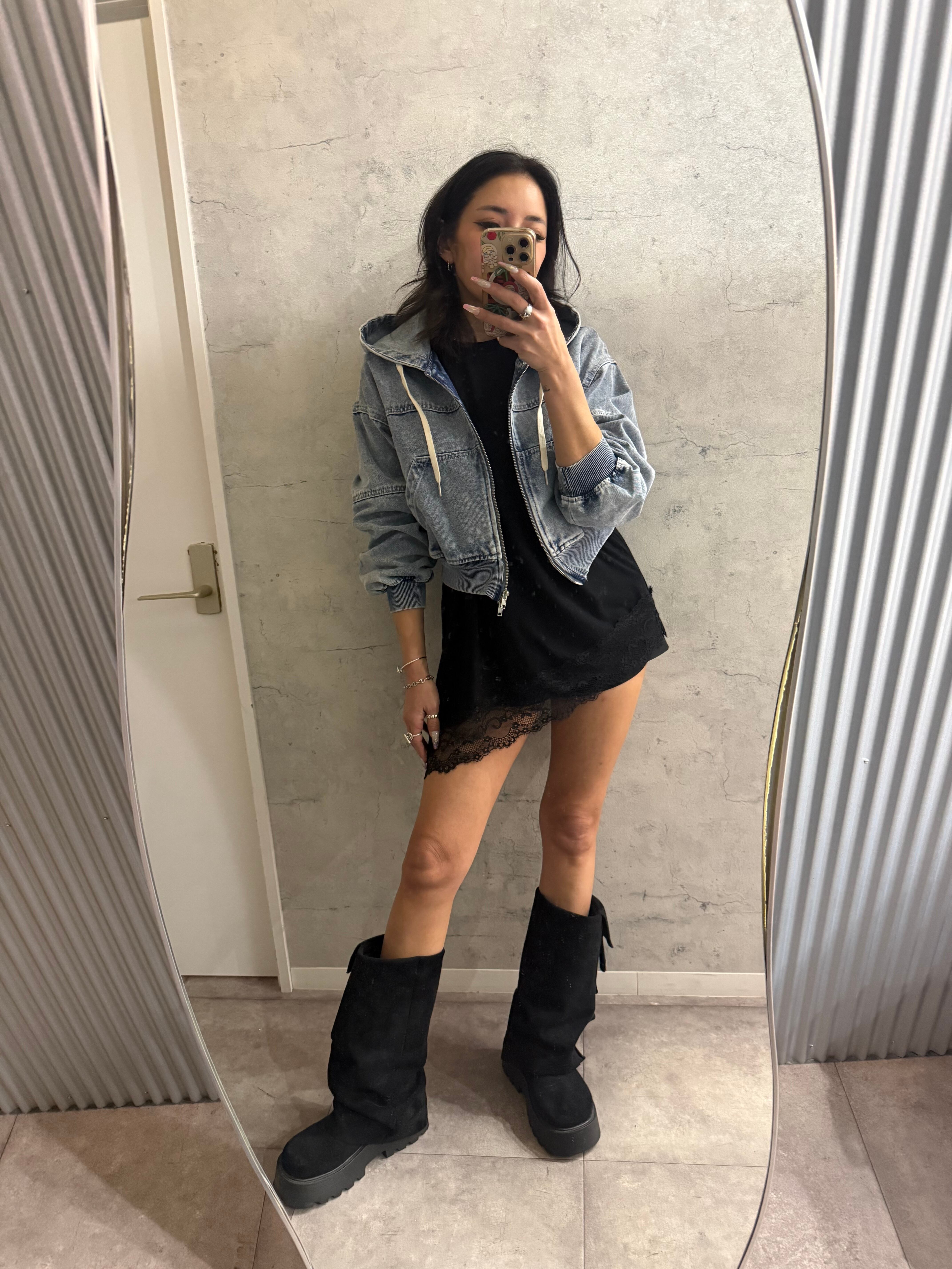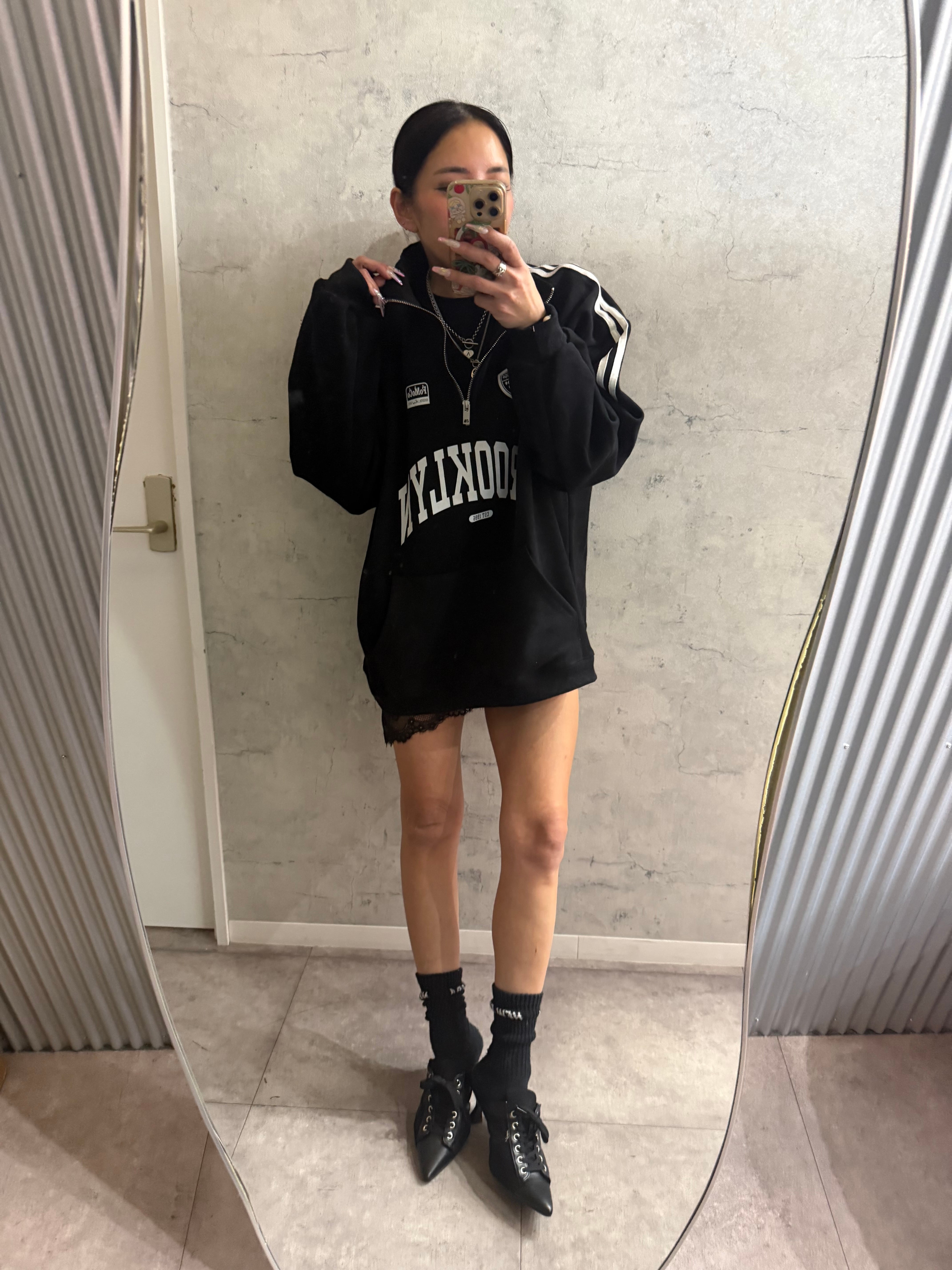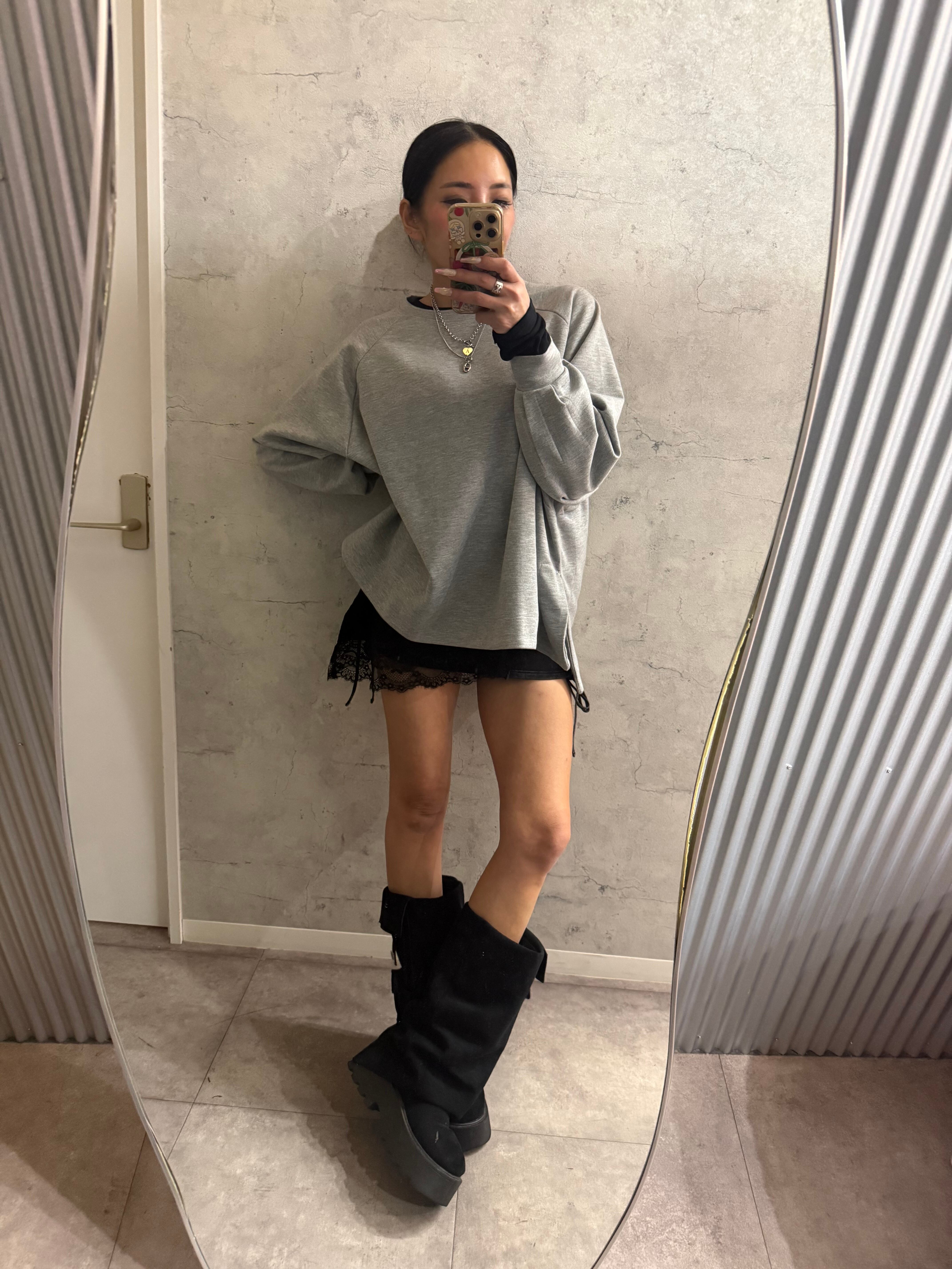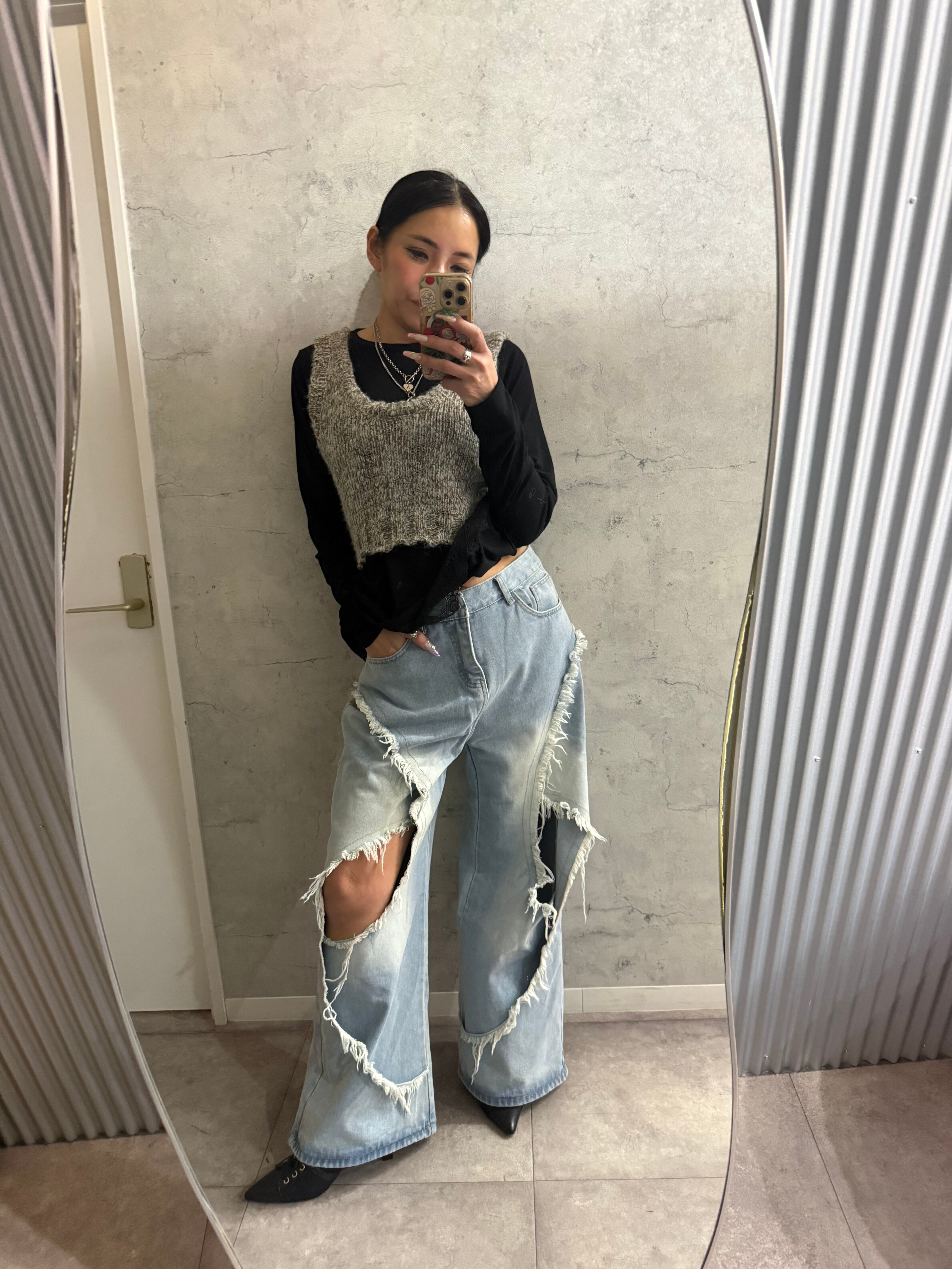 アシメデザインで、ニットやスウェットとレイヤードするだけで一気にこなれた印象に!
