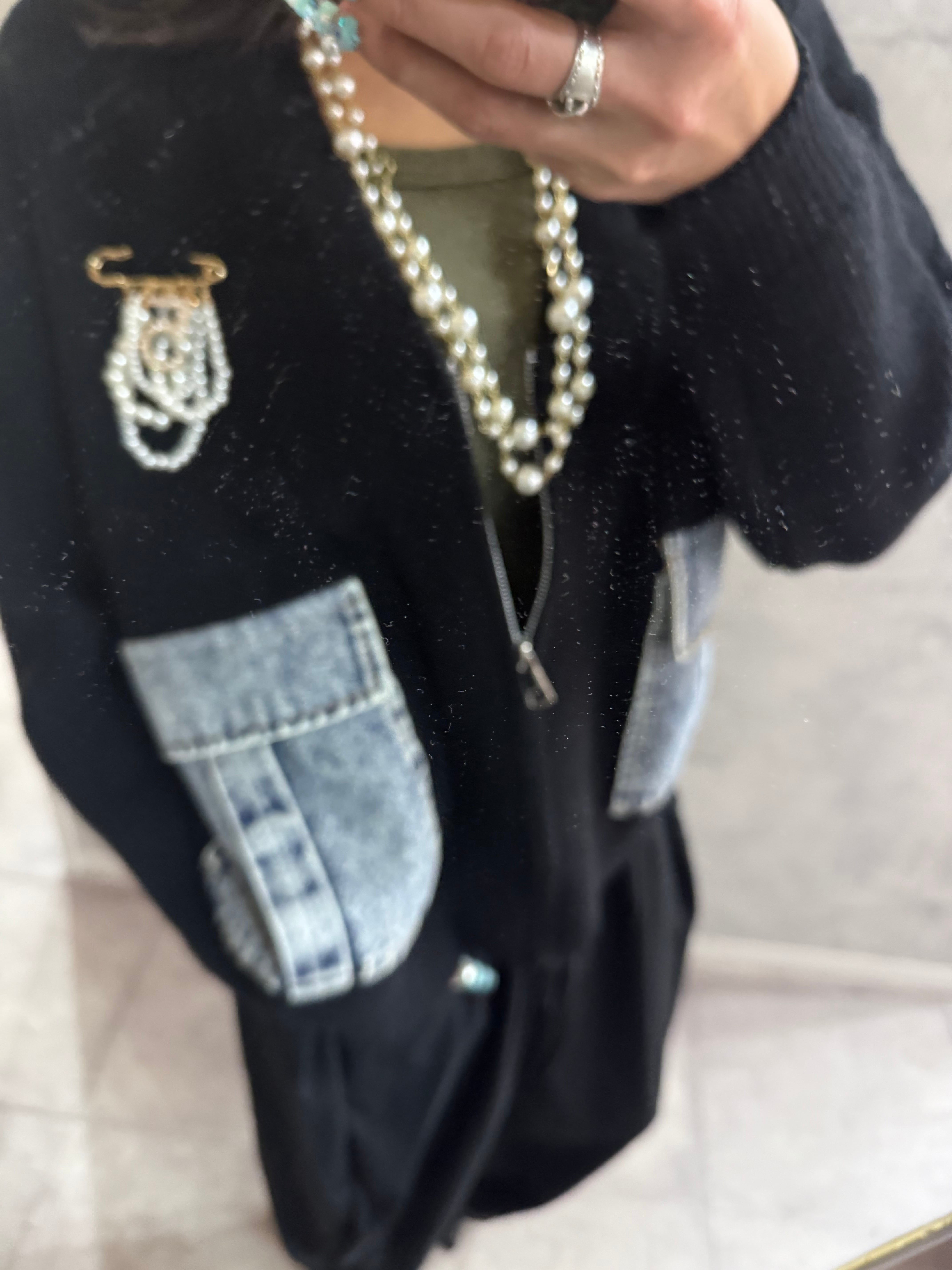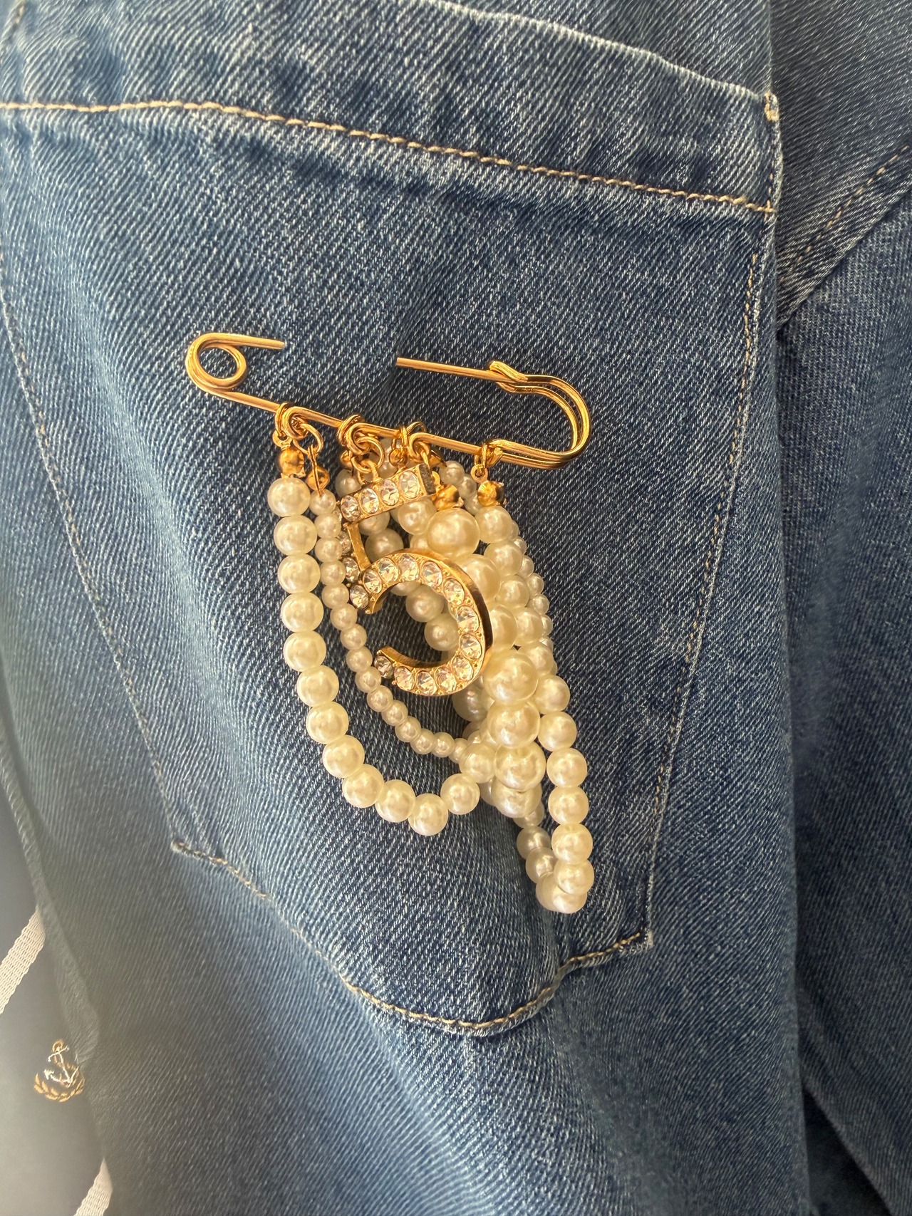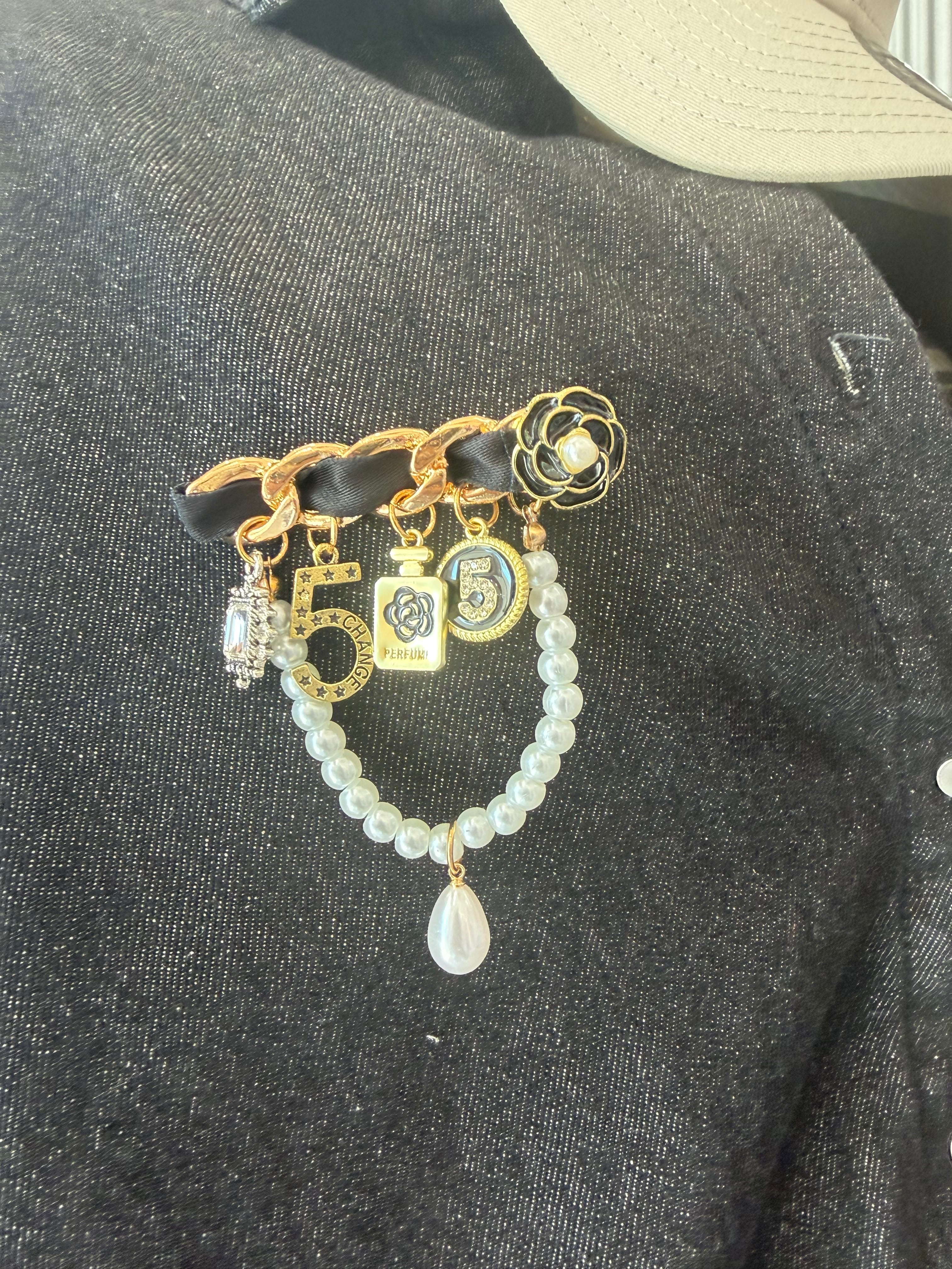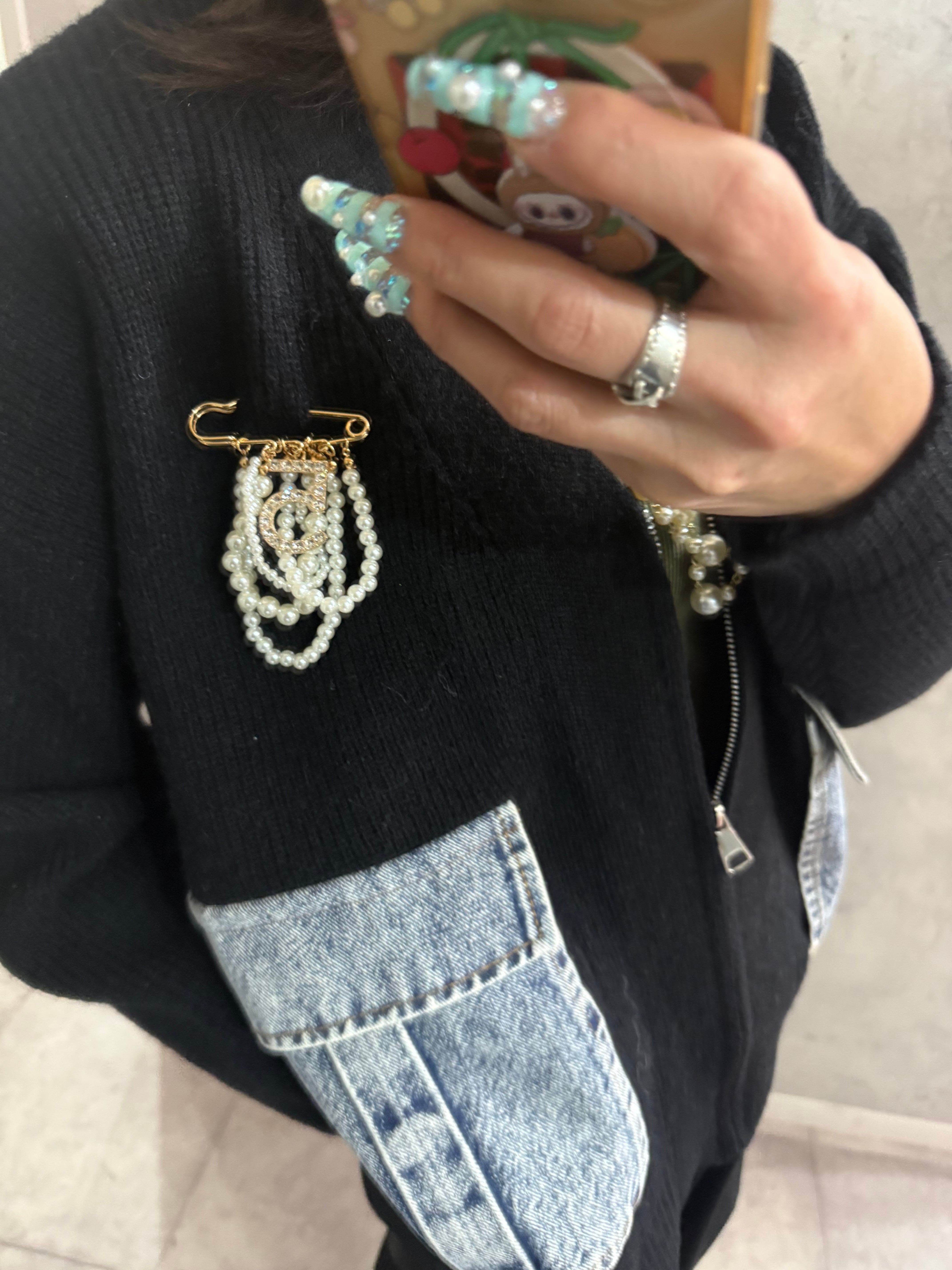 パール×チャームデザインのブローチ。