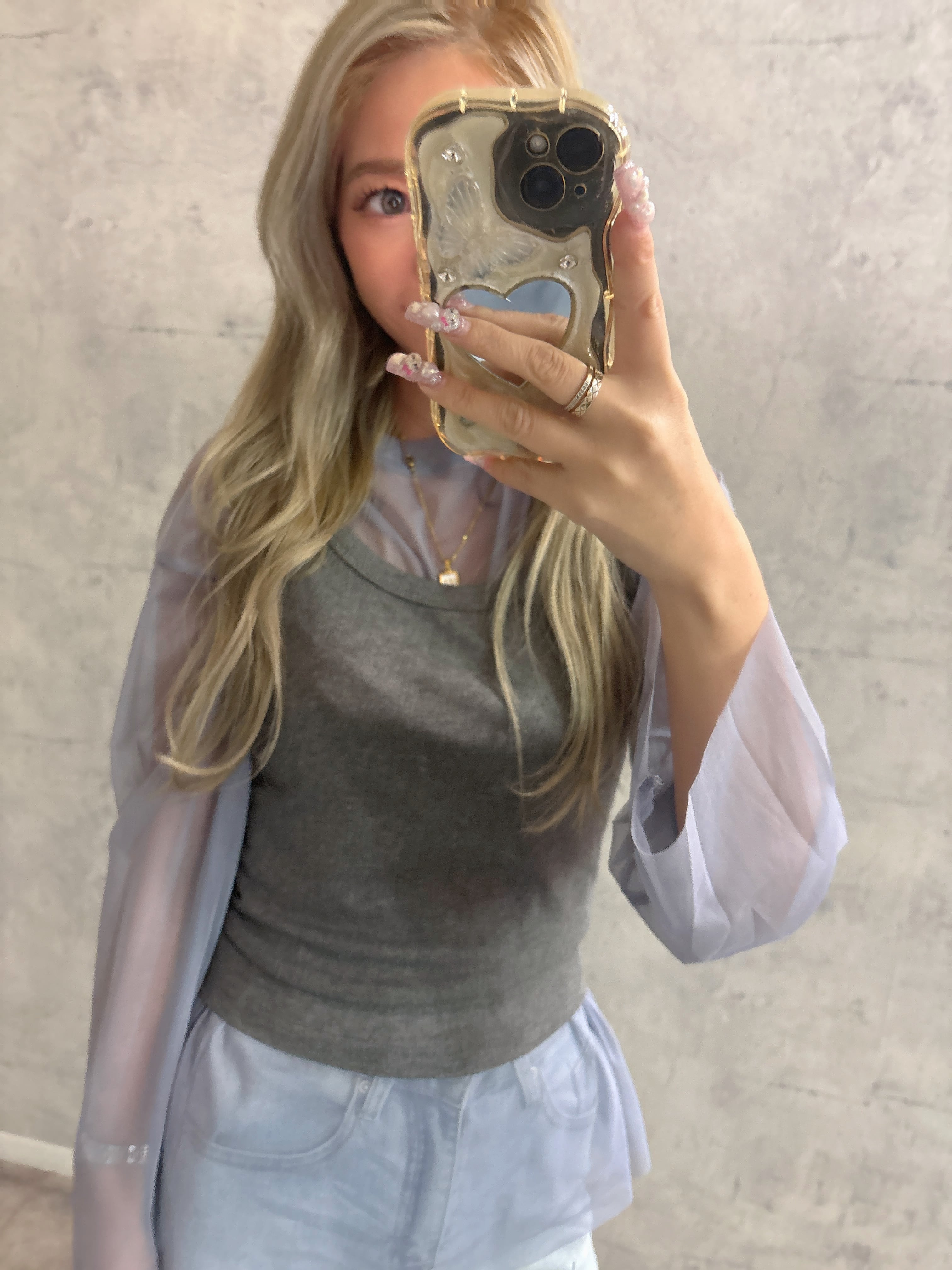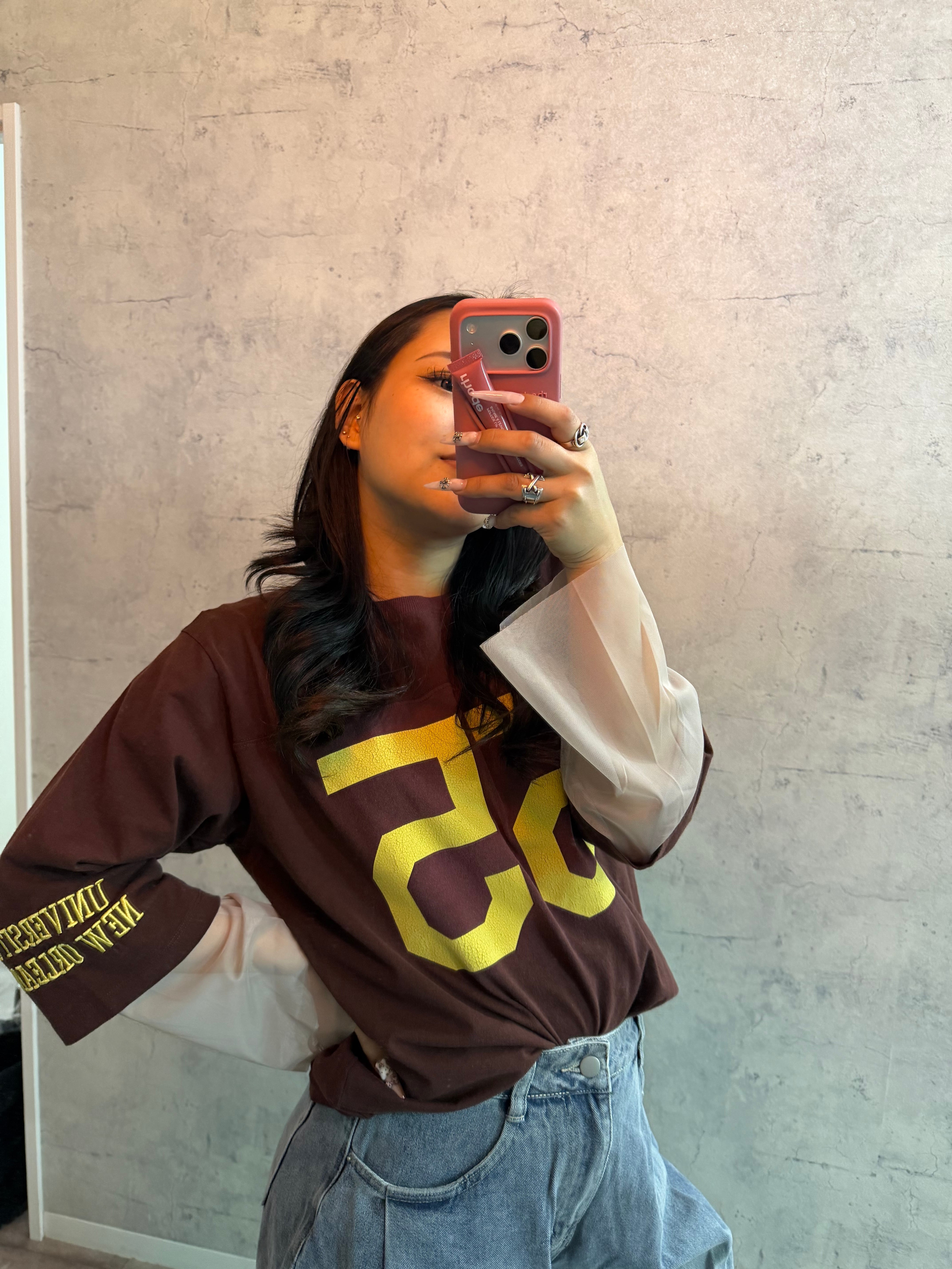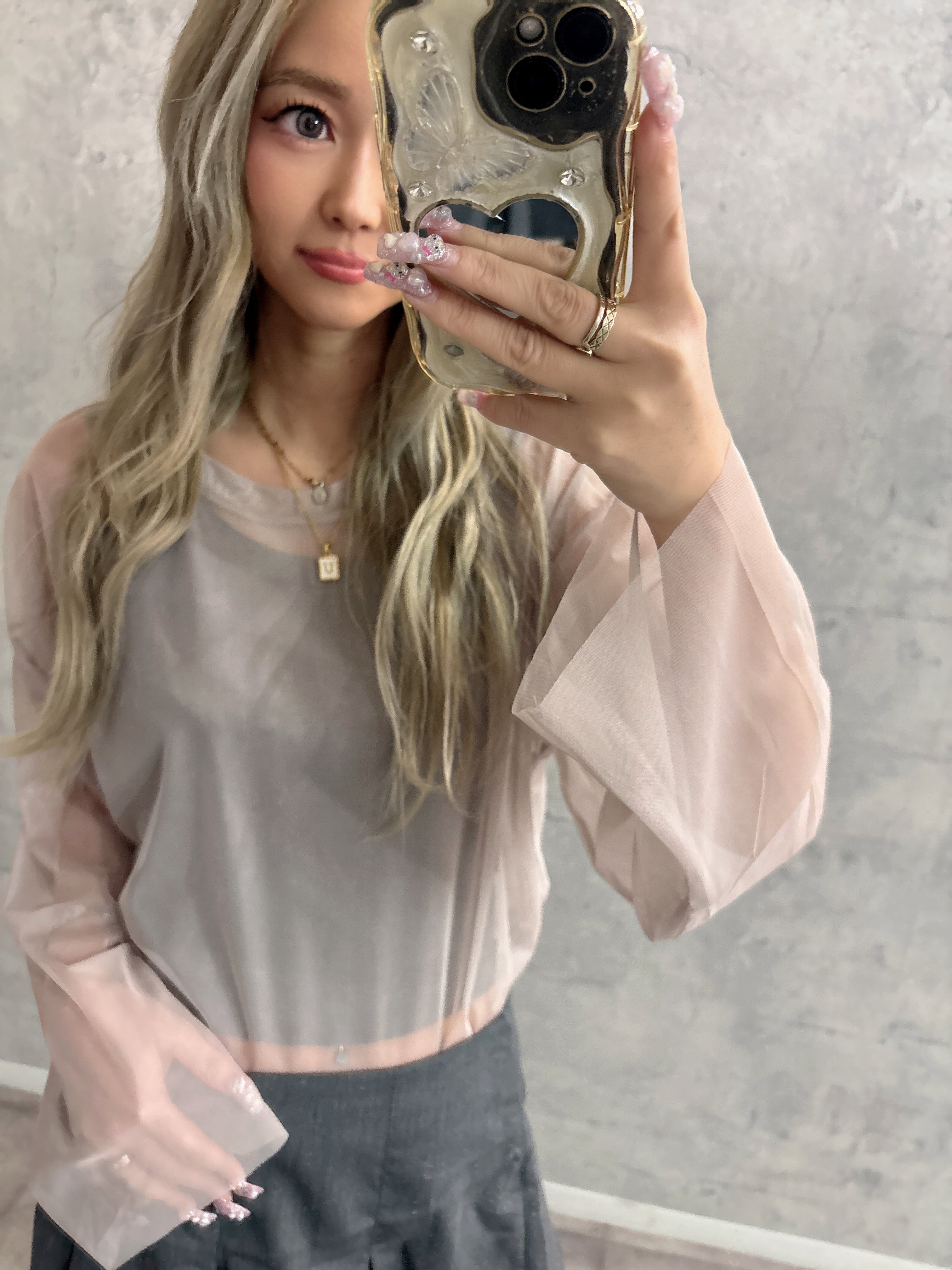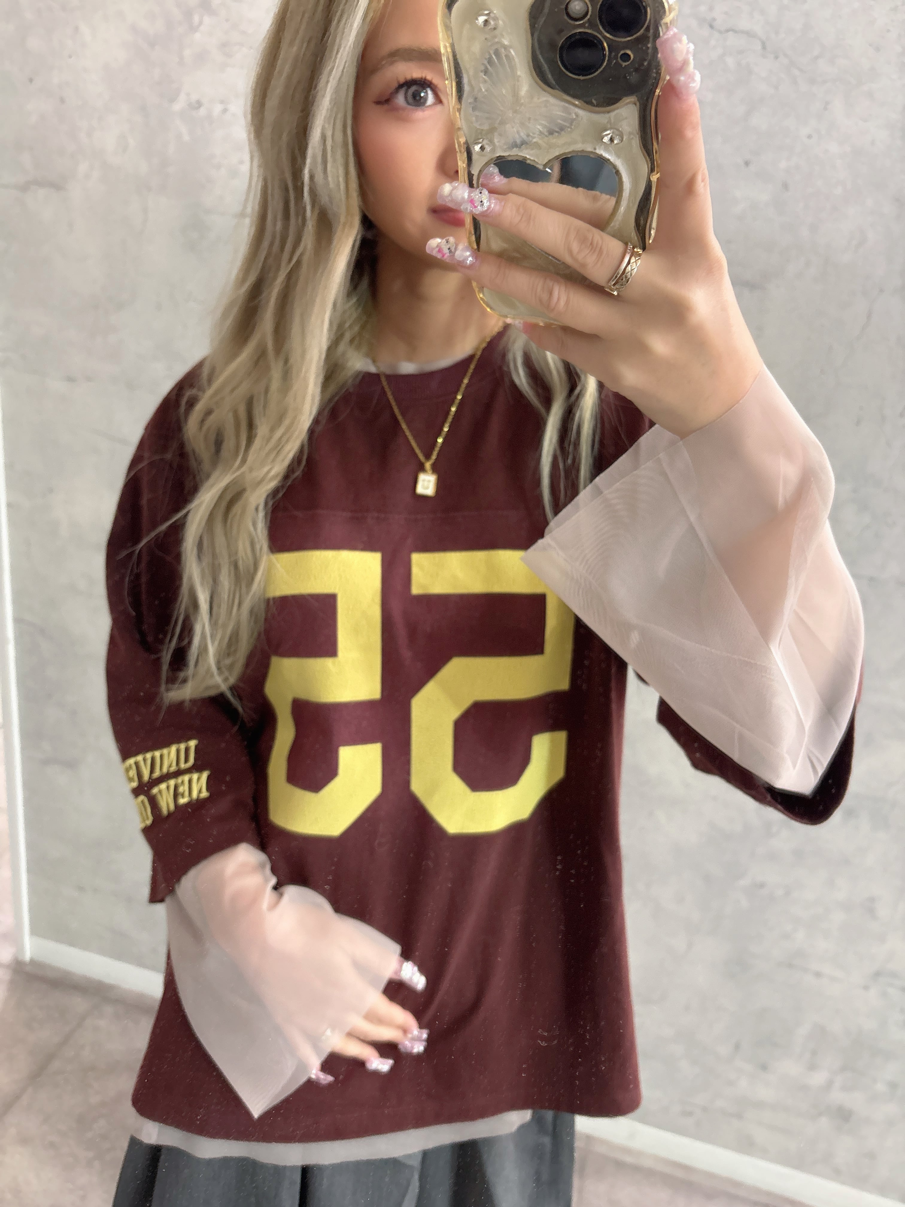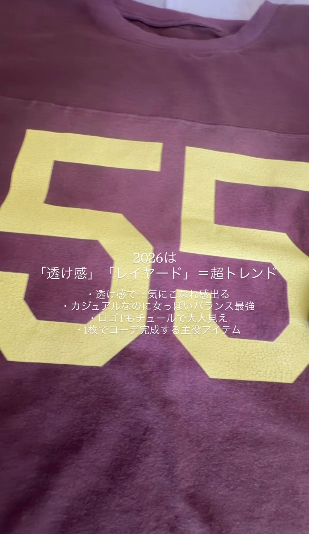 素材には、肌に馴染むナチュラルな綿100%の天竺編みと、繊細な透け感を持つポリエステル100%のチュールを贅沢に使用しました。内衣の天竺素材は、天然繊維ならではの優れた吸湿性とソフトな肌当たりを誇り、リブ部分にポリウレタンを混紡することで、首周りのヨレを防ぐ高い耐久性を確保。その上に重ねる外衣のチュールは、非常に軽量で柔らかなポリエステル糸を採用しており、スポーティーな印象にセンシュアルな透明感をプラスします。タフなコットンの質感と、空気を纏うようなチュールのレイヤードが、単なるTシャツの枠を超えた新しいテクスチャーを構築しています。