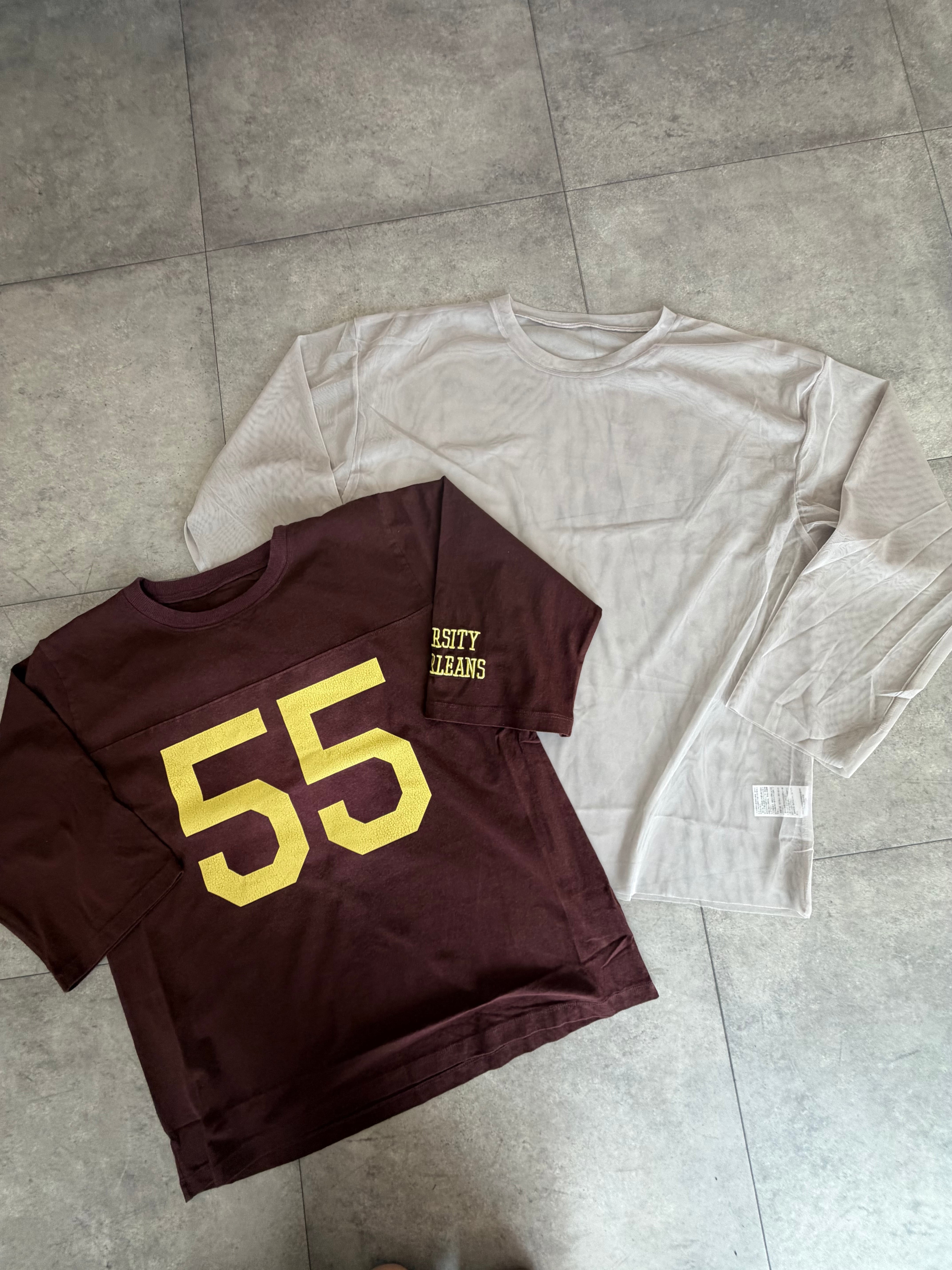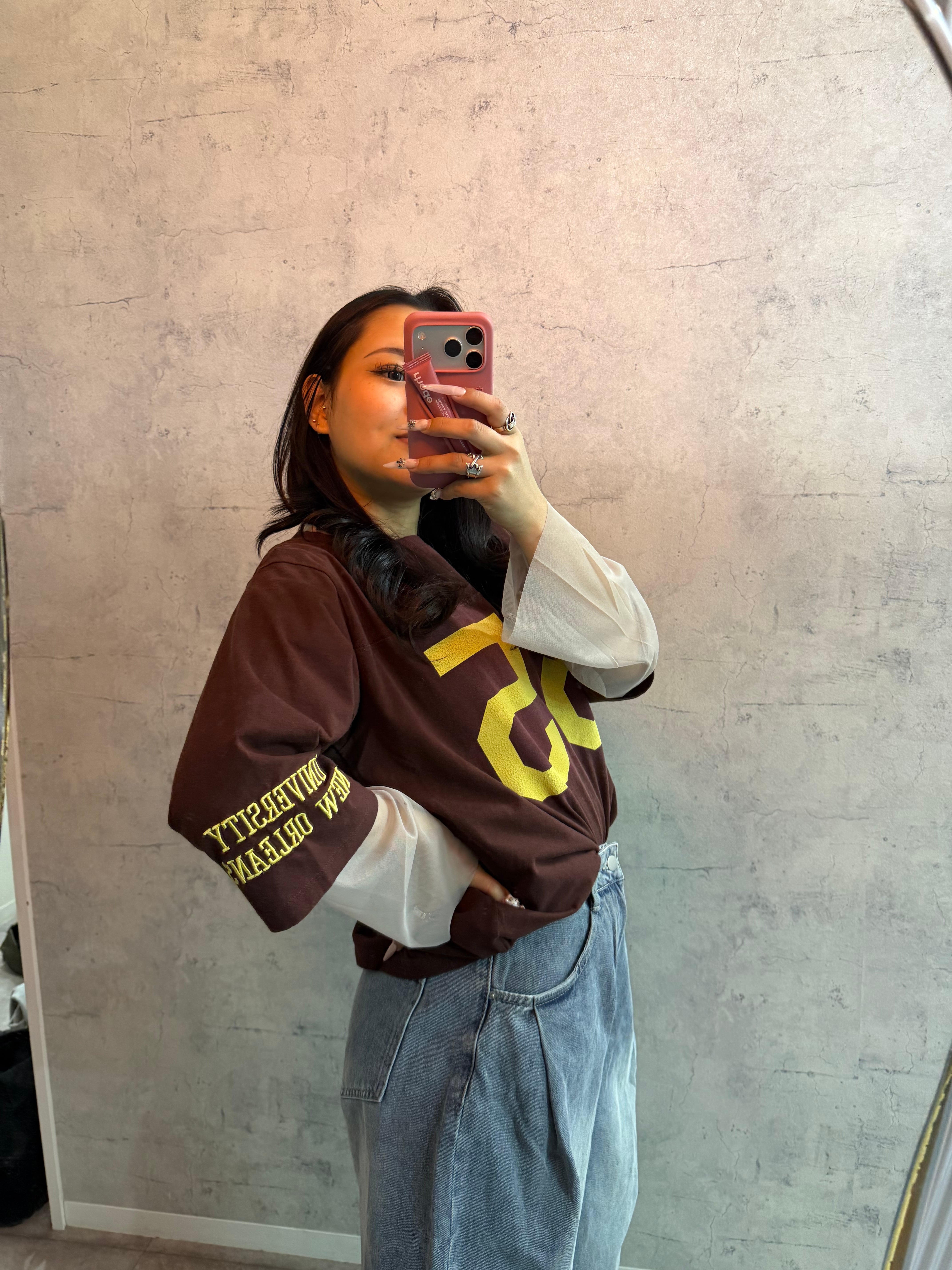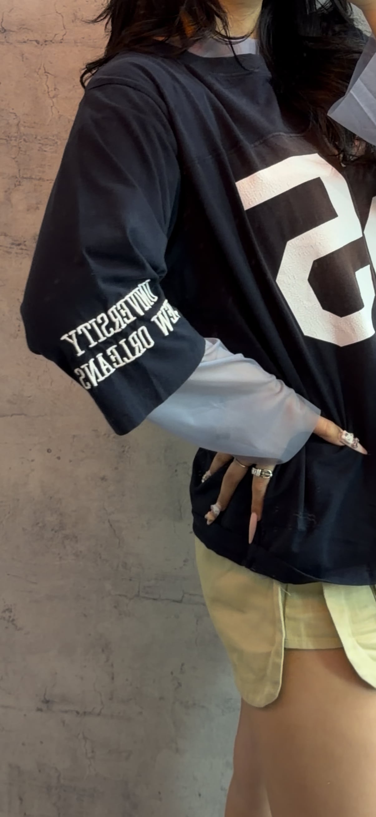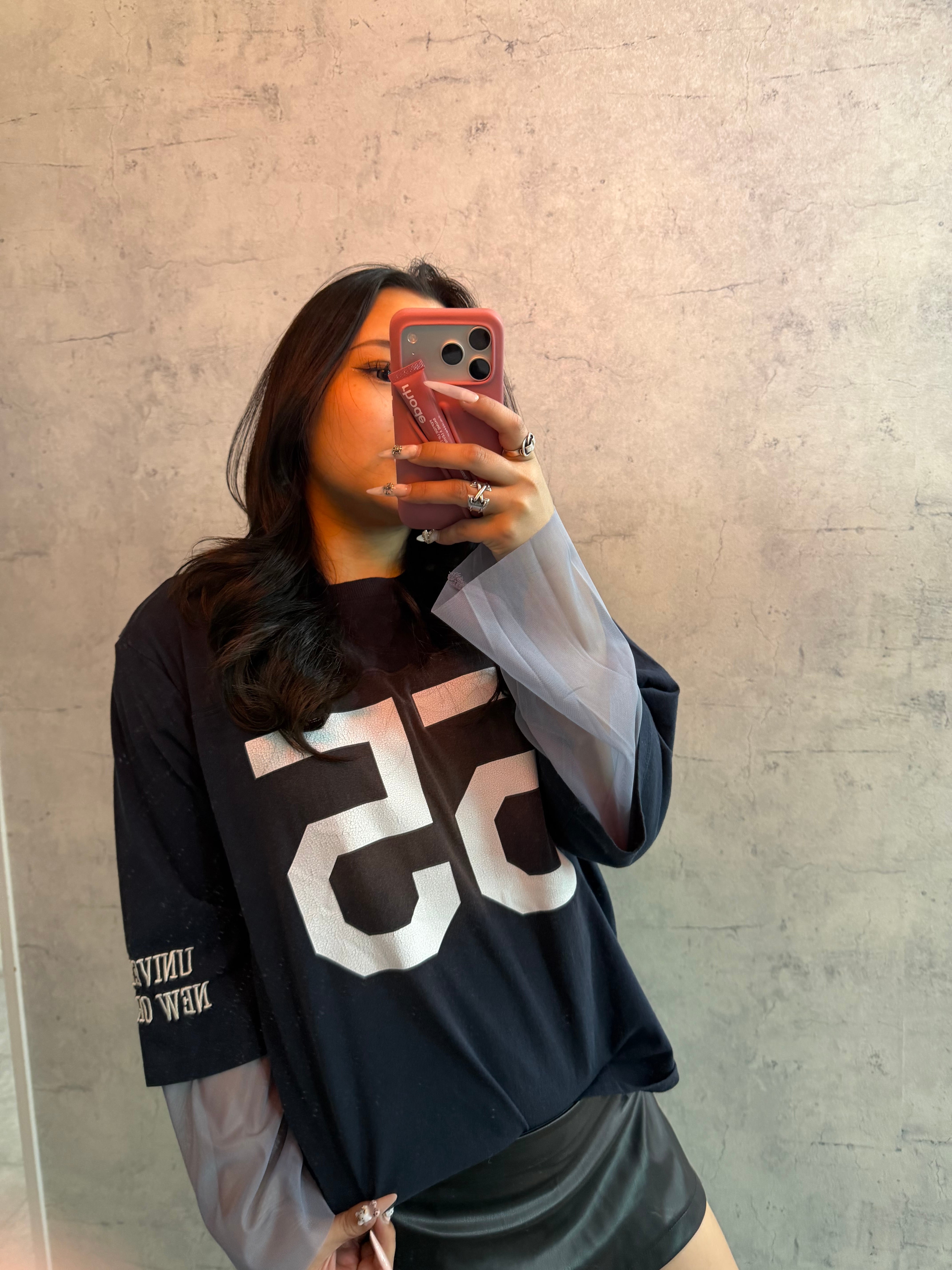 素材には、肌に馴染むナチュラルな綿100%の天竺編みと、繊細な透け感を持つポリエステル100%のチュールを贅沢に使用しました。内衣の天竺素材は、天然繊維ならではの優れた吸湿性とソフトな肌当たりを誇り、リブ部分にポリウレタンを混紡することで、首周りのヨレを防ぐ高い耐久性を確保。その上に重ねる外衣のチュールは、非常に軽量で柔らかなポリエステル糸を採用しており、スポーティーな印象にセンシュアルな透明感をプラスします。タフなコットンの質感と、空気を纏うようなチュールのレイヤードが、単なるTシャツの枠を超えた新しいテクスチャーを構築しています。