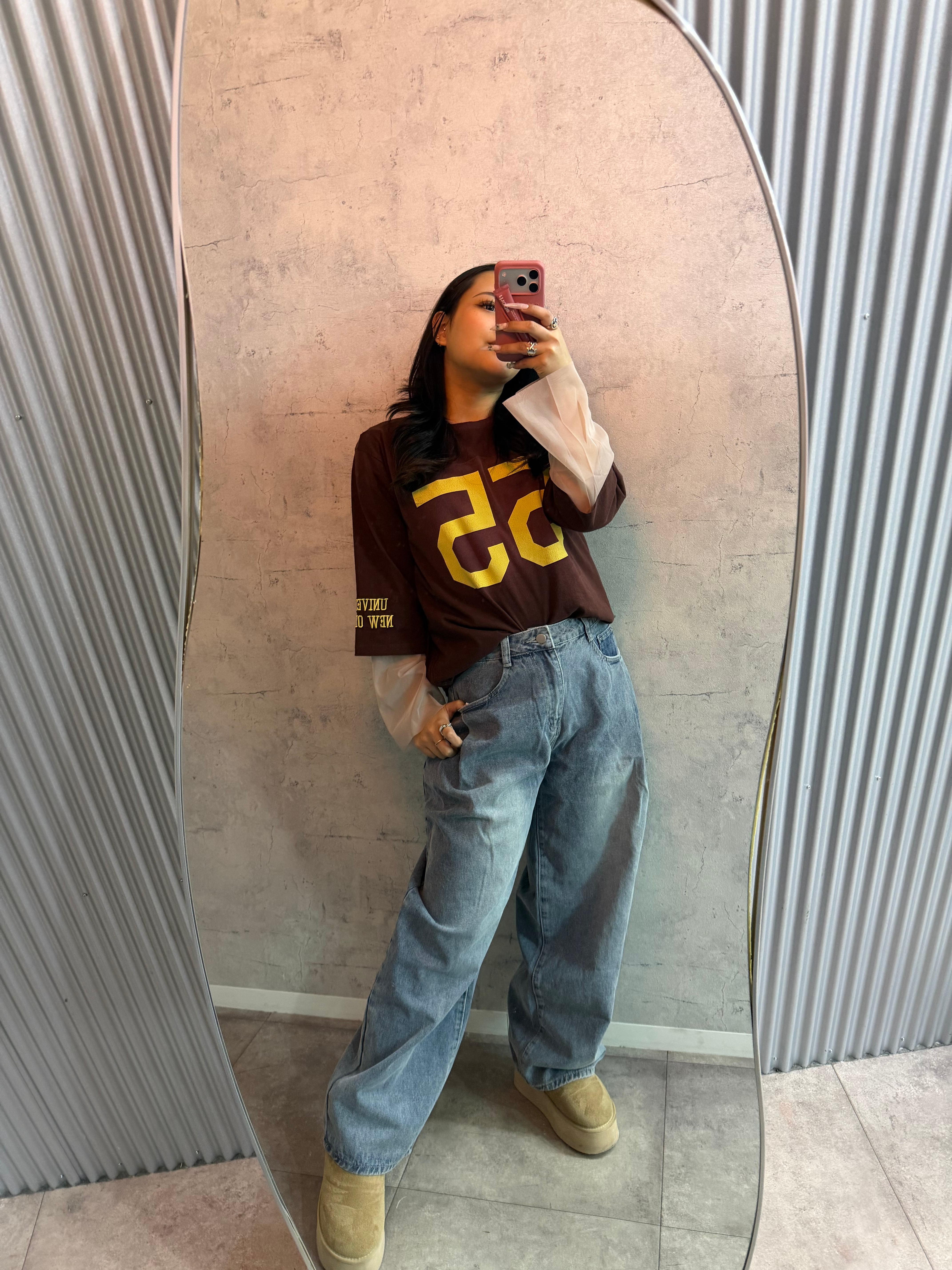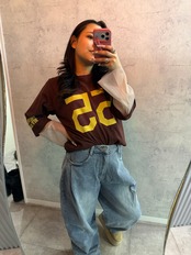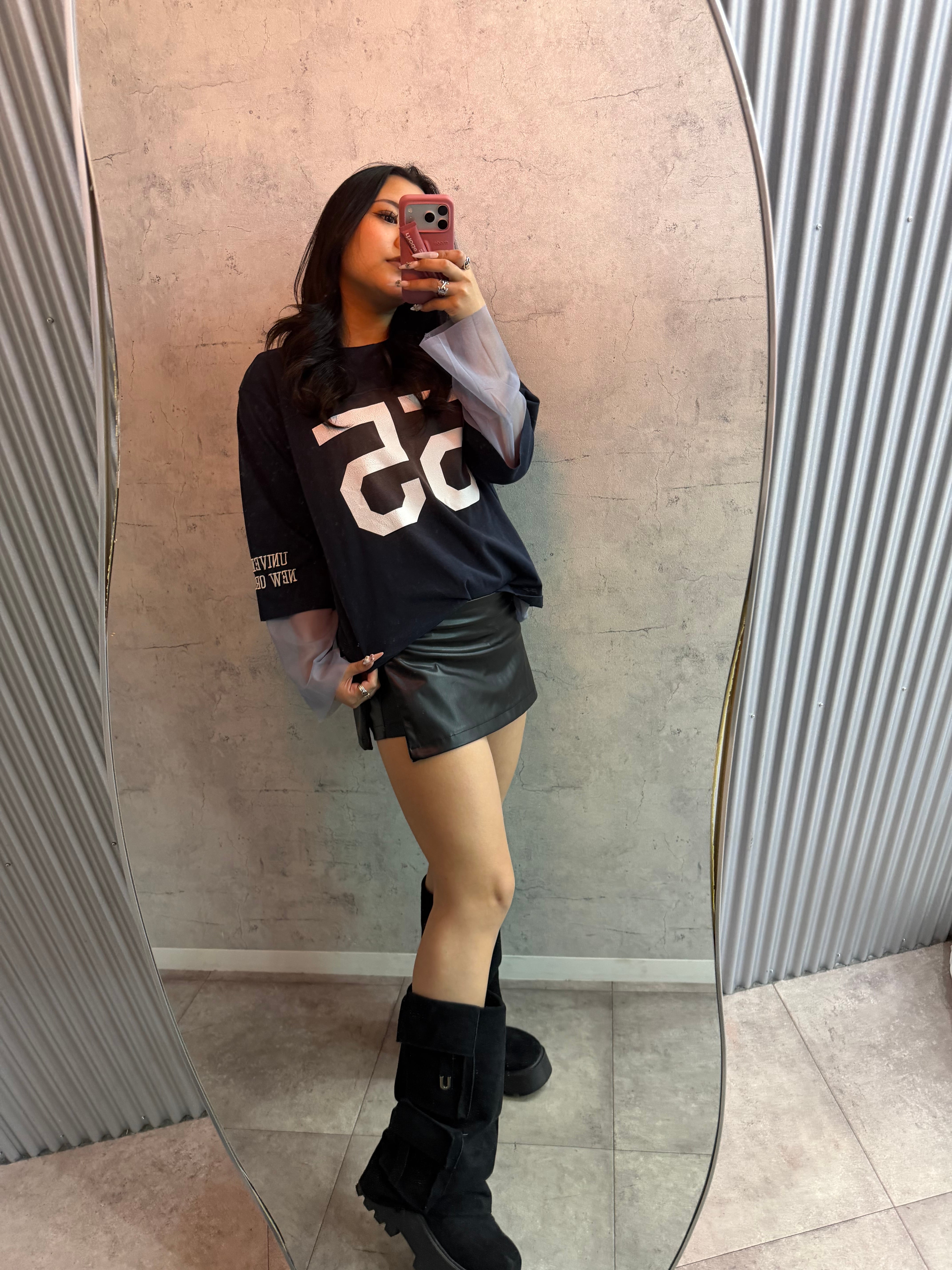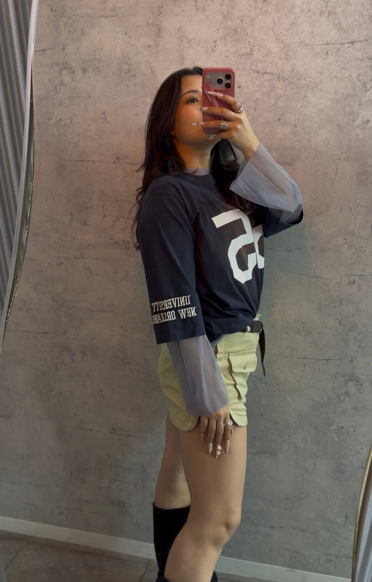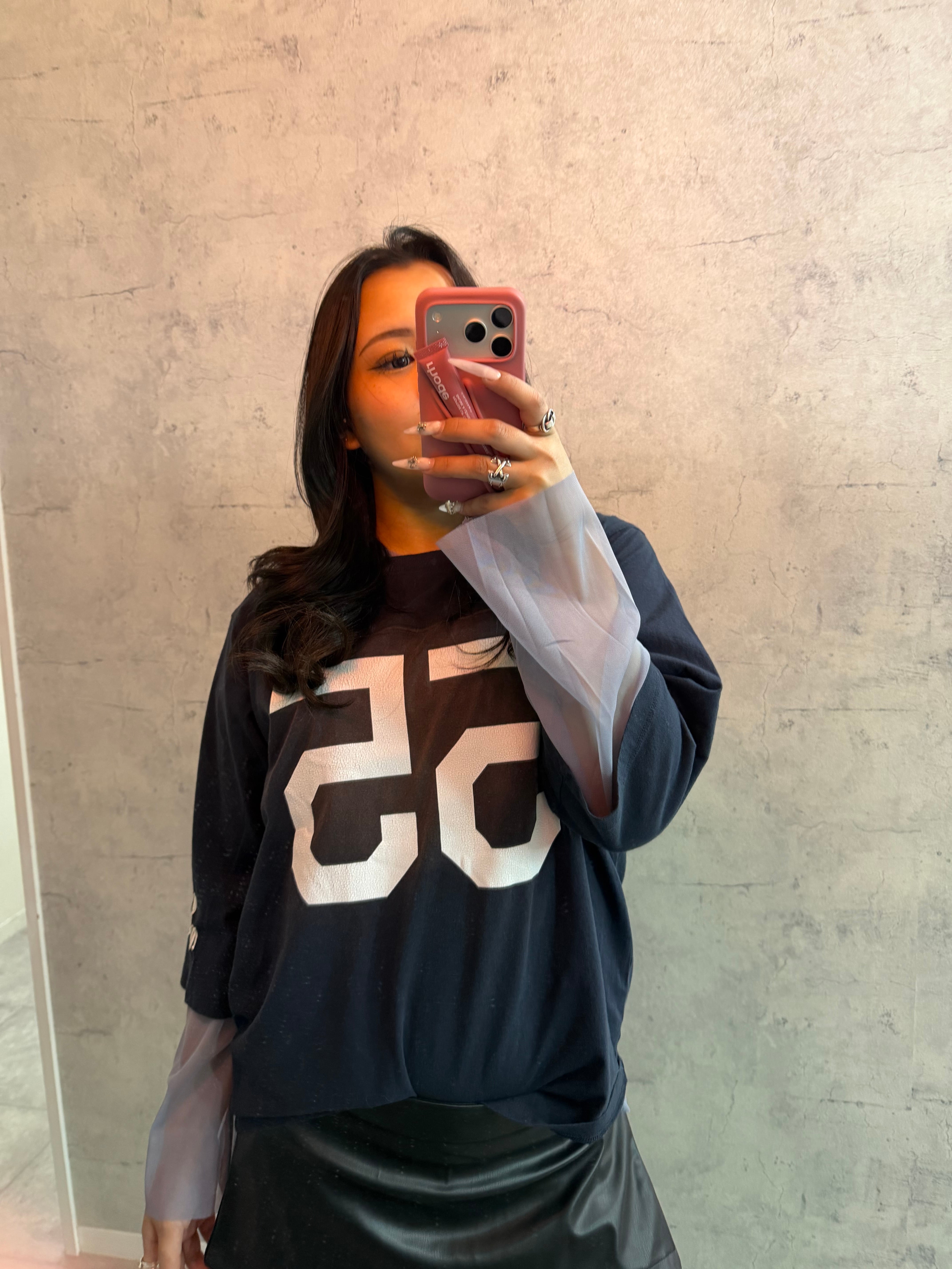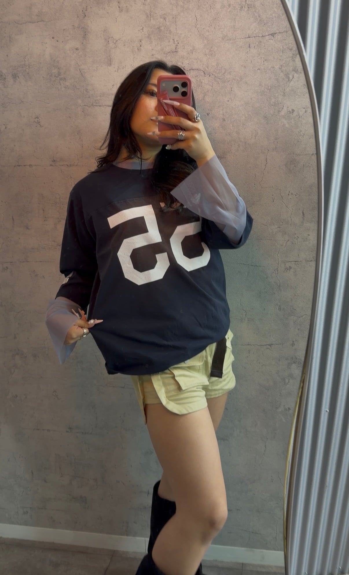 素材には、肌に馴染むナチュラルな綿100%の天竺編みと、繊細な透け感を持つポリエステル100%のチュールを贅沢に使用しました。内衣の天竺素材は、天然繊維ならではの優れた吸湿性とソフトな肌当たりを誇り、リブ部分にポリウレタンを混紡することで、首周りのヨレを防ぐ高い耐久性を確保。その上に重ねる外衣のチュールは、非常に軽量で柔らかなポリエステル糸を採用しており、スポーティーな印象にセンシュアルな透明感をプラスします。タフなコットンの質感と、空気を纏うようなチュールのレイヤードが、単なるTシャツの枠を超えた新しいテクスチャーを構築しています。
