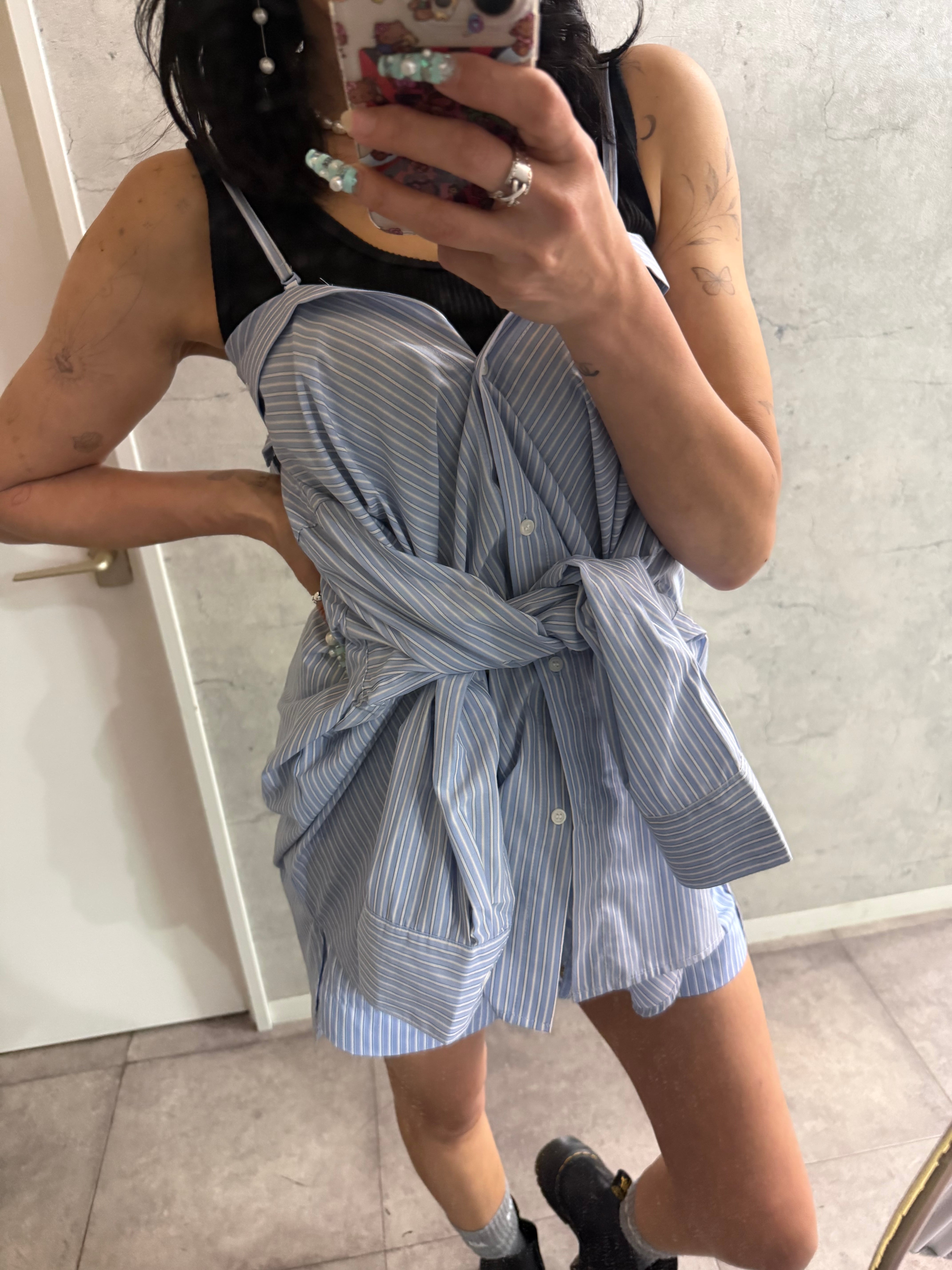 ボタンを開けて肩紐を使えばキャミ風トップスとしても着用でき、コーディネートに合わせてシルエットの変化を楽しめるデザインです