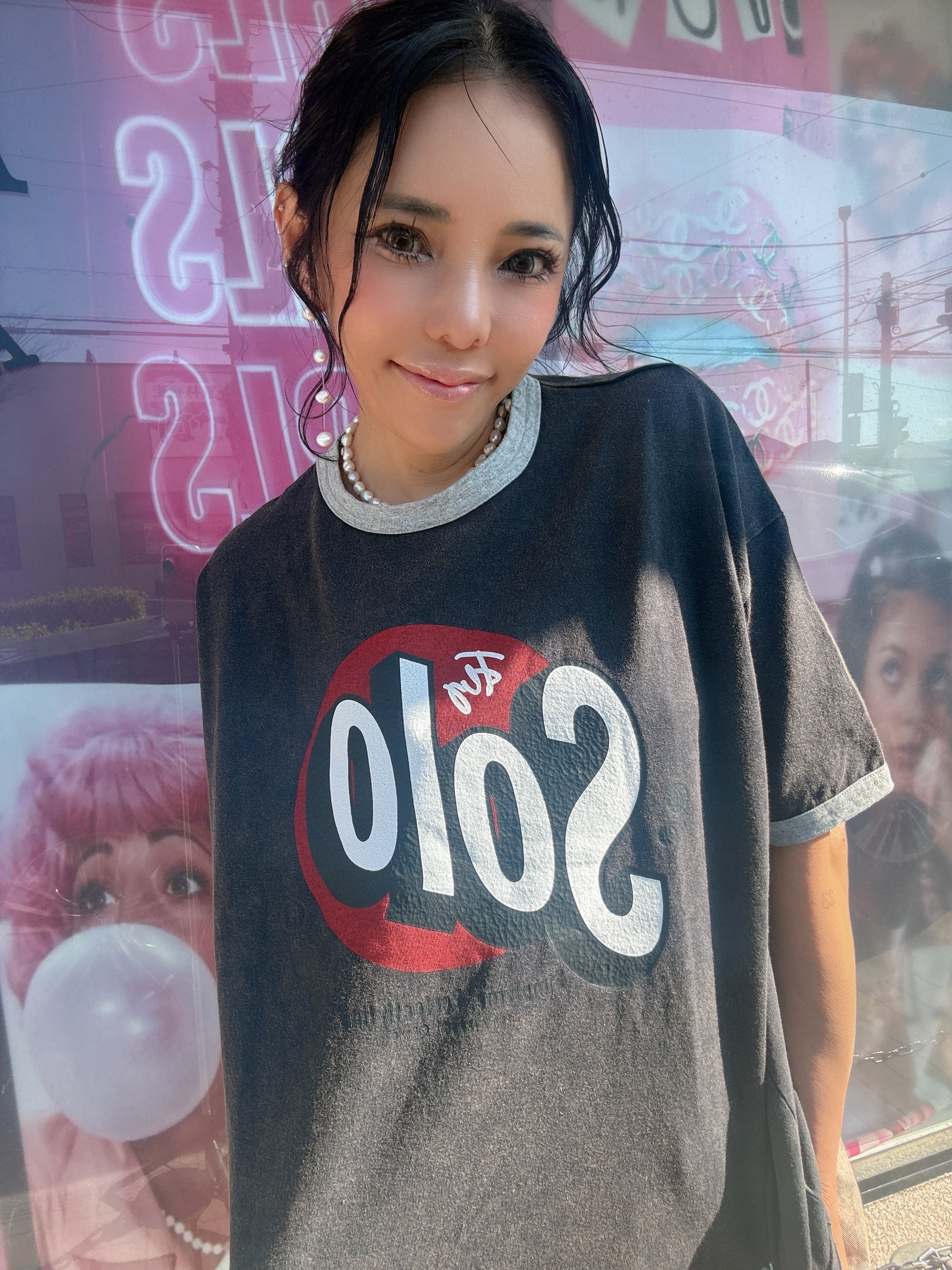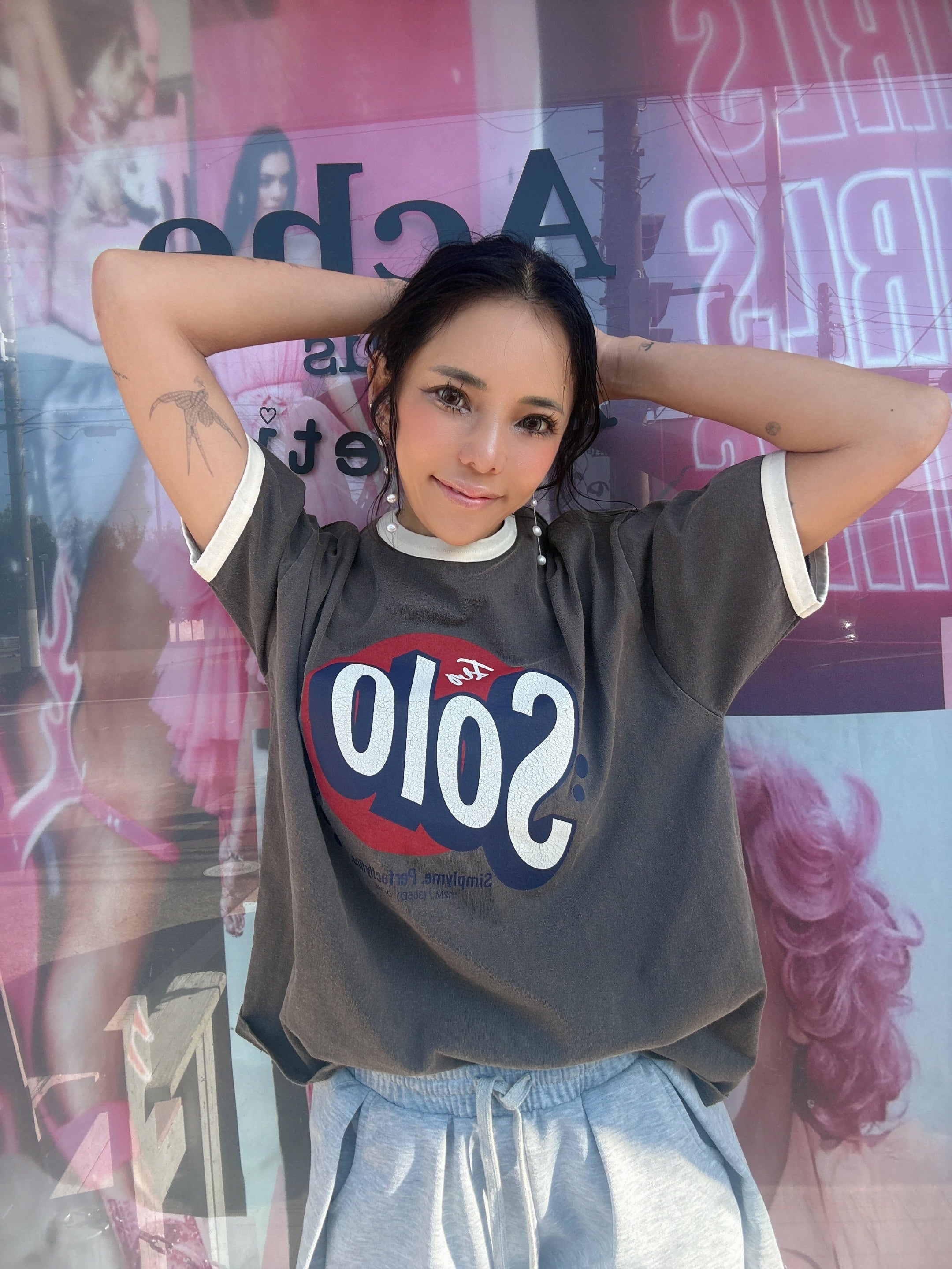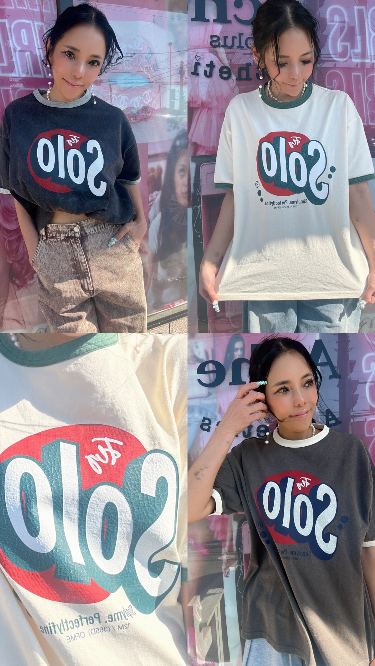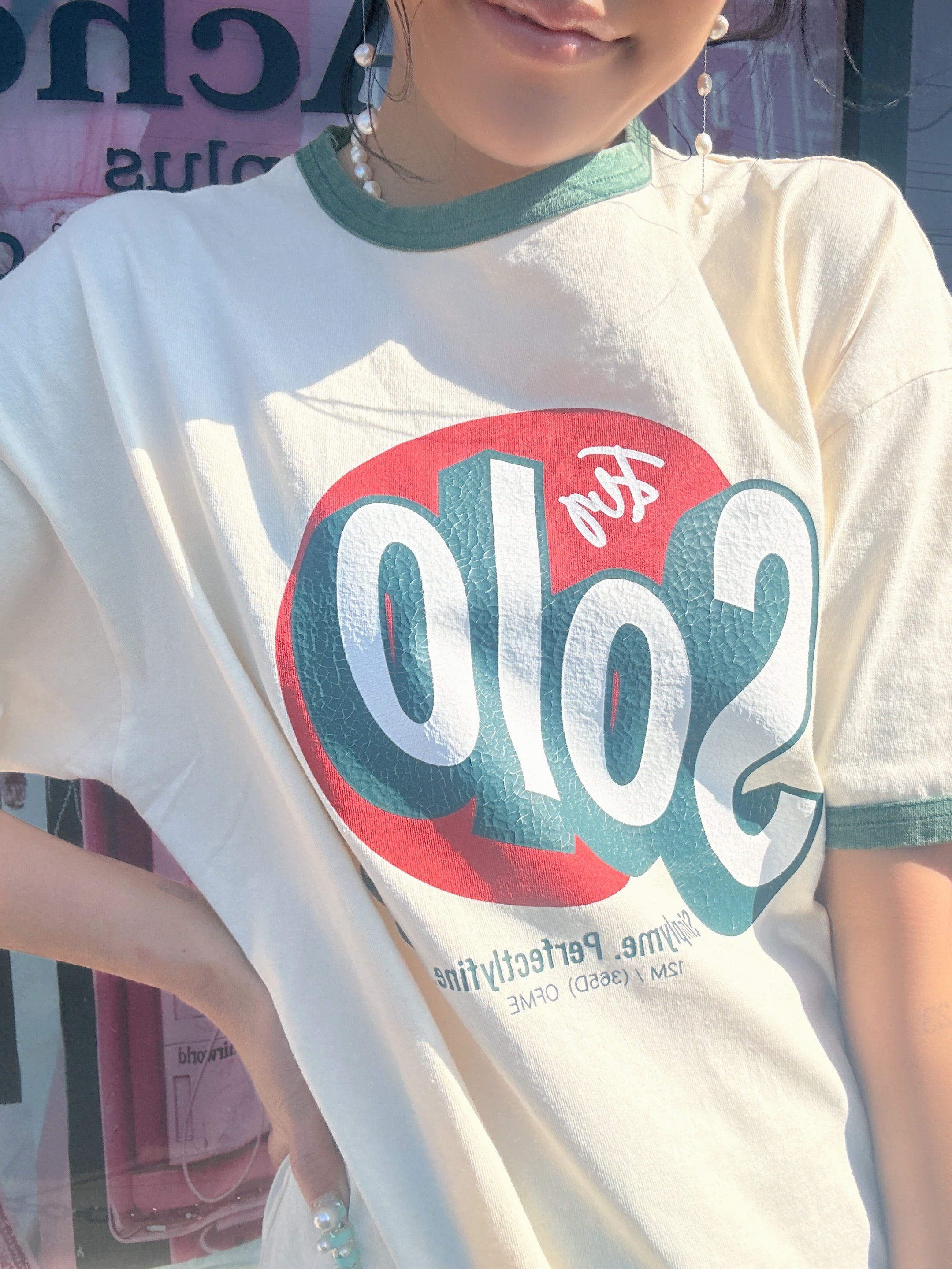 首元と袖口の配色切り替えがアクセントになるリンガーデザインに、ミニマルな「solo」のロゴプリントを配した、こなれ感溢れる一着です。最大のこだわりは、パウダー加工による「掠れ」の表情と、リンガーTシャツ特有のスポーティーな空気感の融合。あえて彩度を落とした配色に仕上げることで、大人の女性が都会的に纏える「きれいめカジュアル」な佇まいへと昇華させました。身幅には程よくゆとりを持たせつつ、計算されたサイズバランスが、ルーズすぎない現代的なフォルムを構築。一見シンプルながらも、素材の奥行きが確かな存在感を放ちます。
