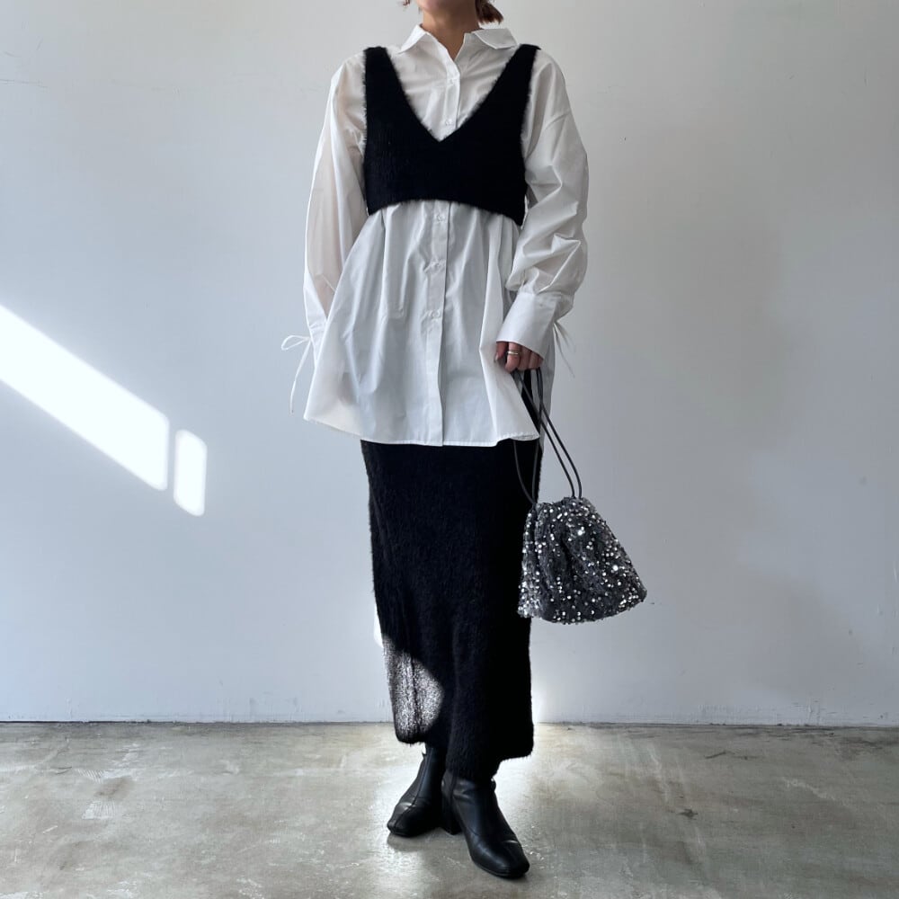 秋冬に使えるシャギー素材で着回ししやすいビスチェ。