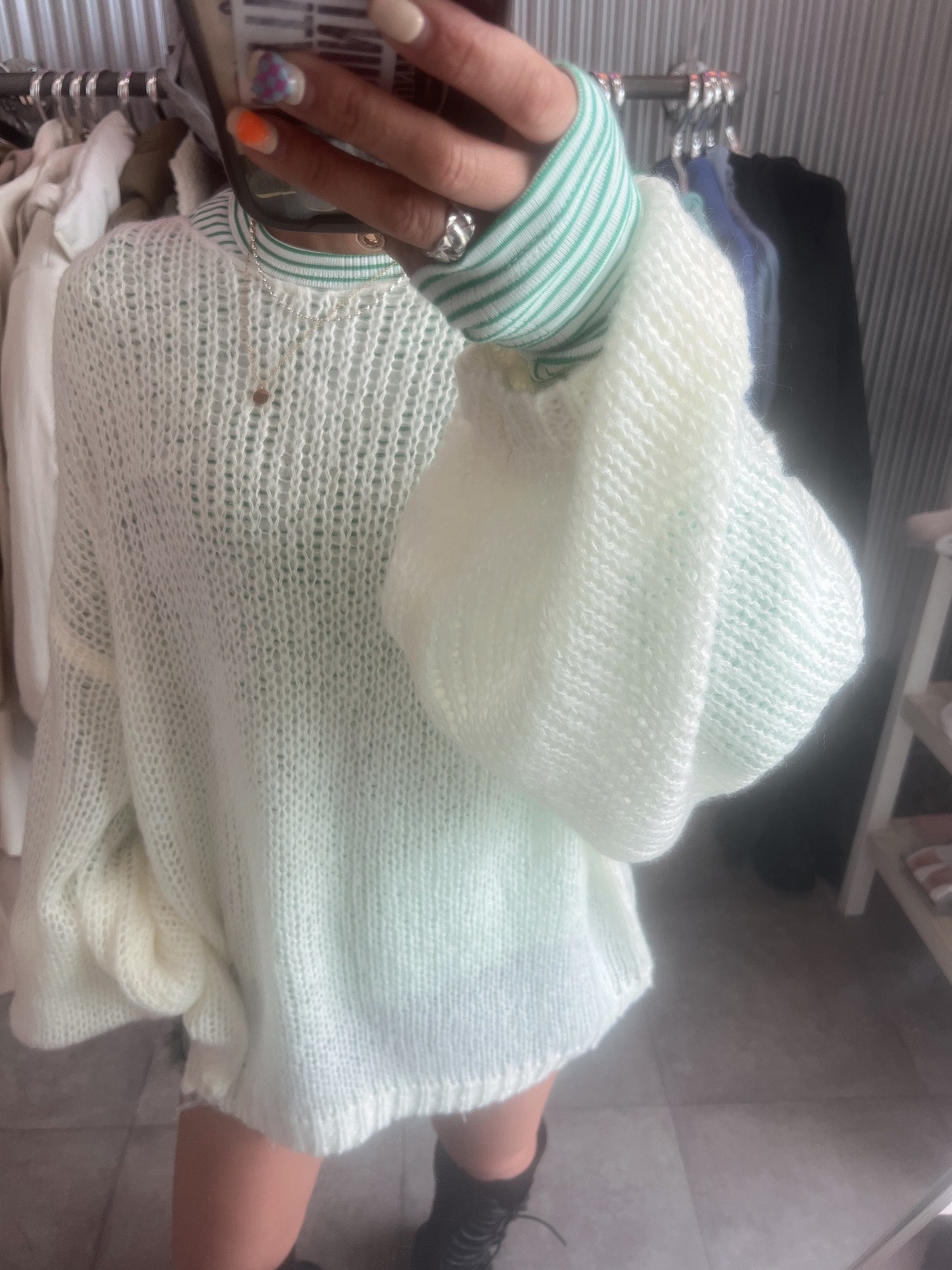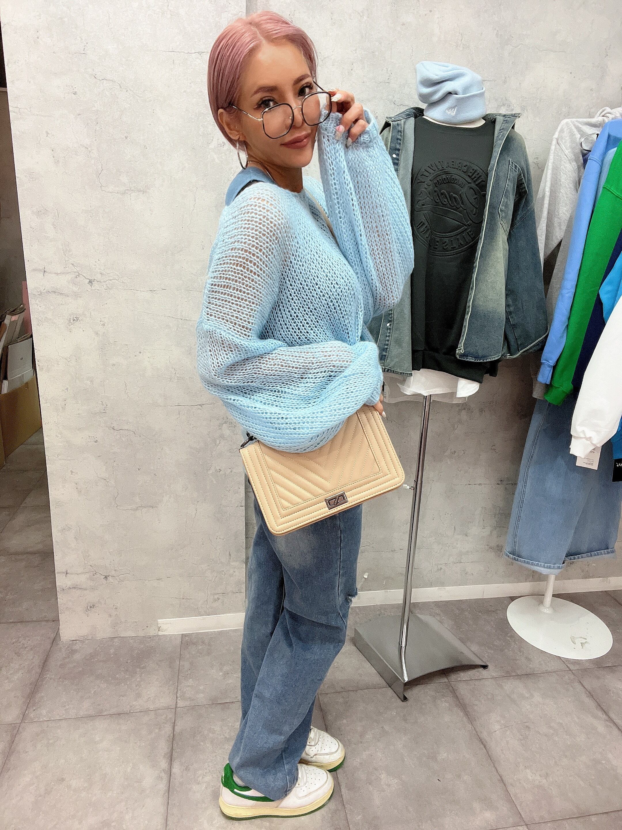 ふんわりとした起毛系の透かし編みがポイントのニットトップス。