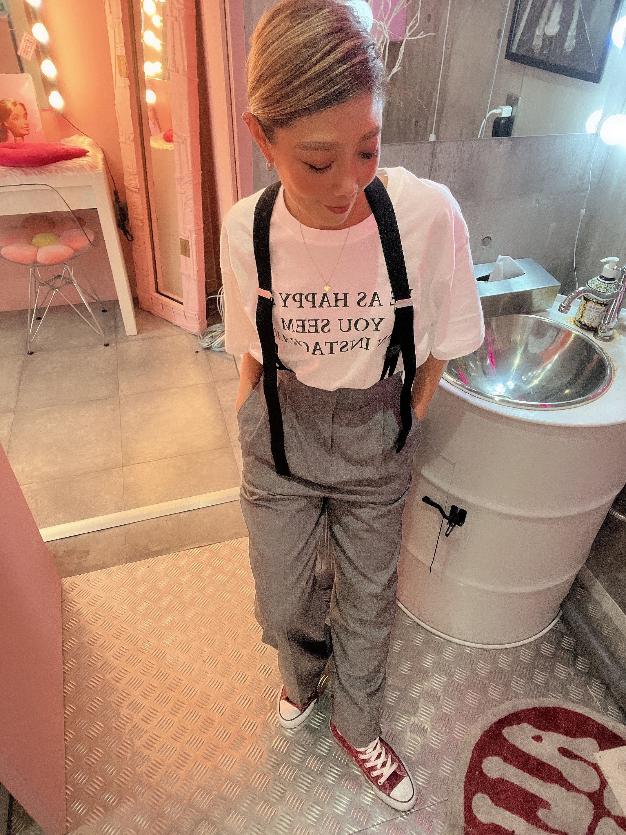 サスペンダーが大人っぽいこなれ感を演出しますサスペンダーはボタンで取り外し可能!パンツ単体でも着用いただけますワイドなシルエットはコンパクトなトップスと相性◎