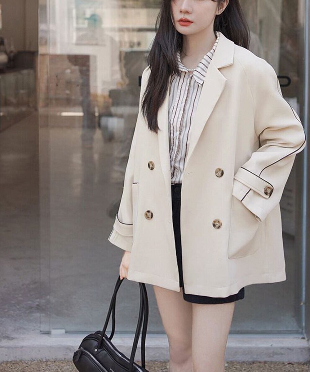 ダブルブレストジャケット ミディアム丈春コート ポケット付きスーツジャケット 春秋ライトアウター パイピング 軽アウター