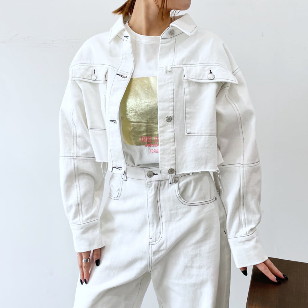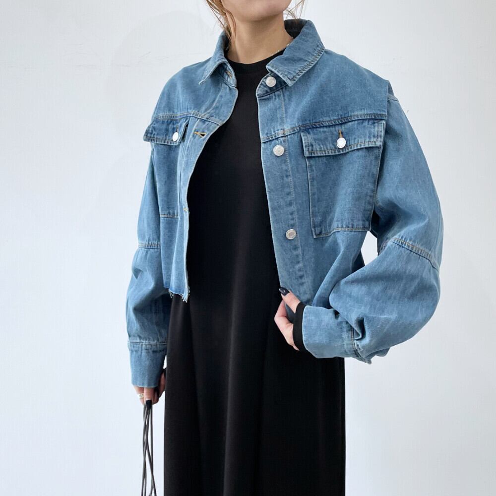 トレンドのショート丈でさりげなくスタイルアップが叶うデニムジャケットワイドパンツやフレアスカートなどボリュームのあるボトムと相性◎