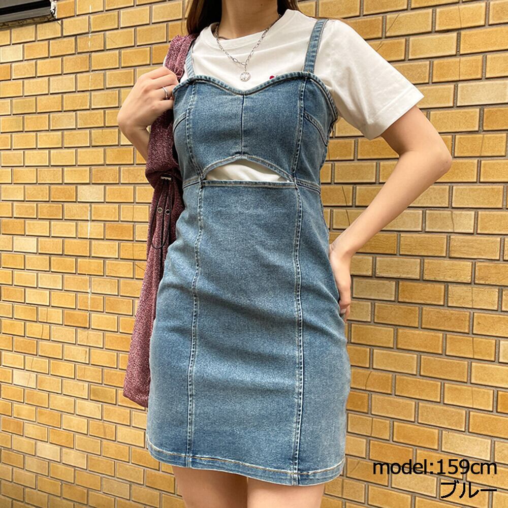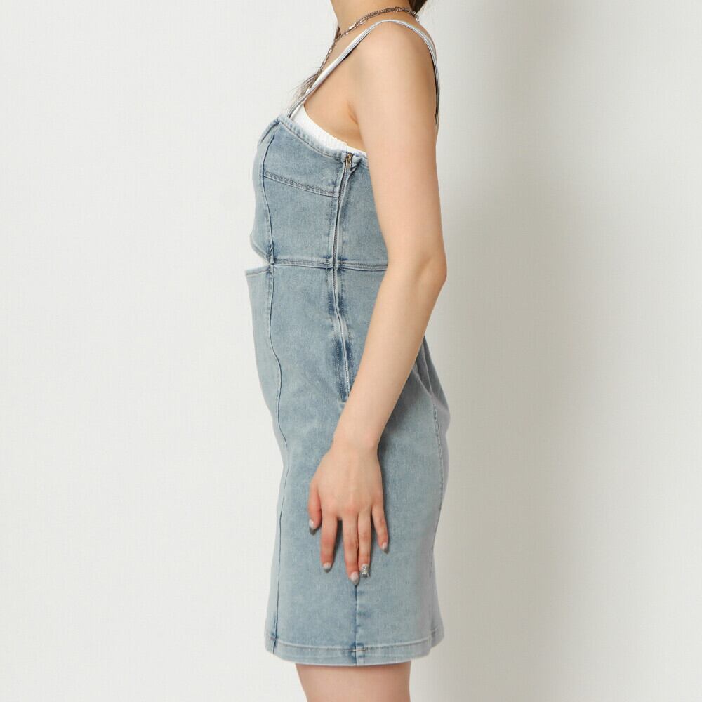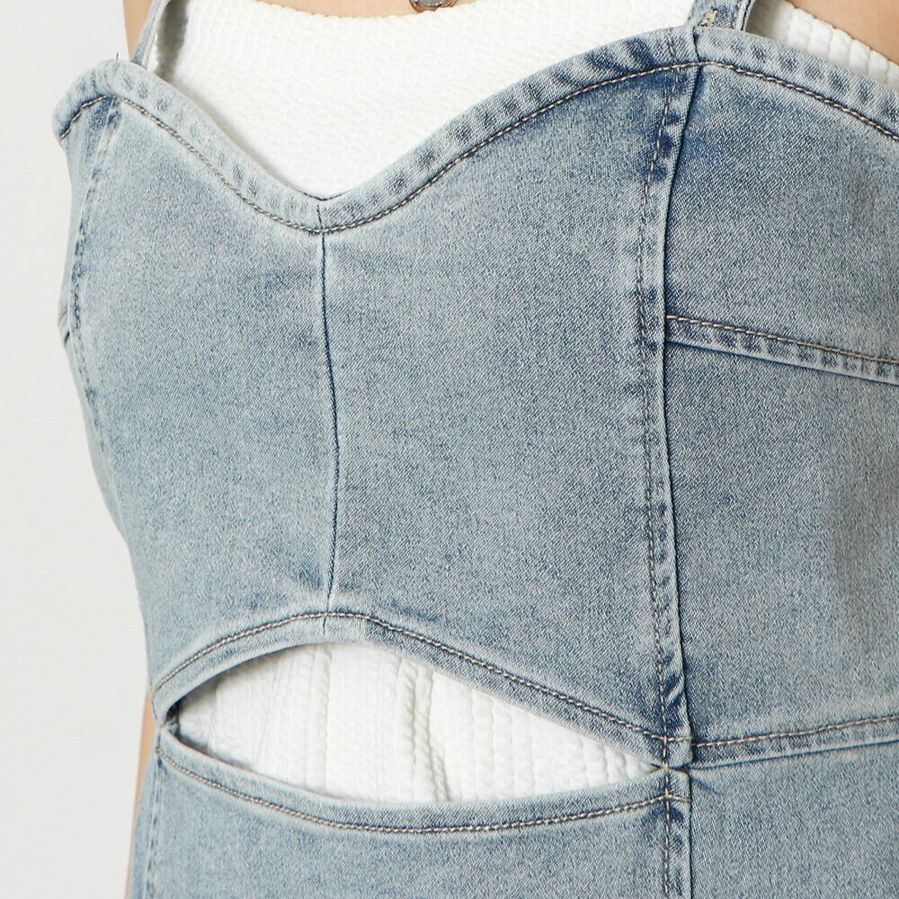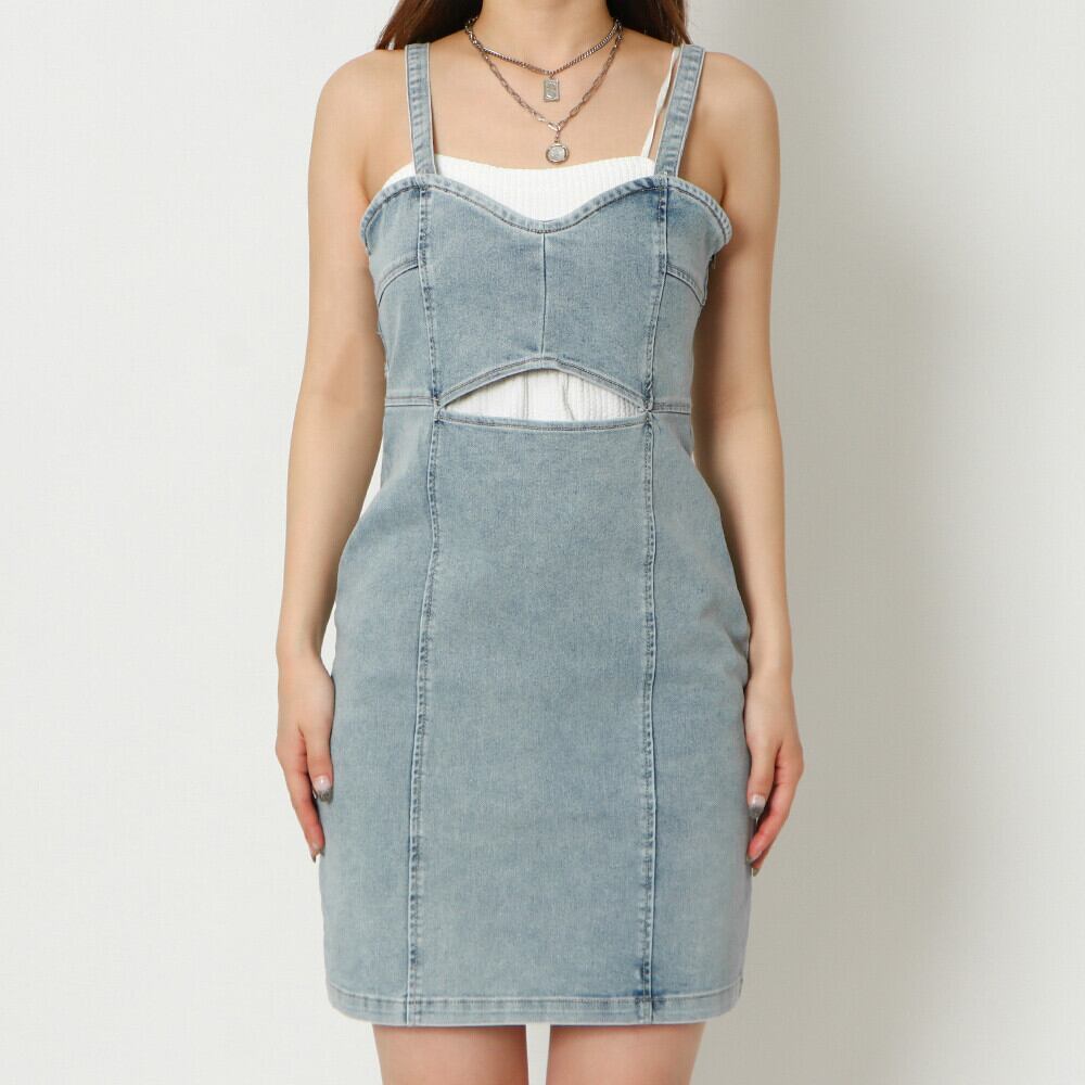 トレンド感あるカットアウトデニムキャミワンピース。ウエストに施されたデザインはメリハリが出てスタイルアップ効果も叶います。タイトなシルエットですが、ストレッチ性のある生地で着心地が良いのも嬉しいポイント★1枚でヘルシースタイルももちろん、Tシャツやシアートップスを重ねたレイヤードコーデもオススメです。