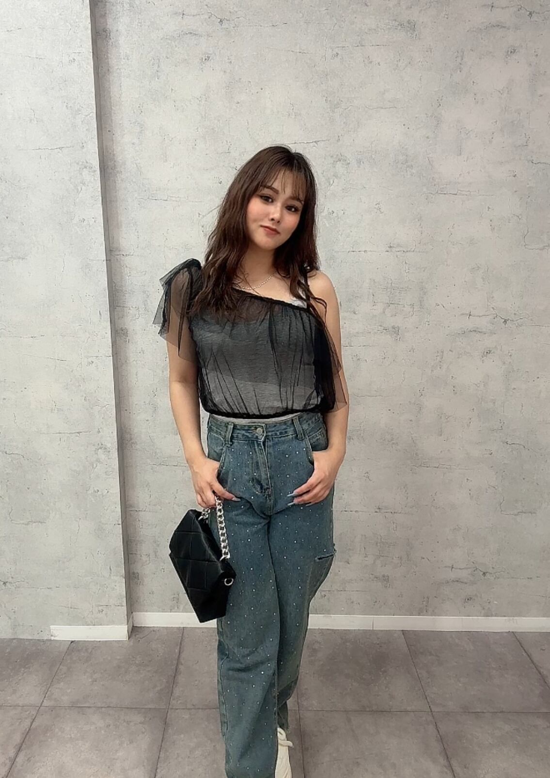 スタイリングのデニムワイドPTはこちらラメアメスリタンクはこちら天竺パールプリントTシャツはこちらカットリブ2本ストラップキャミソールはこちらラメスパンコールIラインスカートはこちら