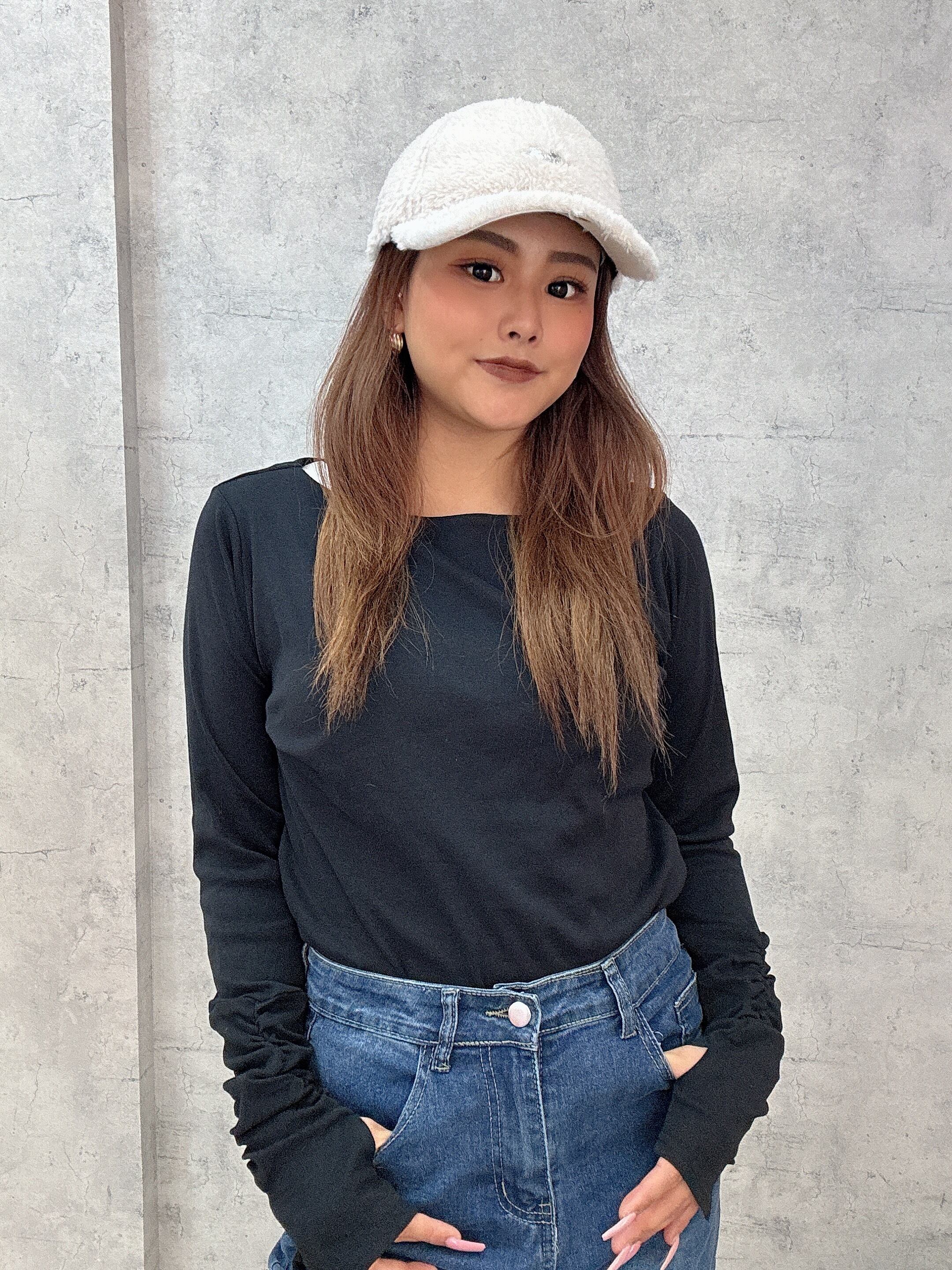 ボートネック袖クシュクシュ華奢見え指空きカットソー