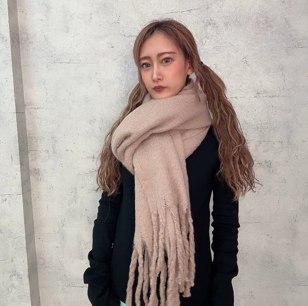 ふんわり柔らい起毛フェイクウールタッチの上質生地をたっぷり使用、暖かみとボリューム感溢れるワイドフリンジマフラー