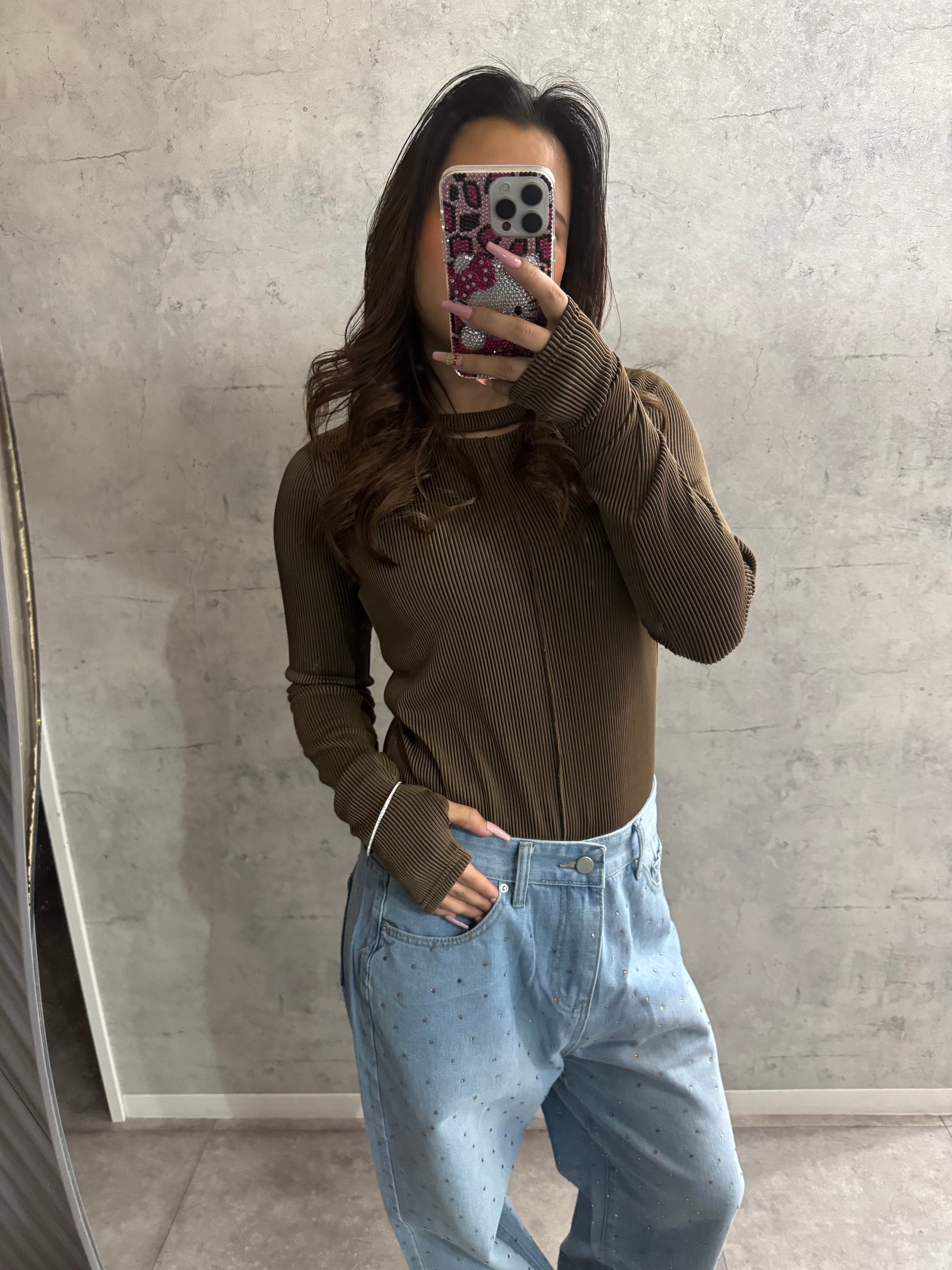 ロングスリーブにサムホールのデザインを加える事で、腕をより長く細く見せてくれます。