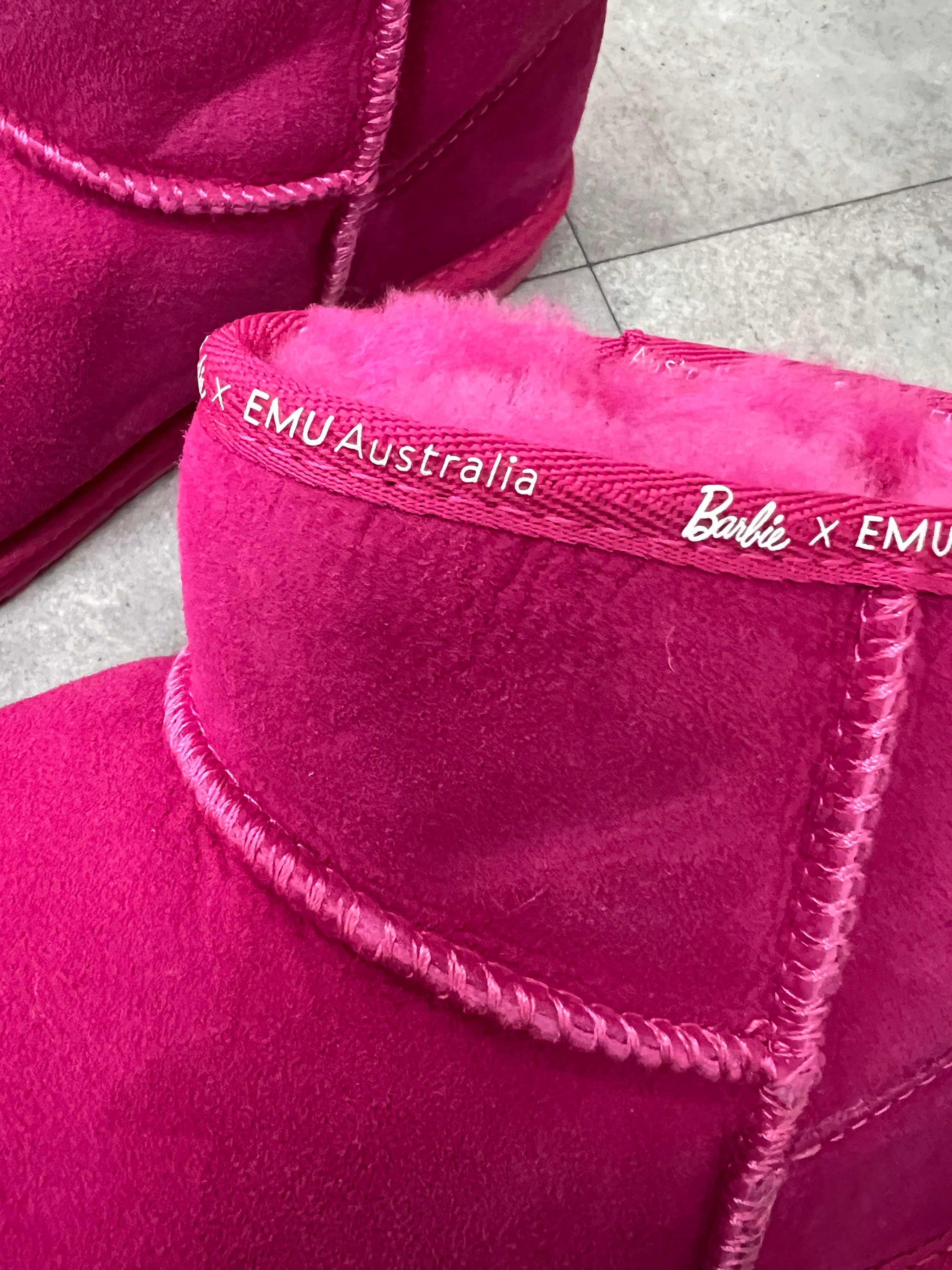 バービー ドリームハウス™️ 60 周年を記念したコラボアイテム、EMU Australia限定バービー™️ スティンガー マイクロ。バービープリントのバインディングに象徴的なピンクを注入して、外観を完成させます。