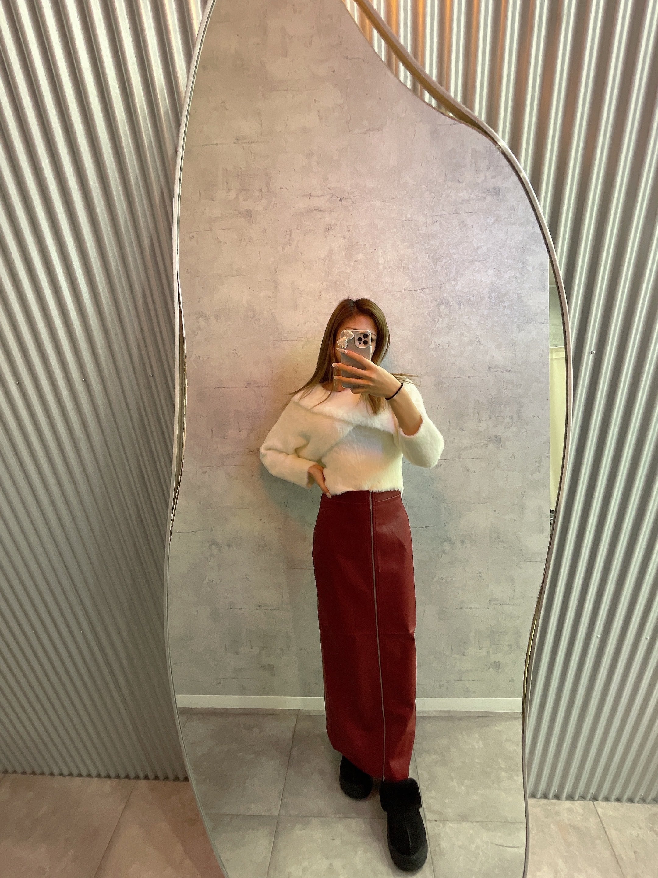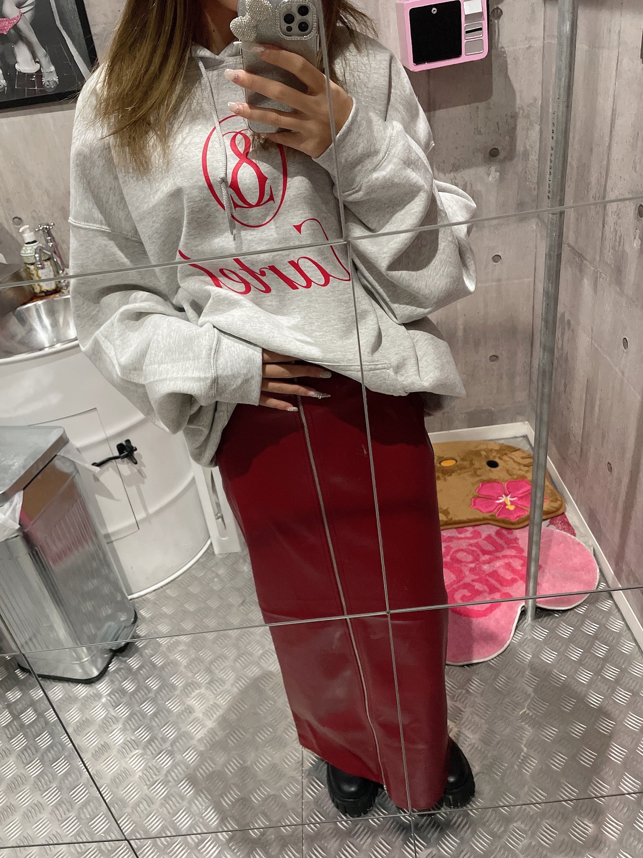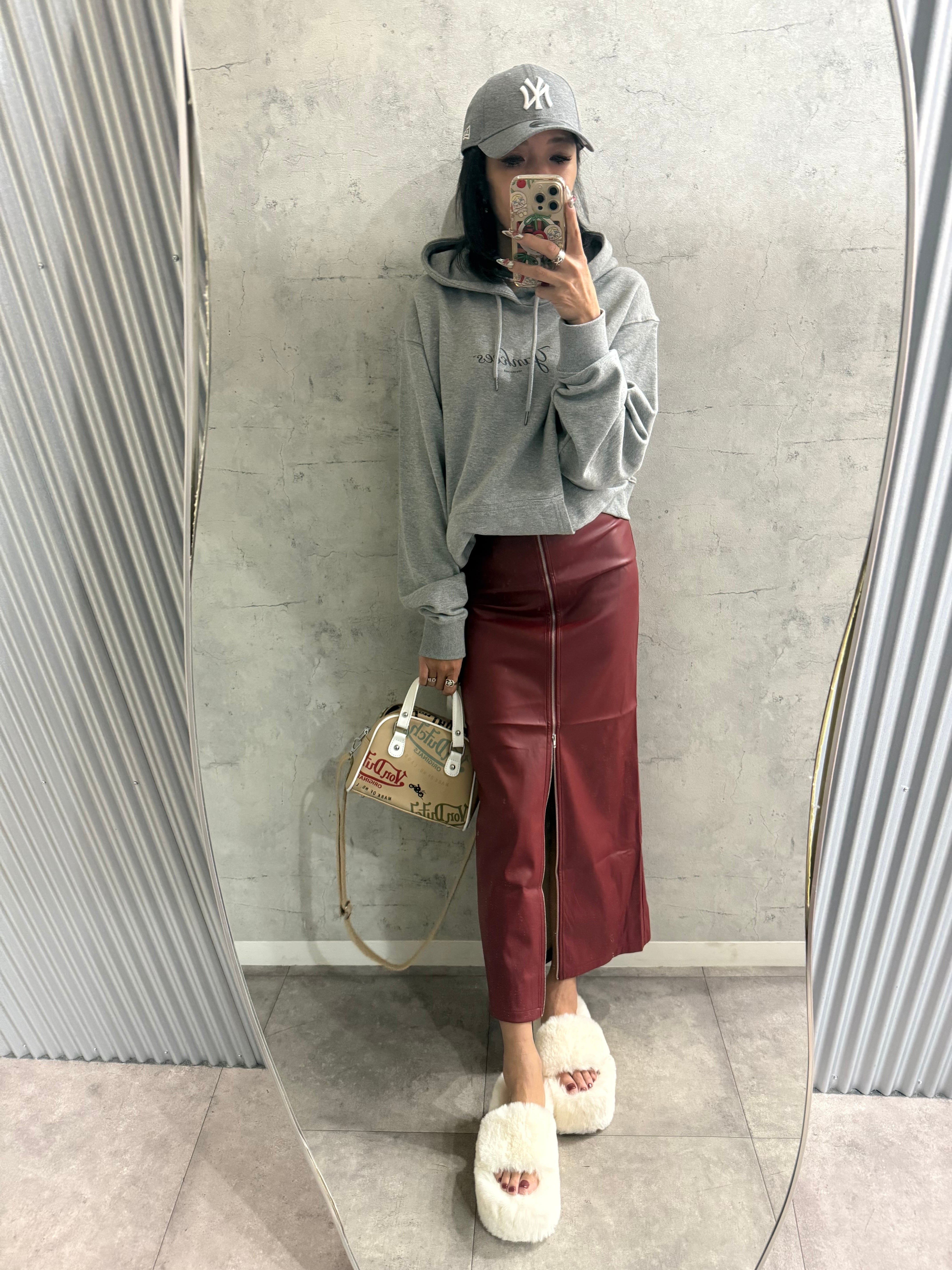 人気のフロントジップスカートにフェイクレザーが登場!スタイルがきれいに見えるストレートシルエットはどんなトップスとも相性◎ジップの開け具合でスリット丈を調整していただけます